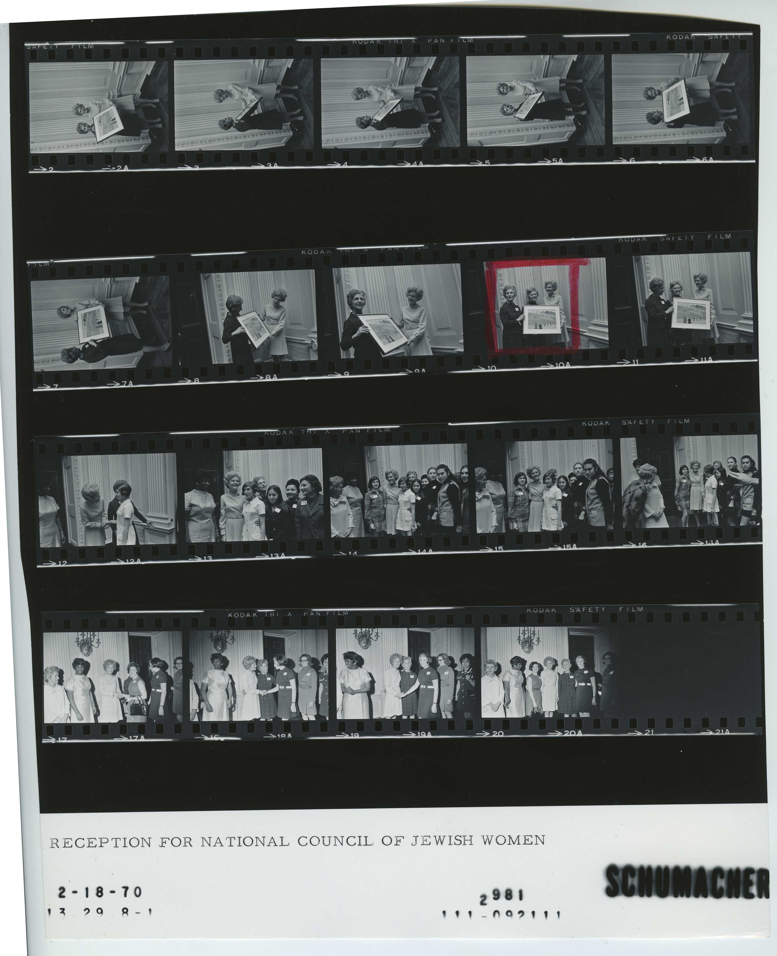 - Frame(s): WHPO-2981-12A-20A, Pat Nixon meeing women in a receiving line at a reception for the National Council of Jewish Women. 2/18/1970, Washington, D.C. White House. Pat Nixon, unidentified Jewish Women National Council representatives.