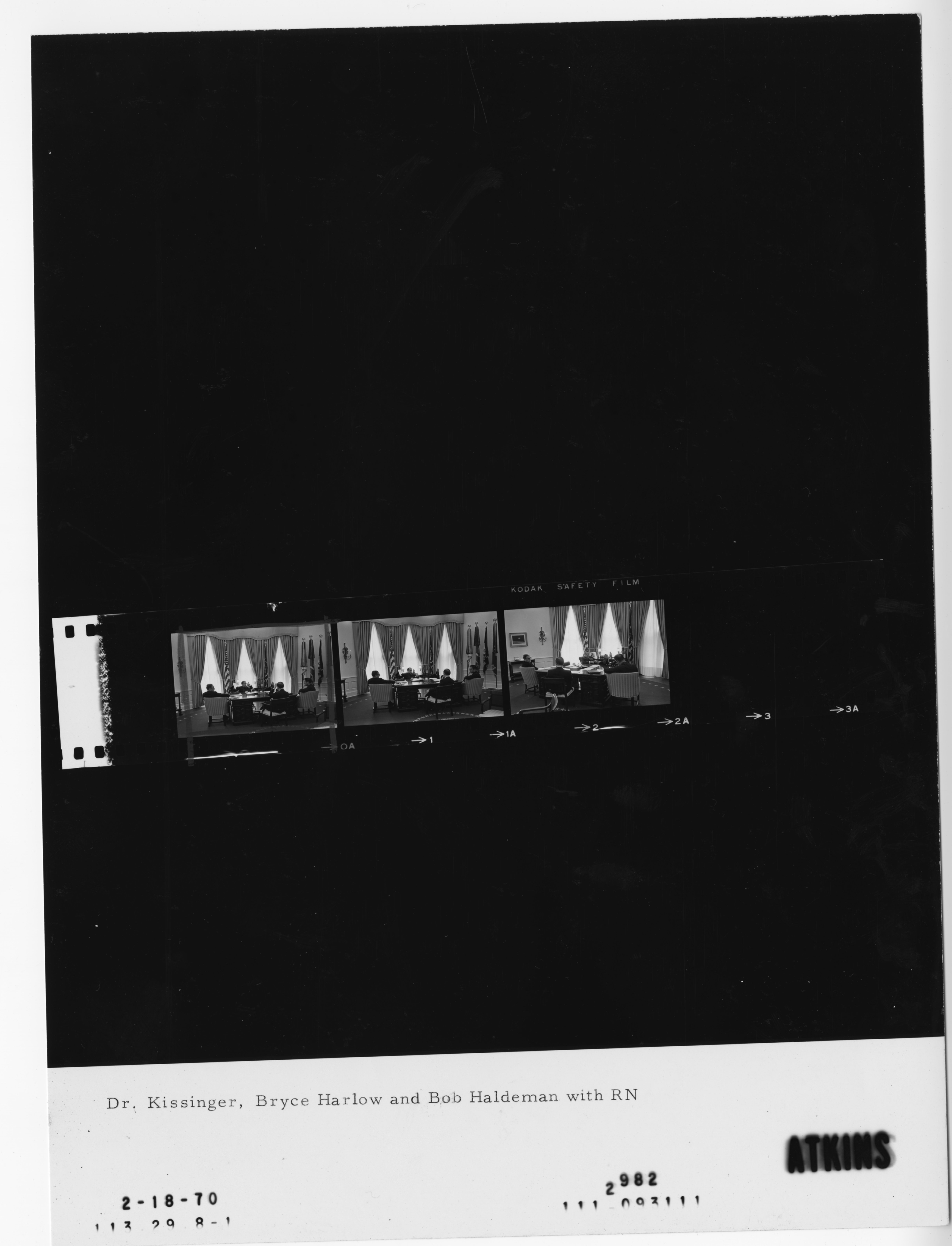- Frame(s): WHPO-2982-00, President Nixon sitting at his Oval Office desk during a meeting with Henry Kissinger, Bryce Harlow, and H.R Haldeman. 2/18/1970, Washington, D.C. White House Oval Office. President Nixon, Henry Kissinger, Bryce Harlow, H.R. Haldeman.