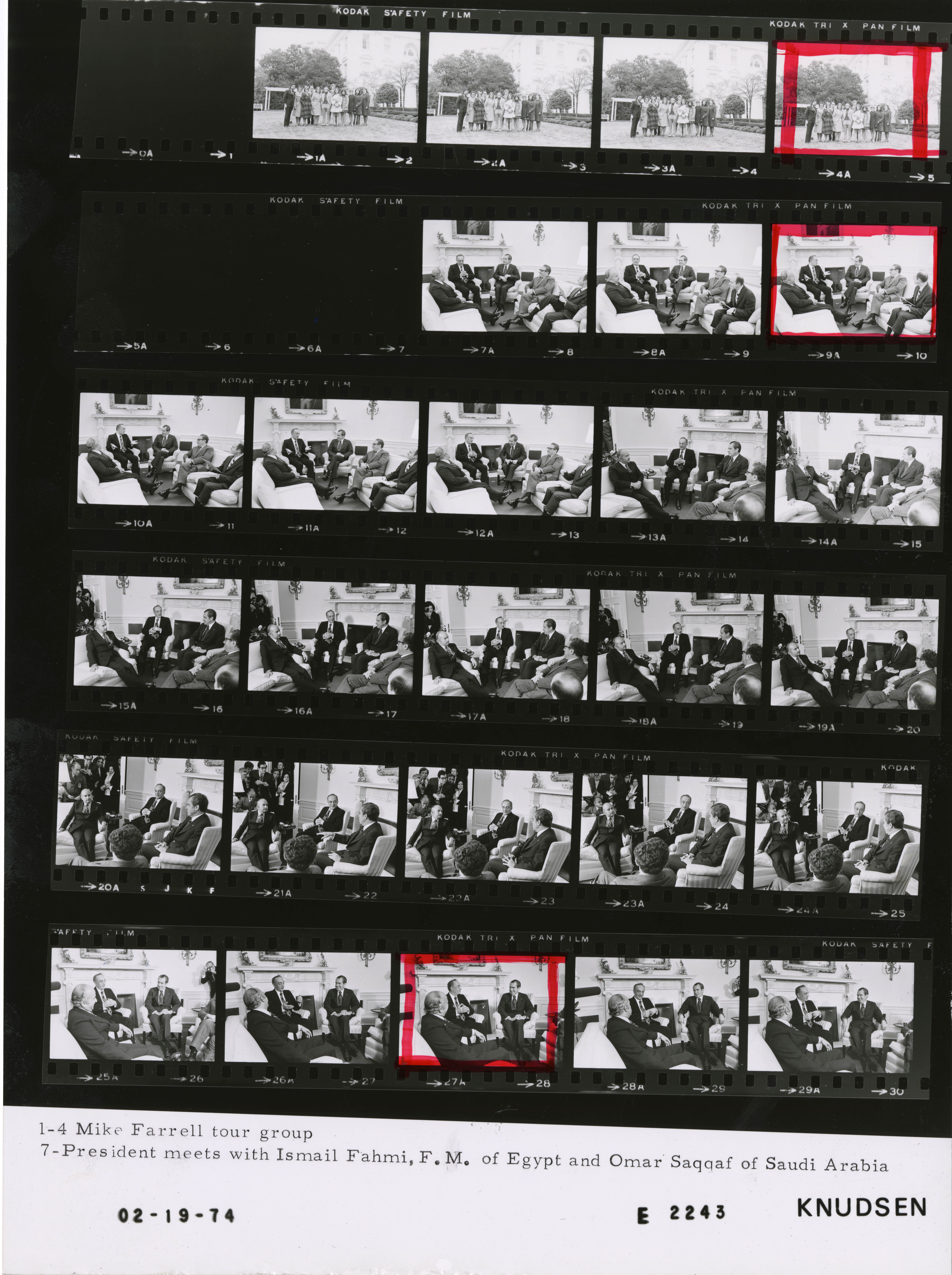 - Frame(s): WHPO-E2243-09A, President Nixon seated informally in the Oval Office during a meeting regarding oil resources with Ismail Fahmi, Foreign Affairs Minister of Arab Republic of Egypt; Omar Saqqaf, Foreign Affairs Minister of Saudi Arabia; Secretary of State Henry Kissinger; and Maj. Gen. Brent Scowcroft. 2/19/1974, Washington, D.C. White House, Oval Office. President Nixon, Ismail Fahmi, Omar Saqqaf, Henry Kissinger, Maj. Gen. Brent Scowcroft.
