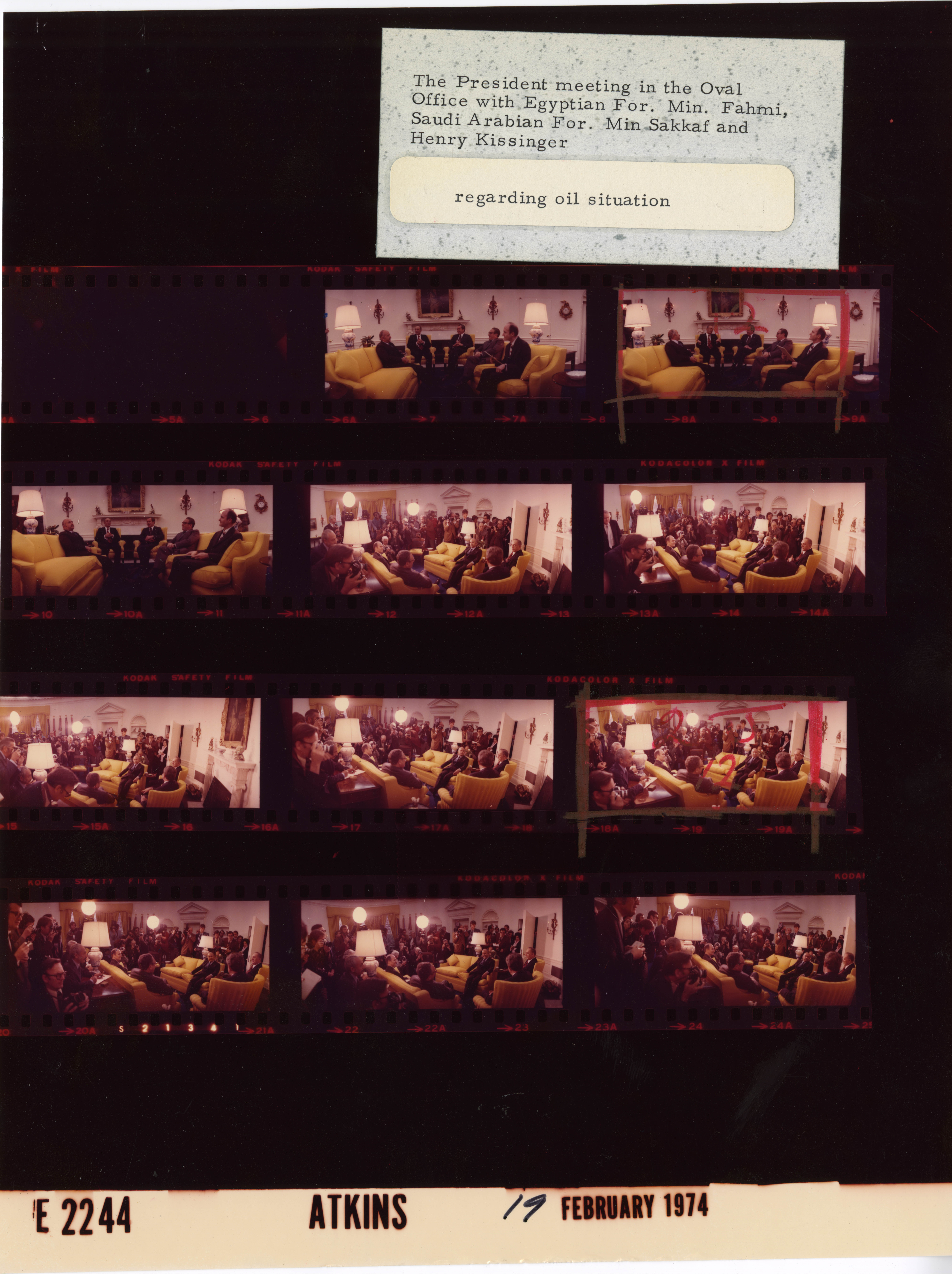 - Frame(s): WHPO-E2242-00A-22A, President Nixon seated informally in the Oval Office during a meeting regarding oil resources with Ismail Fahmi, Foreign Affairs Minister of Arab Republic of Egypt and Omar Saqqaf, Foreign Affairs Minister of Saudi Arabia, Secretary of State Henry Kissinger and Maj. Gen. Brent Scowcroft. 2/19/1974, Washington, D.C. White House, Oval Office. President Nixon, Henry Kissinger, Ismail Fahmi.