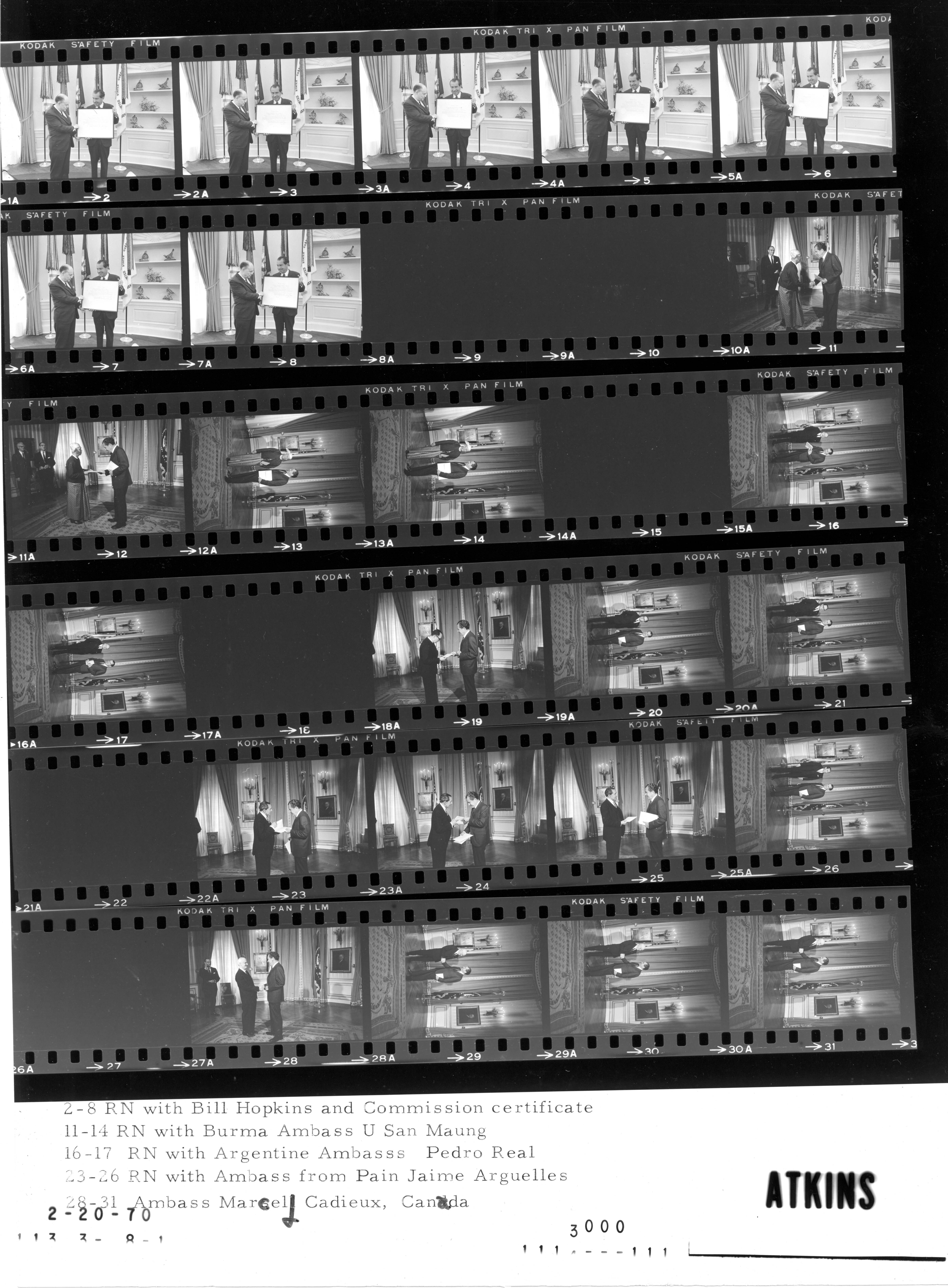 - Frame(s): WHPO-3000-02-08, President Nixon standing in the Oval Office with Executive Assistant Bill Hopkins holding a Commission certificate. 2/20/1970, Washington, D.C. White House, Oval Office. President Nixon, William J. Hopkins.