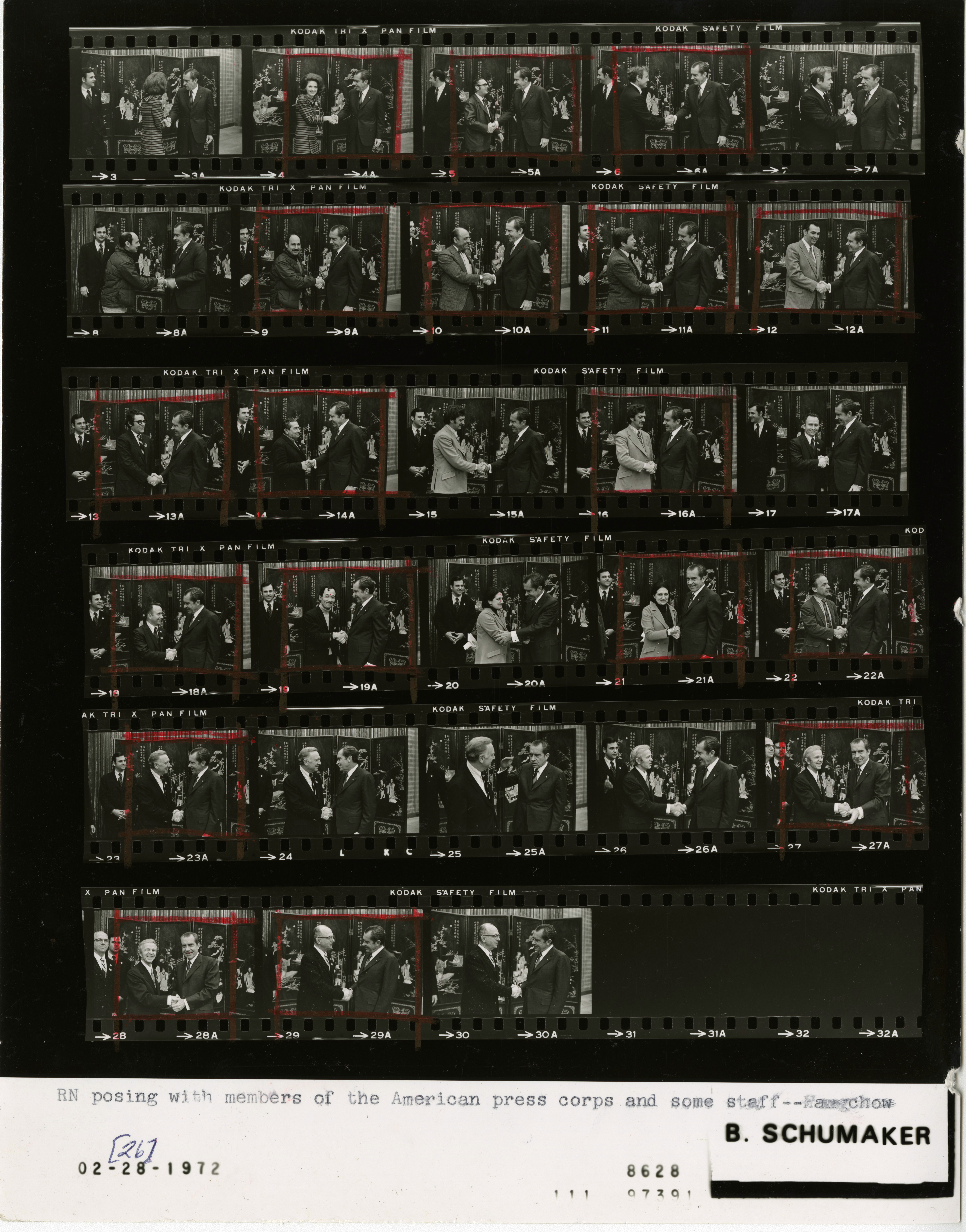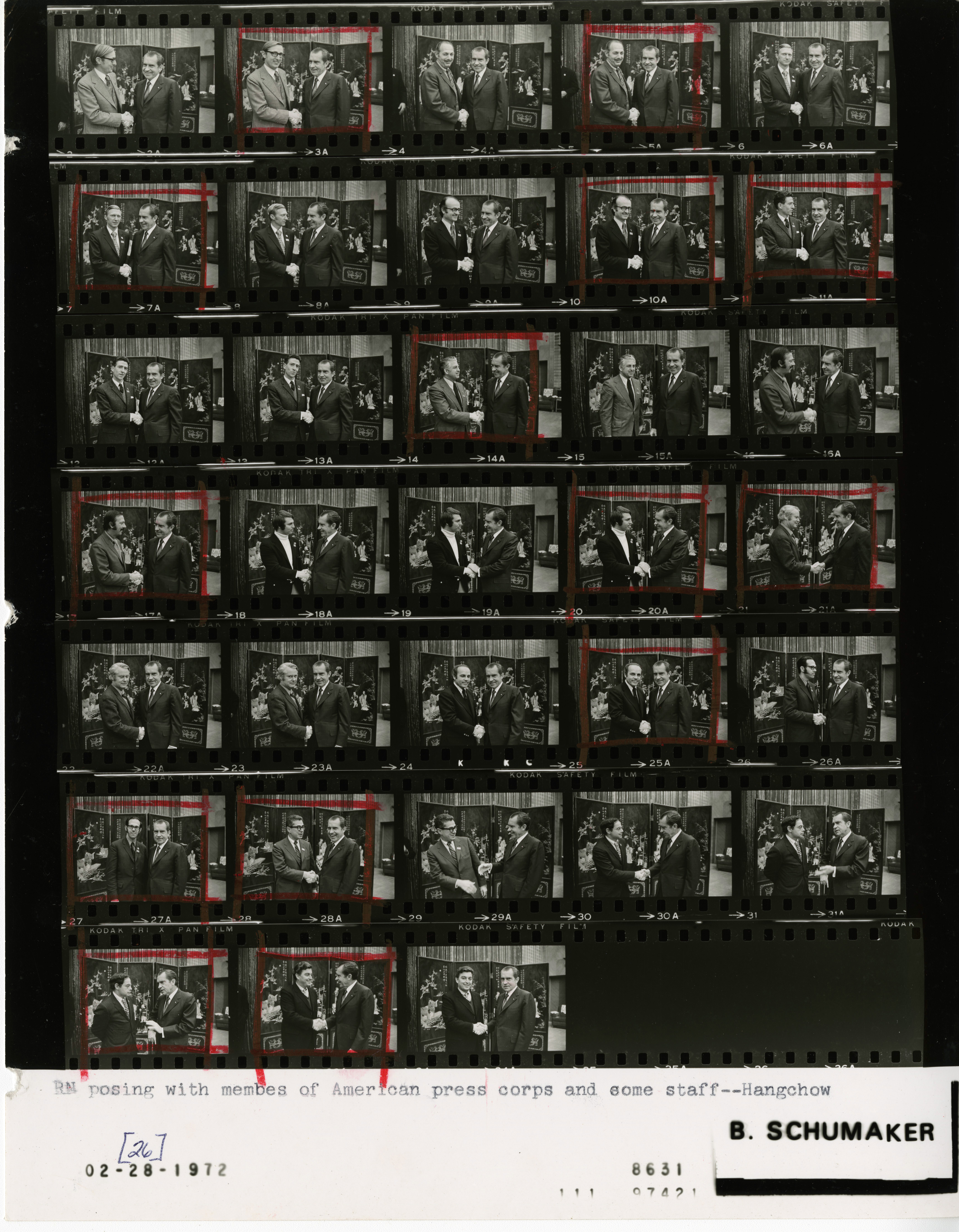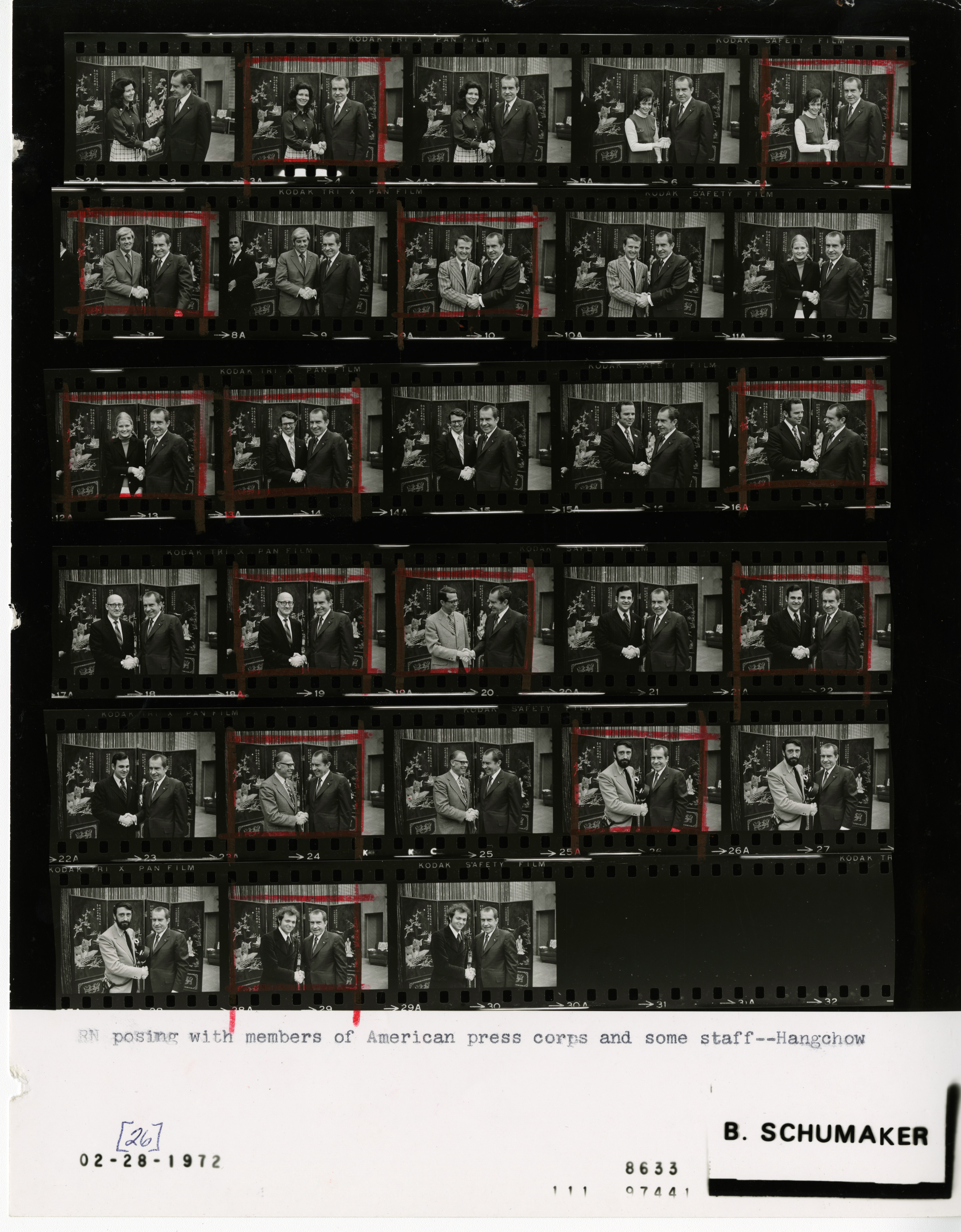 - Frame(s): WHPO-8631-02A-34A, President Nixon shaking hands individually with members of the American press corps and staff members. 2/26/1972, Hang-chou, China West Lake Guest House, room. President Nixon, press corps members, staff.