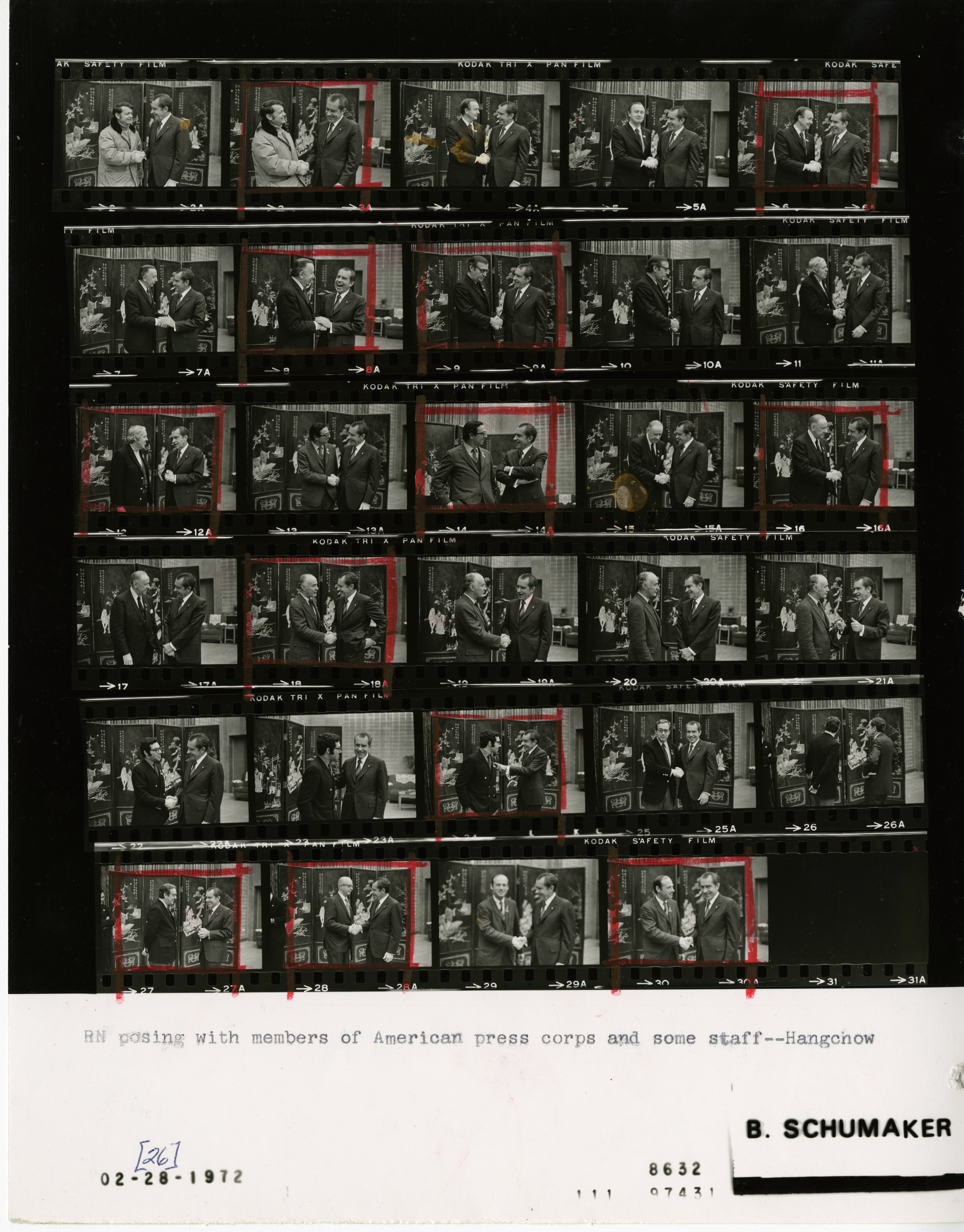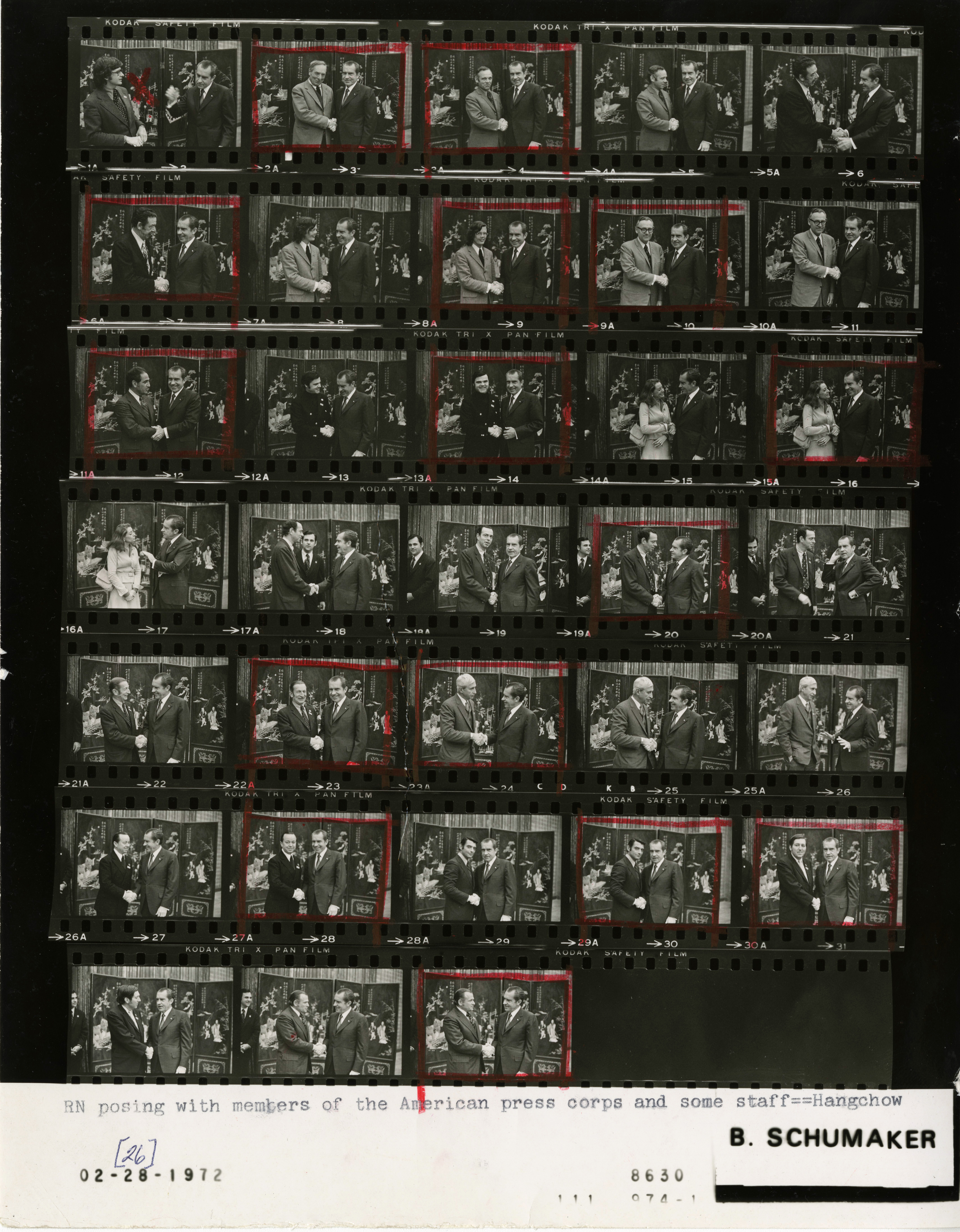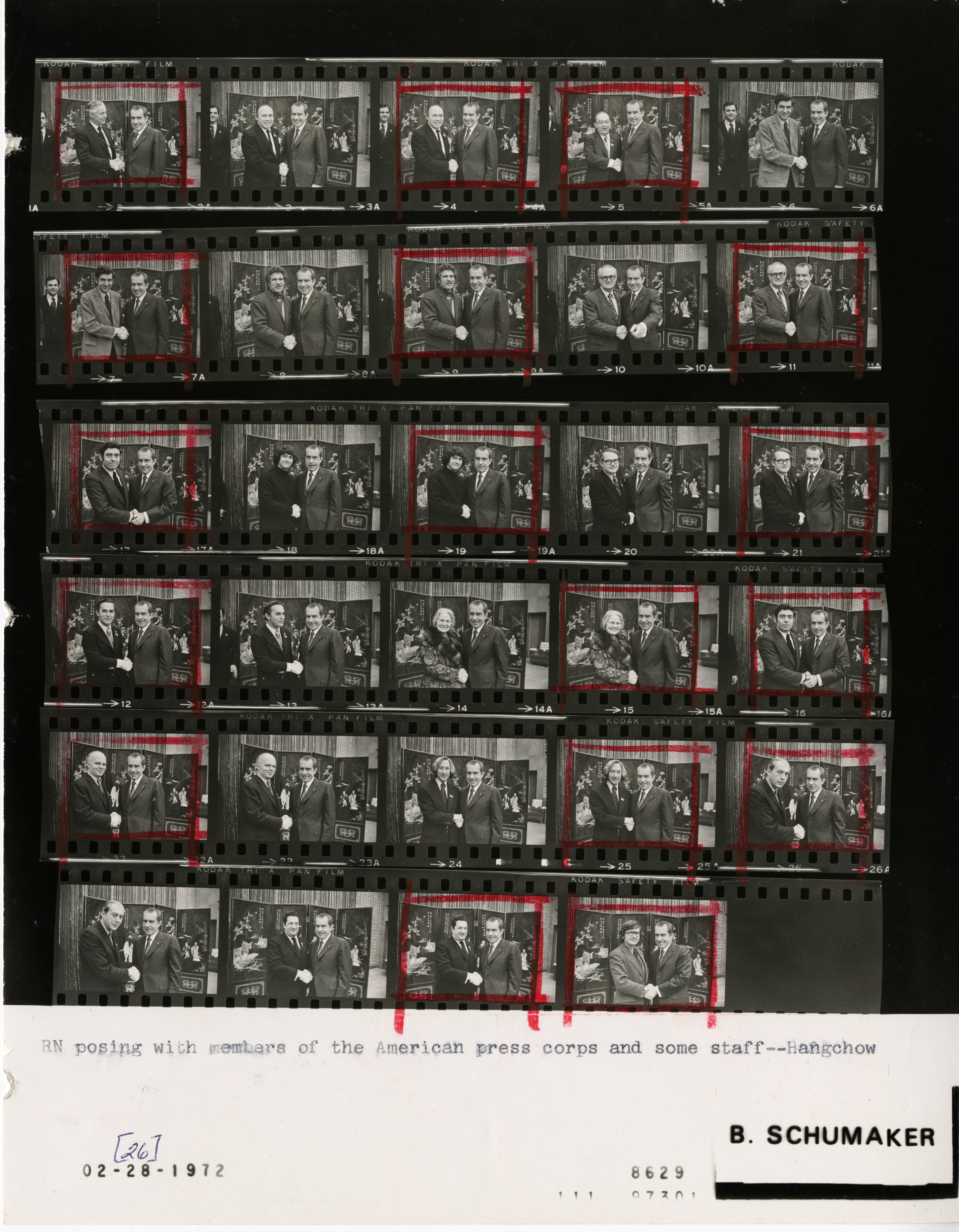 - Frame(s): WHPO-8631-02A-34A, President Nixon shaking hands individually with members of the American press corps and staff members. 2/26/1972, Hang-chou, China West Lake Guest House, room. President Nixon, press corps members, staff.