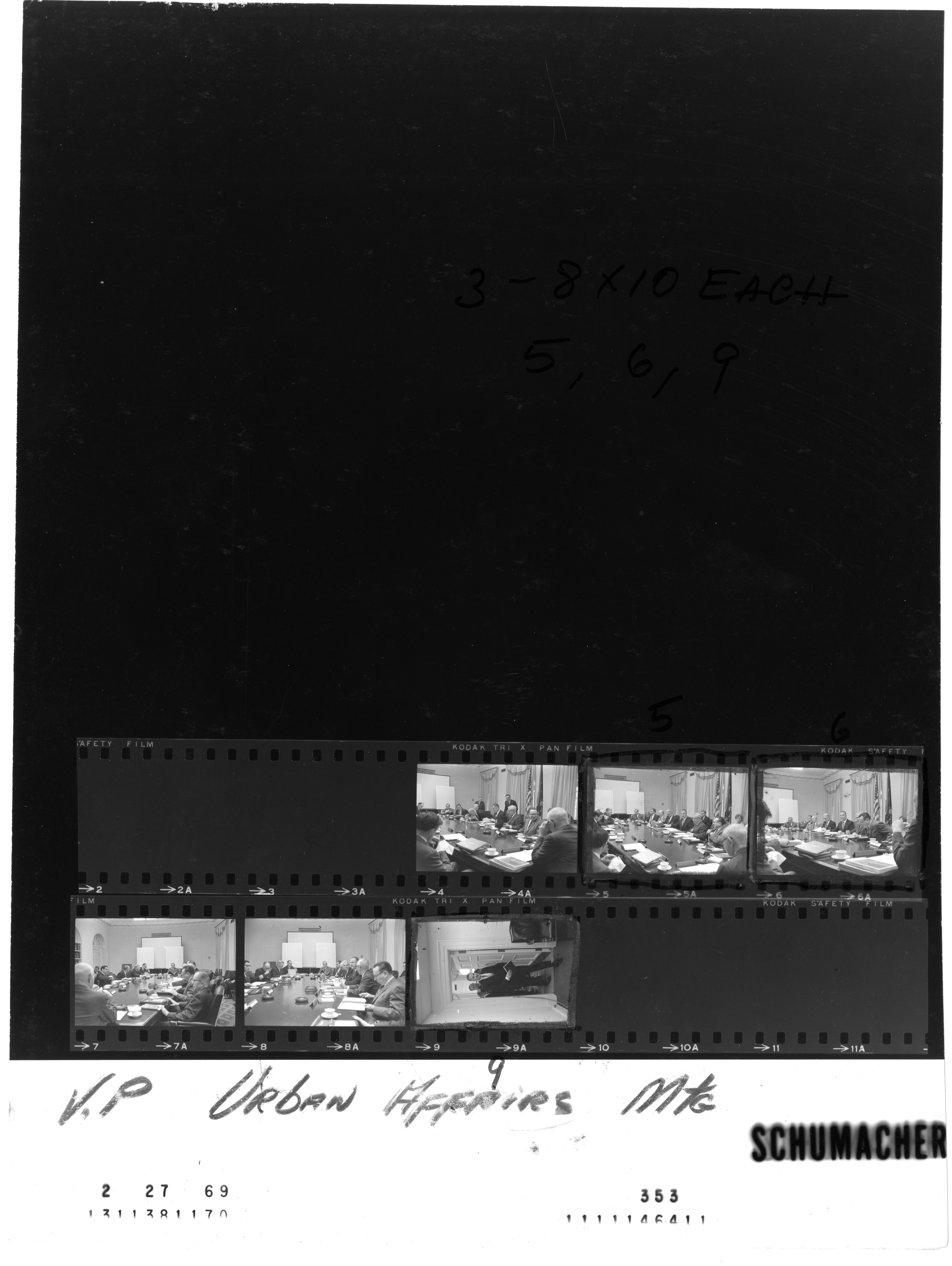 • Frame(s): WHPO-0353-04A-08A, Vice President Agnew attending a meeting of the Urban Affairs Council. 2/27/1969, Washington, D.C. White House, Cabinet Room. Spiro Agnew, Robert Finch, George Shultz, Robert Mayo, John Mitchell, Arthur Burns, John Volpe, Robert Finch, Spiro Agnew, Clifford Hardin, George Romney, Daniel Patrick Moynihan, Maurice Stans.