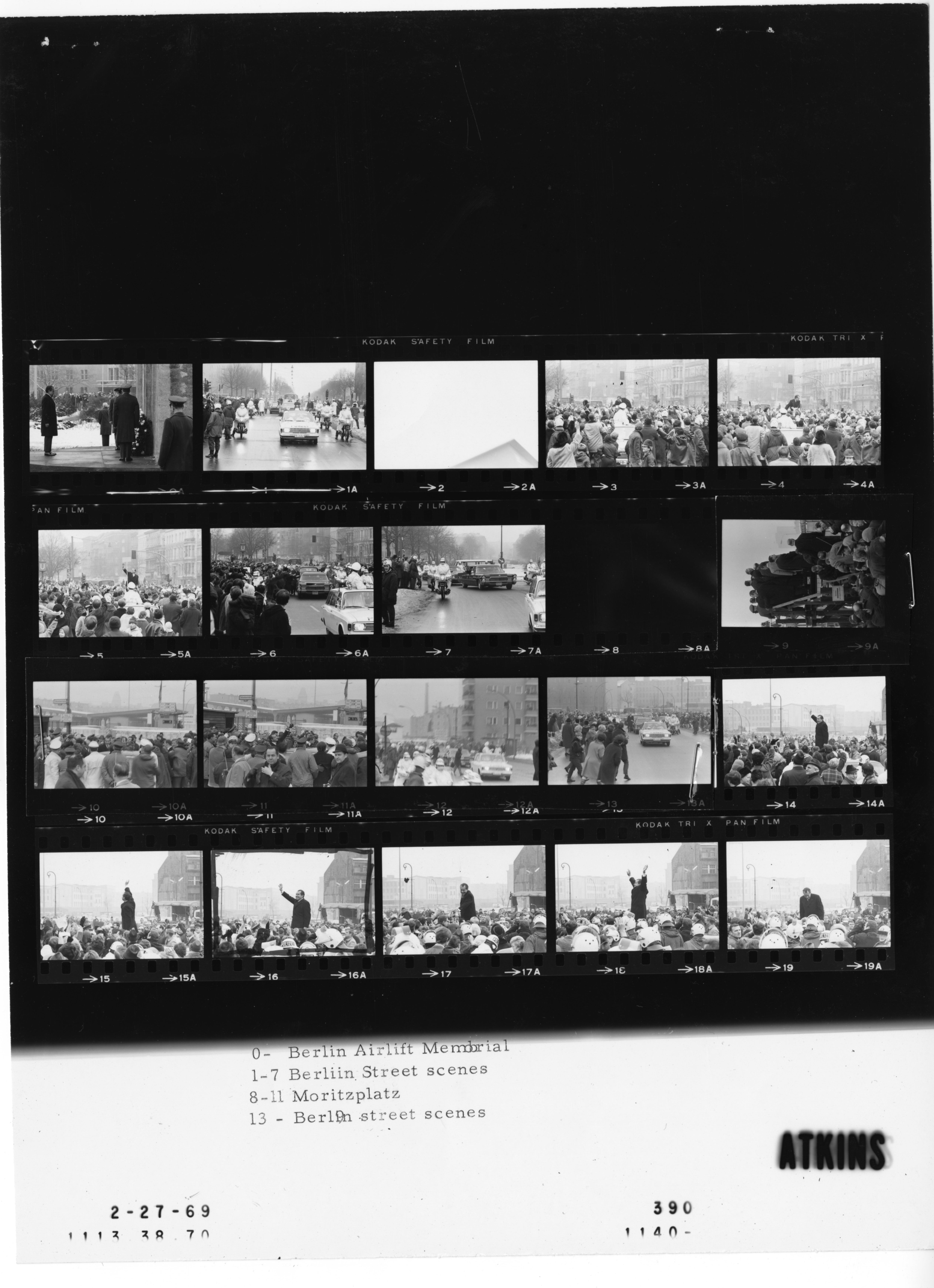 • Frame(s): WHPO-0388-25-33, Motorcade in the streets of Berlin. 2/27/1969, Berlin, West Germany Moritzplatz and city streets. President Nixon, Kurt Kiesinger, Willy Brandt, unidentified officials, crowd.