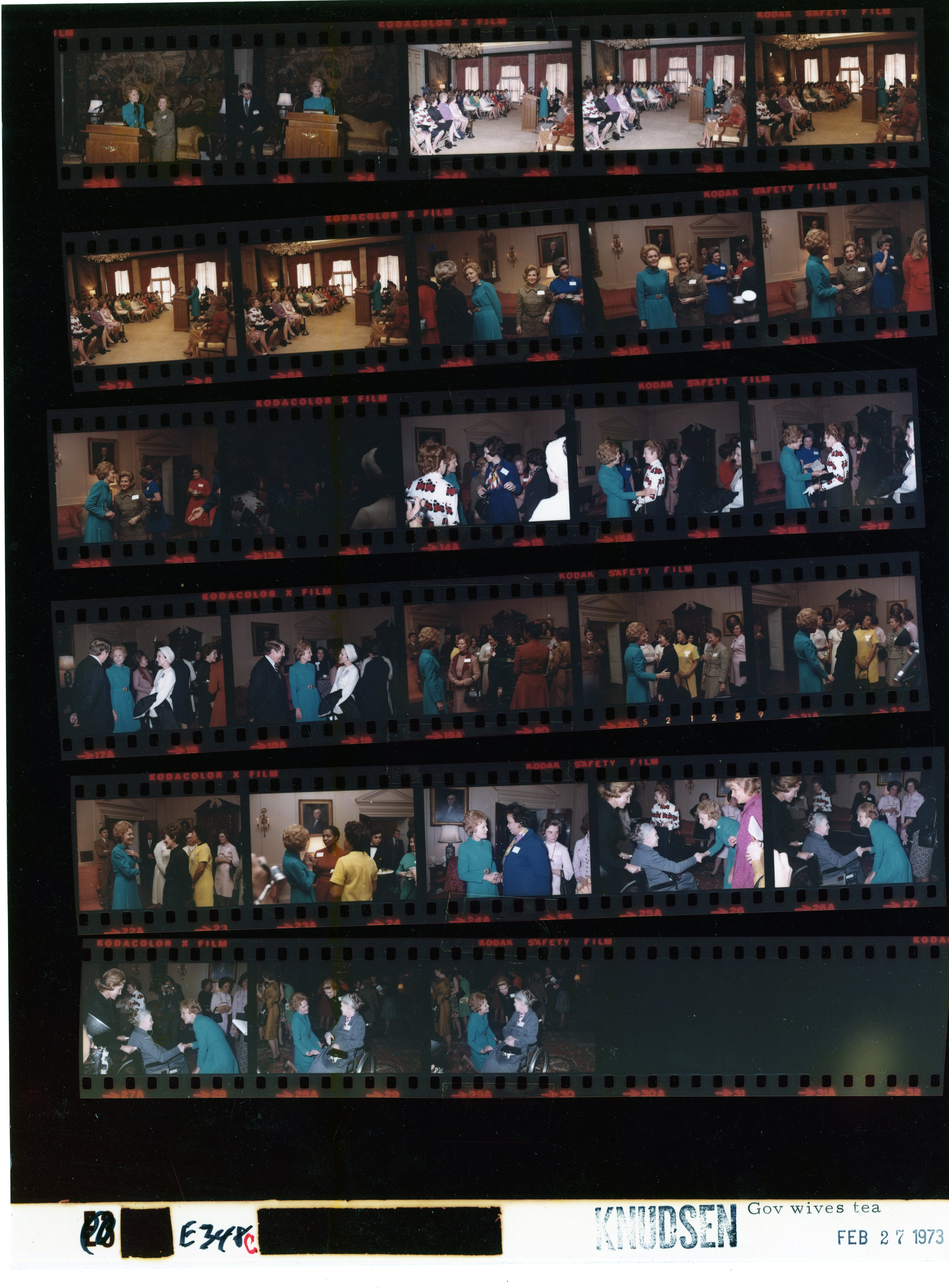 - Frame(s): WHPO-E0348-, Pat Nixon speaking from a podium and greeting women at a tea for governors' wives. 2/27/1973, Washington, D.C. unknown. Pat Nixon, governors' wives.