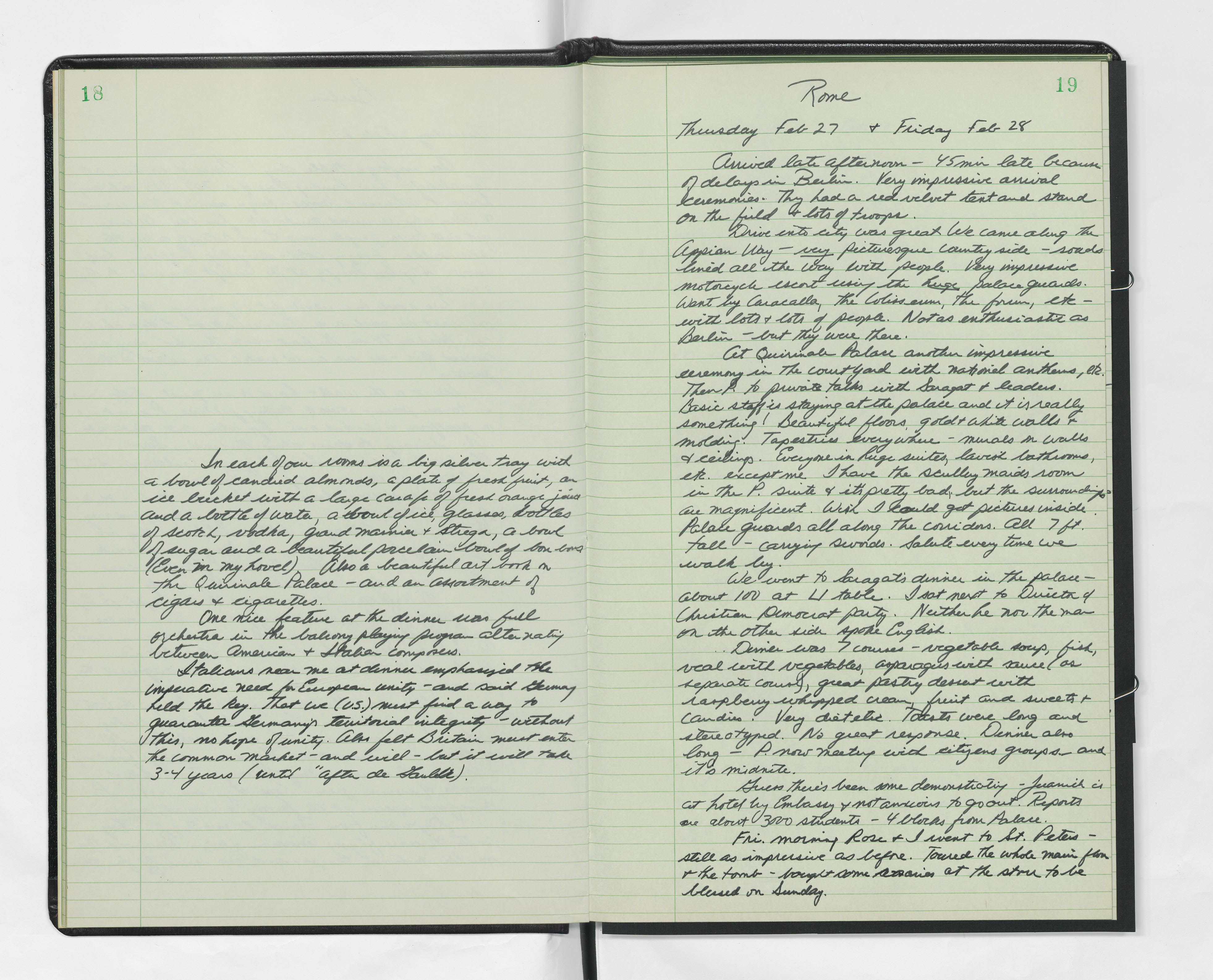 Italians near me at dinner emphasized the imperative need for European unity, and said Germany held the key. That we (United States) must find a way to guarantee Germany's territorial integrity - without this, no hope of unity. Also felt Britain must enter the common market - and will - but it will take three to four years (until "after de Gaulle"). - Handwritten diary entry (February 27-February 28) (JPG)