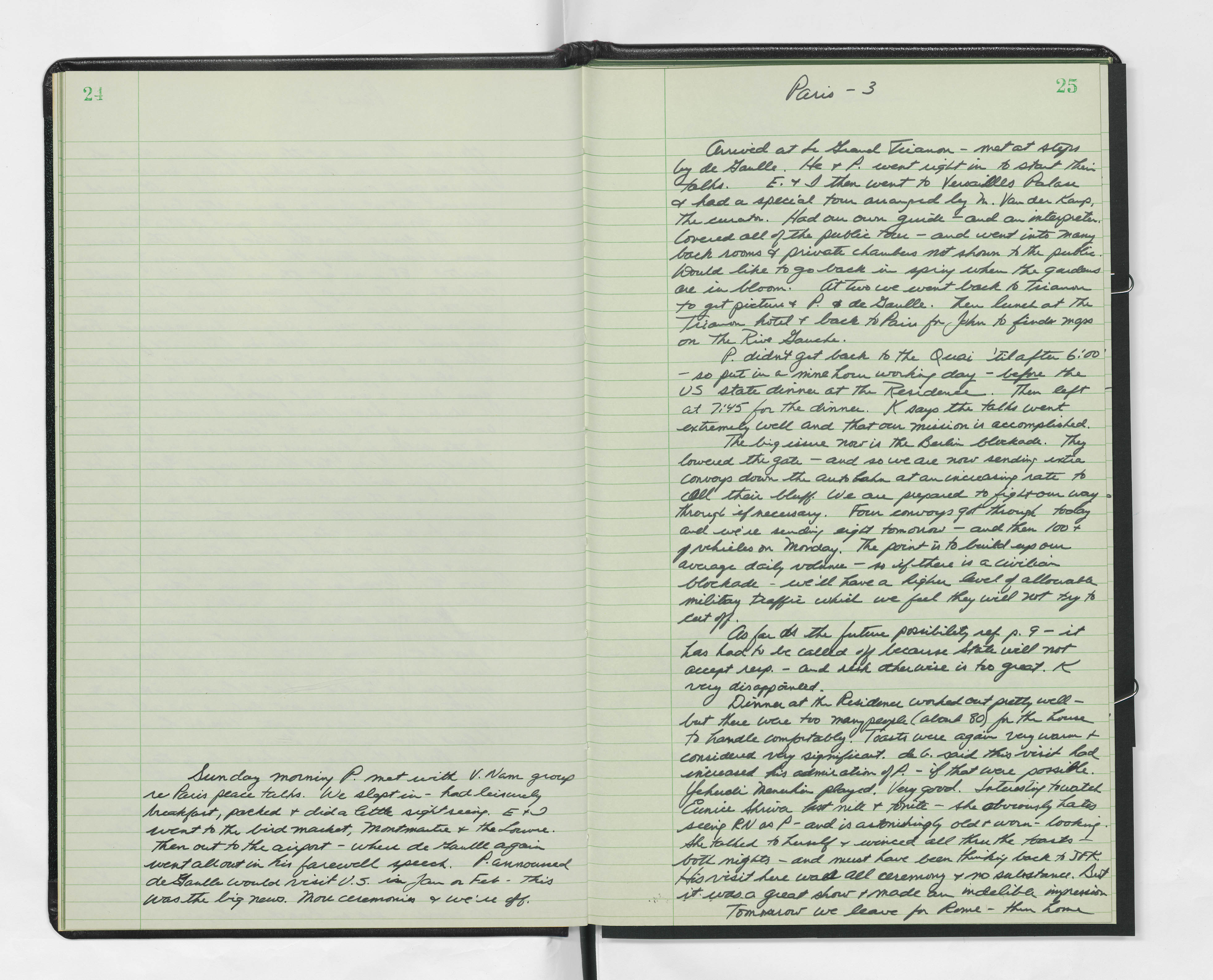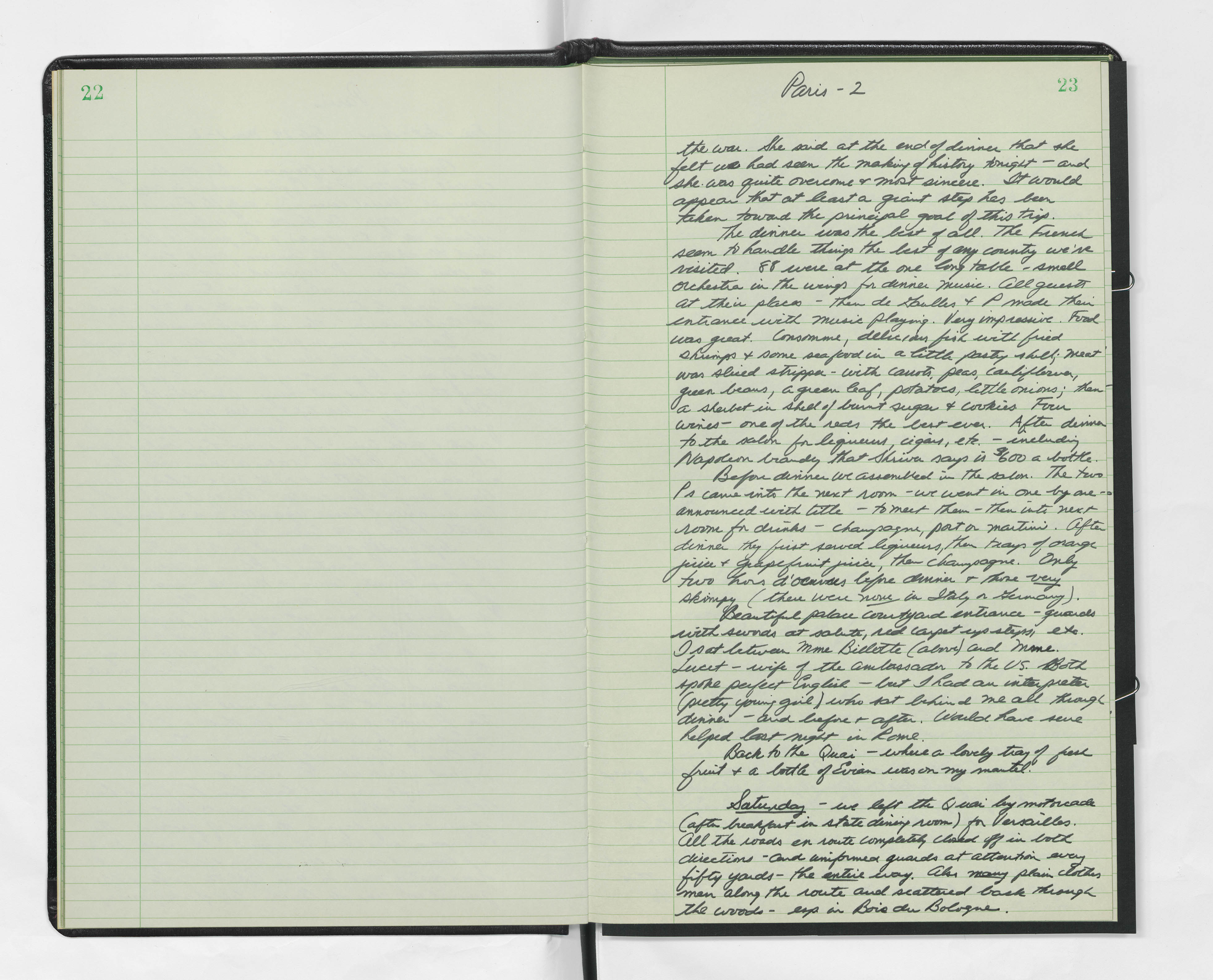 On drive in from airport, many police, as everywhere all roads completely cleared in both directions - kind of eerie. Huge motorcycle escort. A few people along the way, but not many. Went directly to Quai d'Orsay, beautiful palace and lovely quarters. I have a corner room - blue cloth walls, white and gold trim, huge room, high ceilings, great chandelier. Bathroom is also a corner with huge windows. Big bath tub with rack holding sponge, Chanel soap, and thermometer. Really luxurious living. Also an array of French cigarettes and a beautiful leather holder with Cuban cigars.