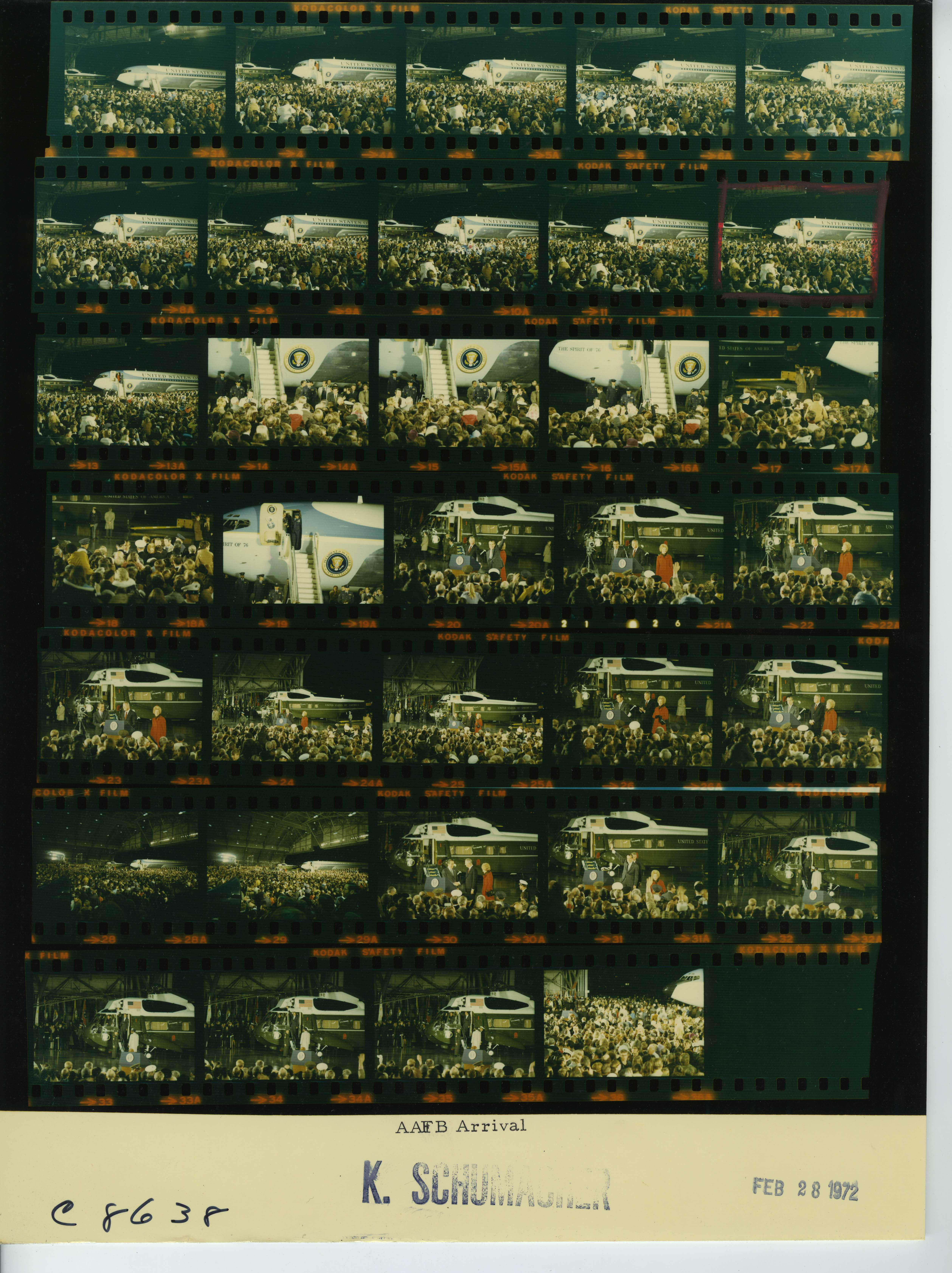 - Frame(s): WHPO-8643-13-24, President Nixon and Pat Nixon greeting crowd. 2/28/1972, Andrews AFB, Maryland tarmac, hangar, airport. President Nixon, Pat Nixon, Spiro Agnew, officials, presidential party, crowd.