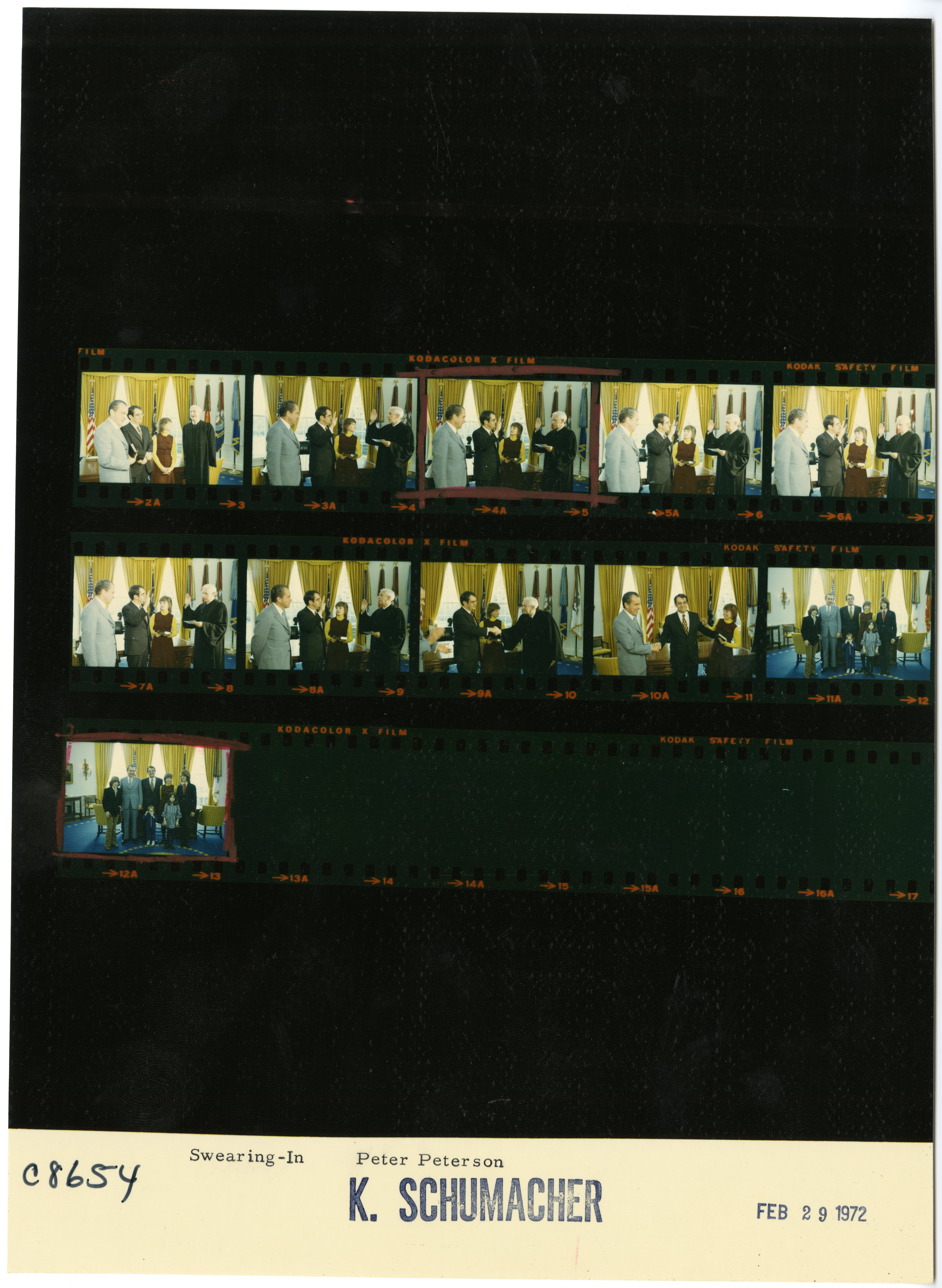 - Frame(s): WHPO-8655-2A-9A, Swearing-in ceremony of Peter Peterson as Secretary of Commerce. 2/29/1972, Washington, D.C. White House, Oval Office. President Nixon, Peter Peterson, Sally Hornbogen Peterson, Peterson children, Gerald Reilly.