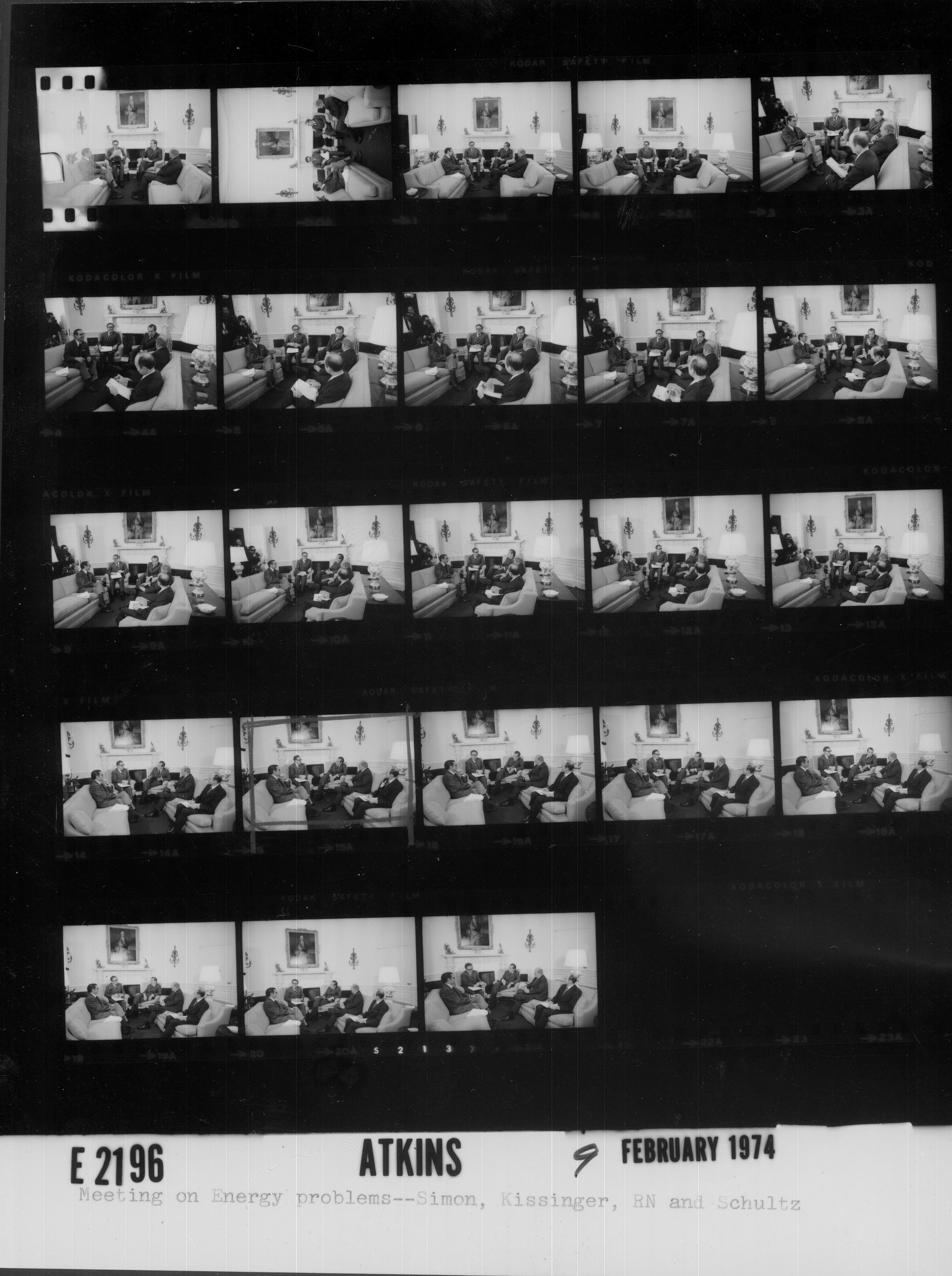 - Frame(s): WHPO-E2196-15A, President Nixon seated informally in the Oval Office during a meeting to discuss preparations and prospects for the Washington Energy Conference with Henry Kissinger, George Shultz, William Simon, and Major General Brent Scowcroft. 2/9/1974, Washington, D.C. White House, Oval Office. President Nixon, Henry A. Kissinger, George P. Shultz, William E. Simon, and Major General Brent G. Scowcroft.