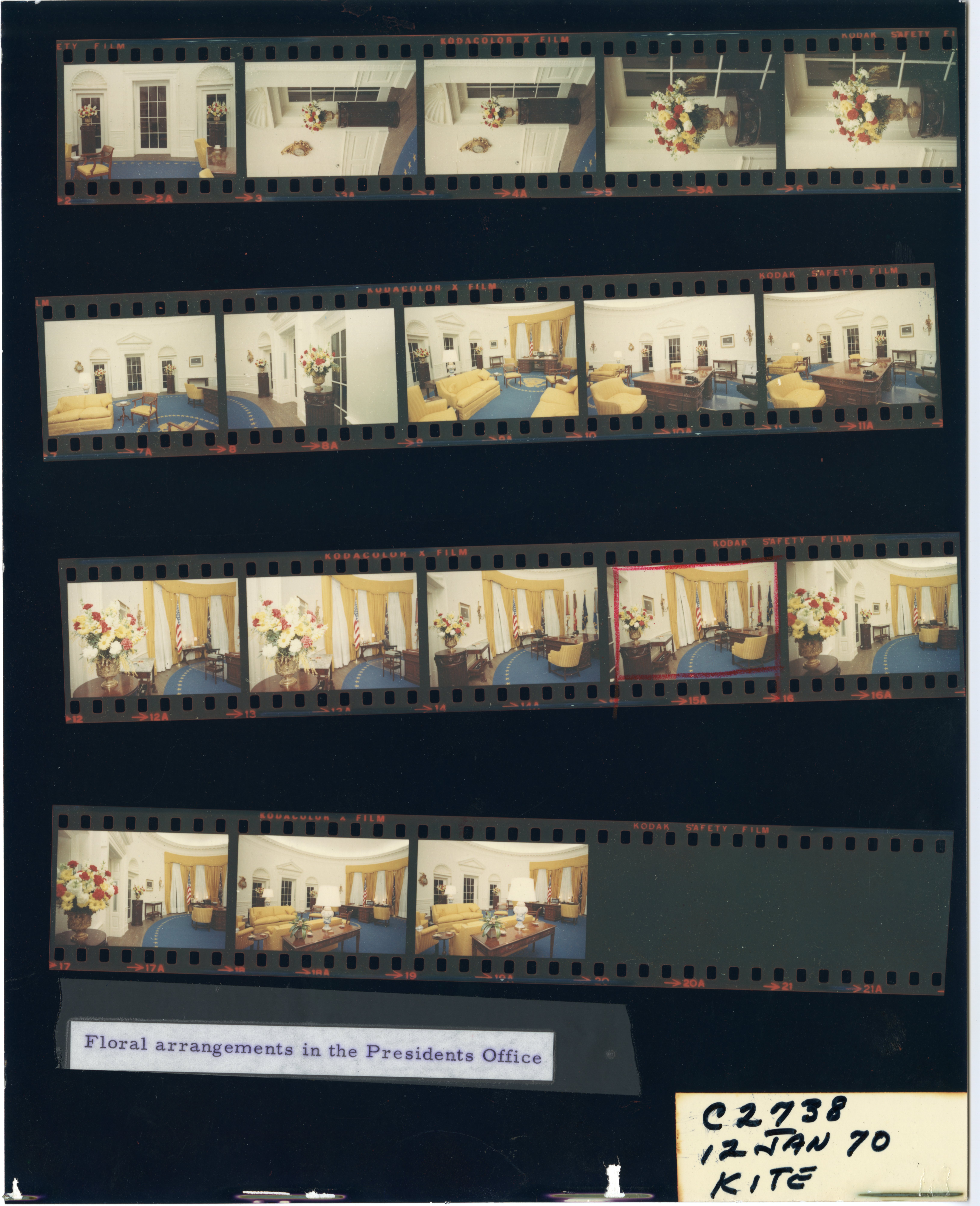 - Frame(s): WHPO-2738-, The Oval Office, and various floral arrangements on walls, or on furniture in it. 1/12/1970, Washington, D.C. White House, oval office. none.
