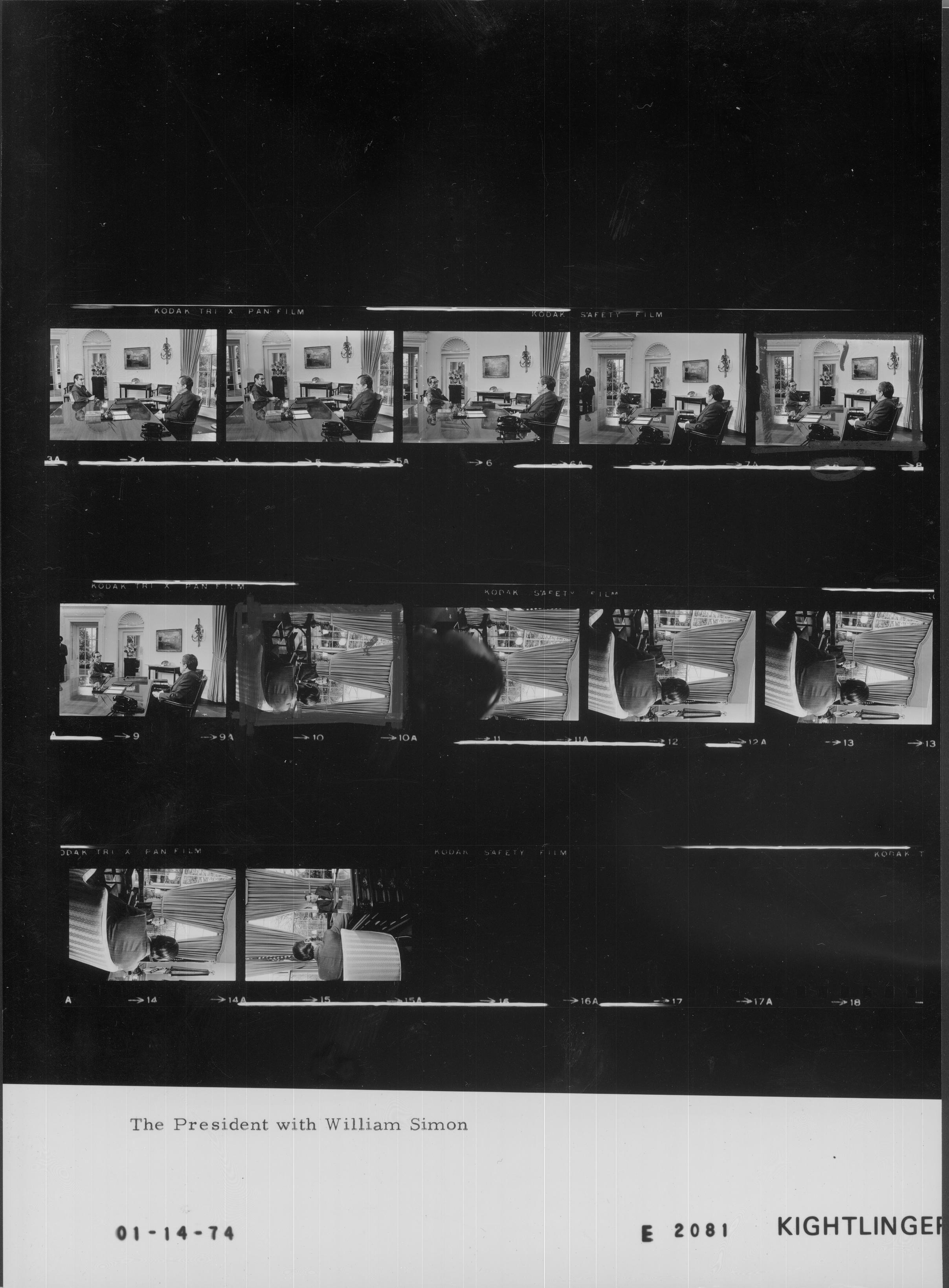 - Frame(s): WHPO-E2081-06-10, President Nixon seated in the Oval Office duirng a meeting with William Simon, Administrator of the Federal Energy Office and Deputy Secretary of the Treasury, to discuss the energy crisis. 1/14/1974, Washington, D.C. White House, Oval Office. President Nixon, William E. Simon.