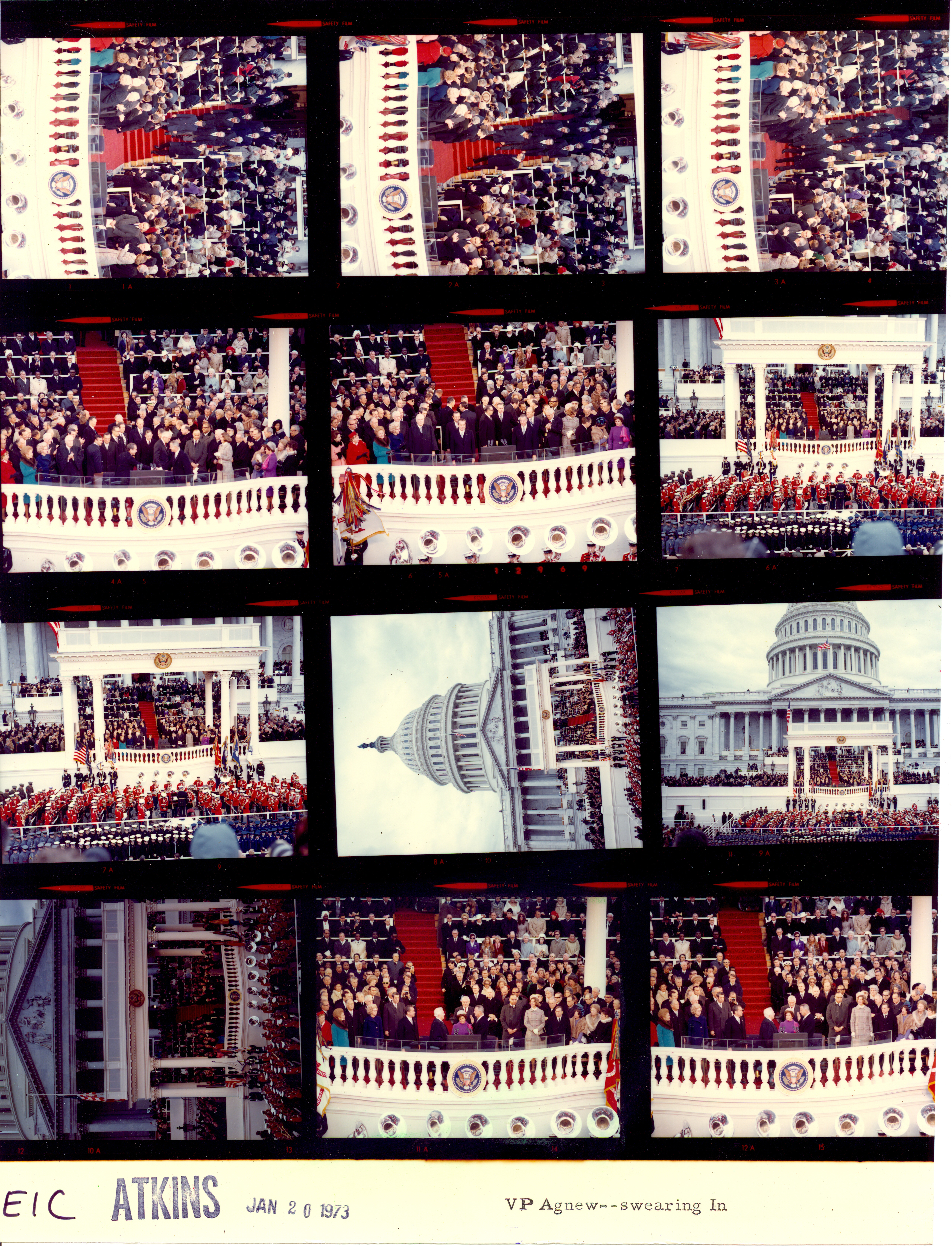 - Frame(s): WHPO-E0001-11A, Inaugural Ceremony. Vice President Agnew taking the oath of office. 1/20/1973, Washington, D.C. Inaugural Platform, Capitol. President Nixon, Pat Nixon, Spiro Agnew, Judy Agnew, Warren Burger, officials, guests.