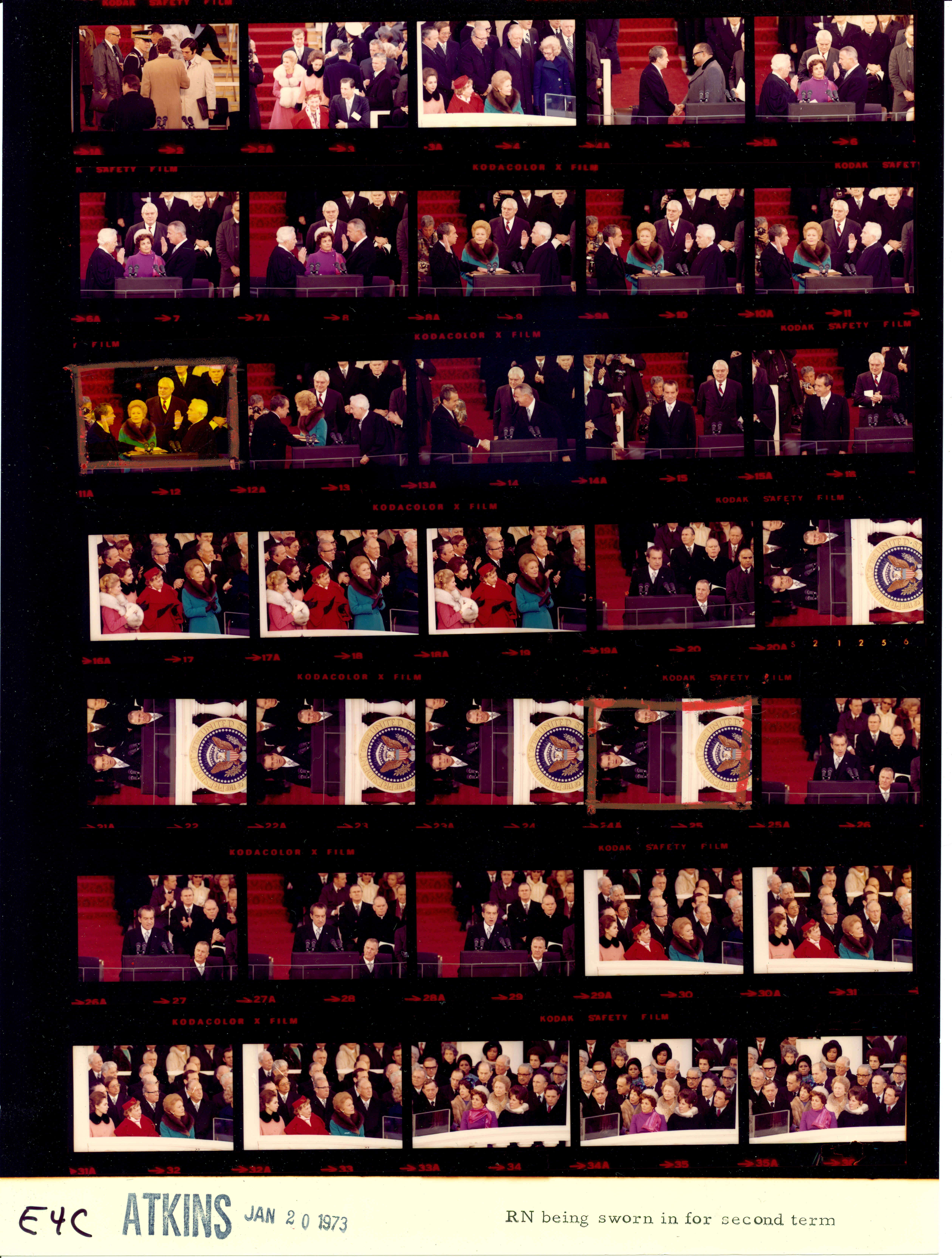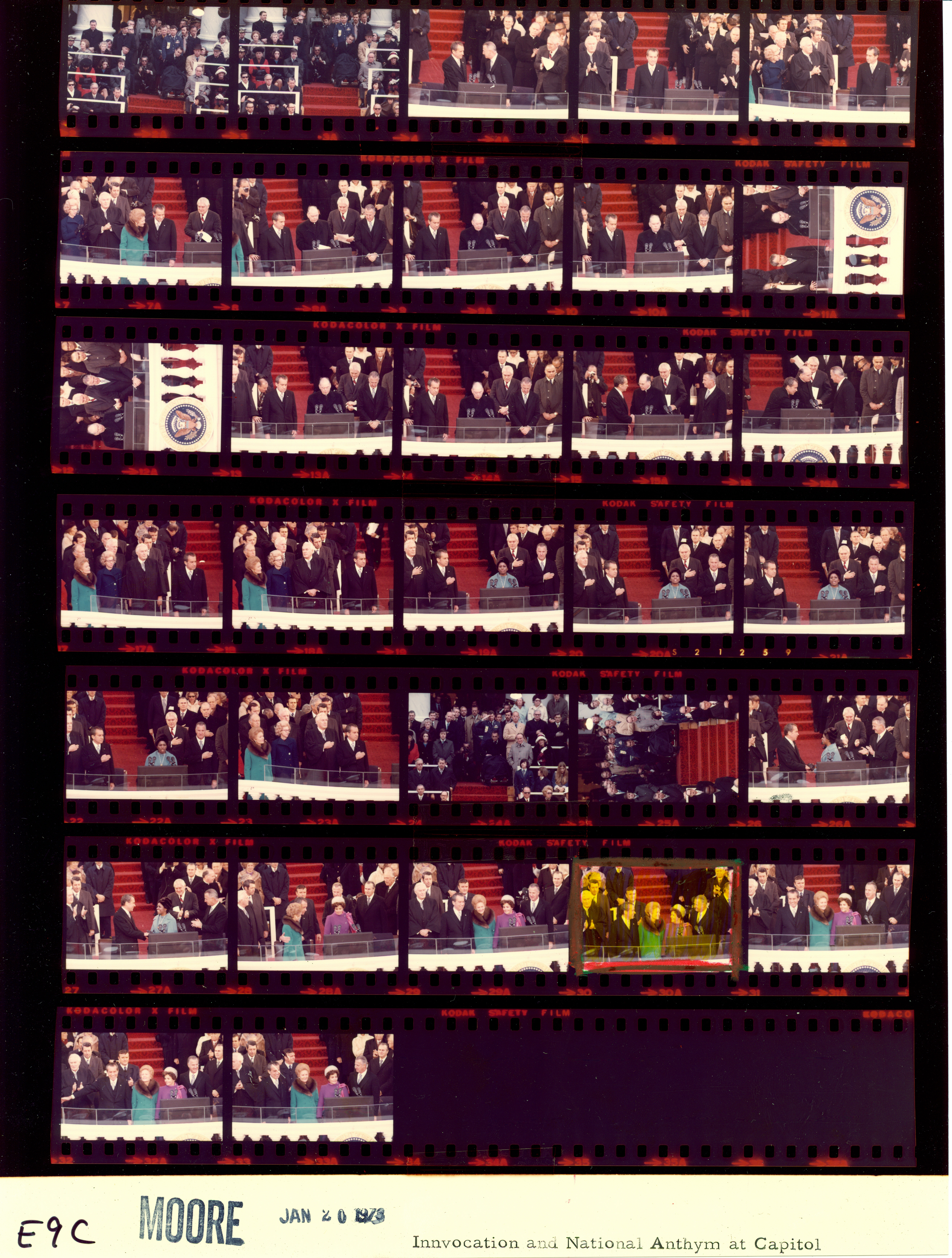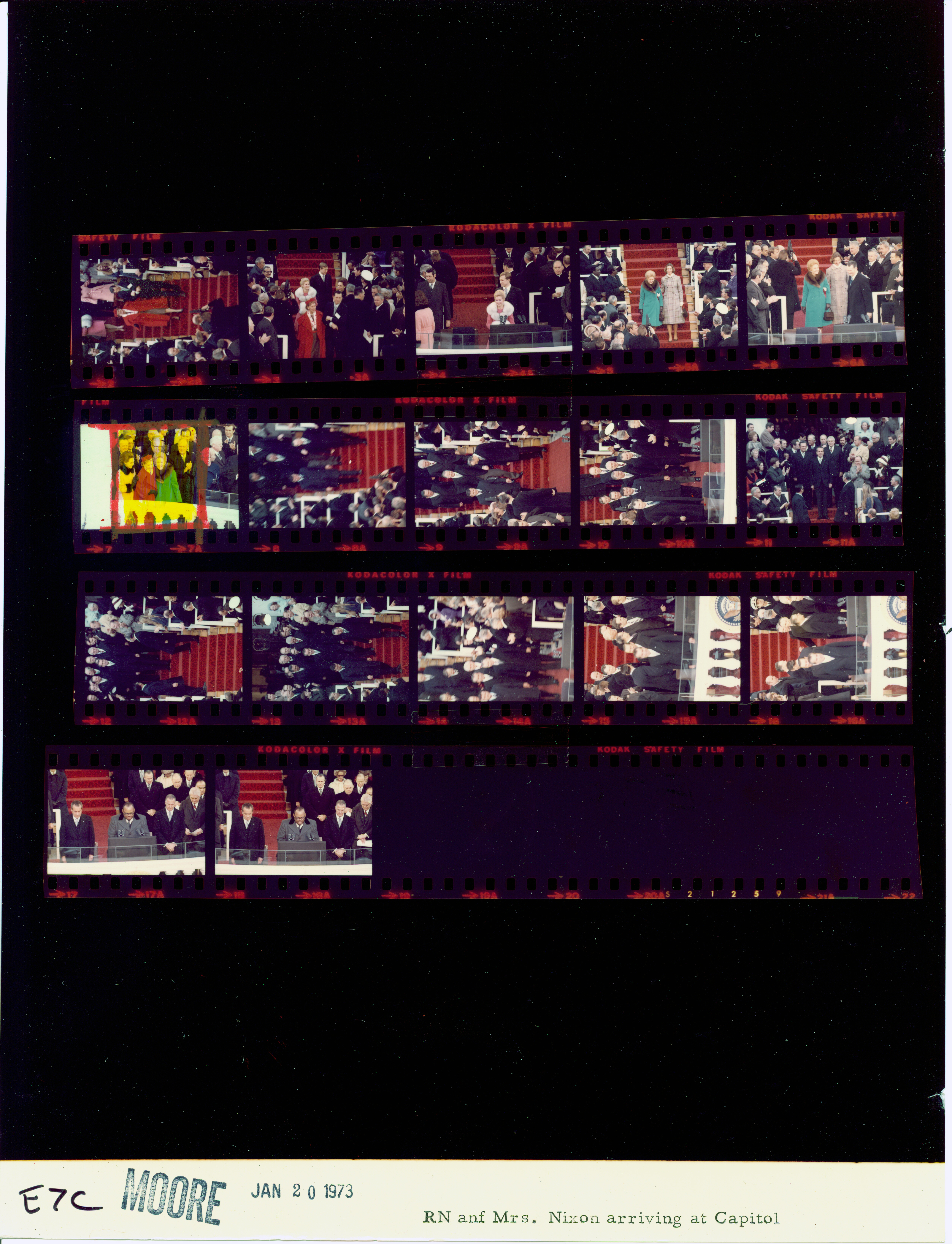 - Frame(s): WHPO-E0001-01-05A, President Nixon officials and guests enter the Inaugural platform. 1/20/1973, Washington, D.C. Inaugural Platform, Capitol. President Nixon, Pat Nixon, Agnew, Judy Agnew, Warren Burger, officials, relatives, Rev. E.V. Hill, guests, band members.