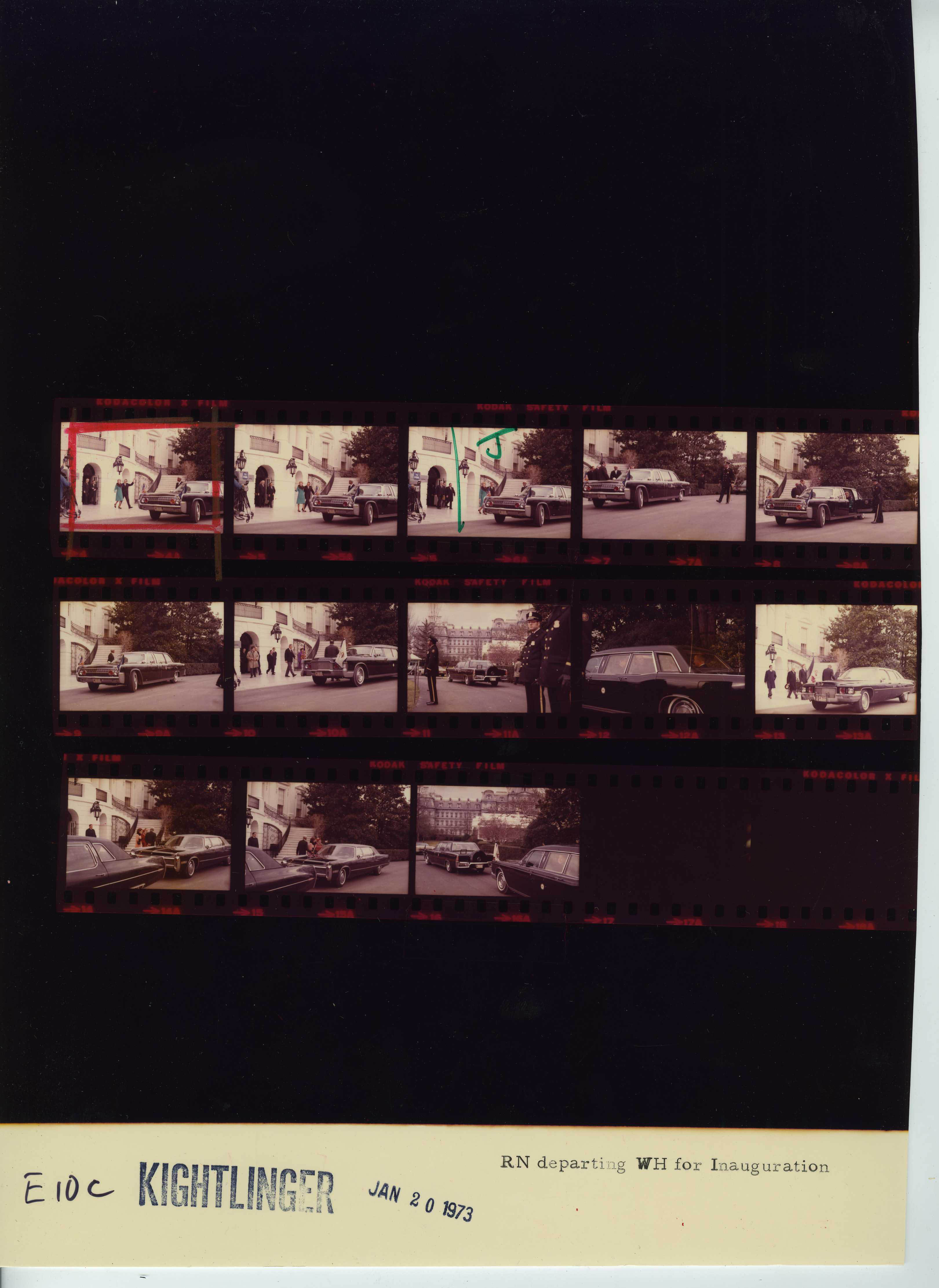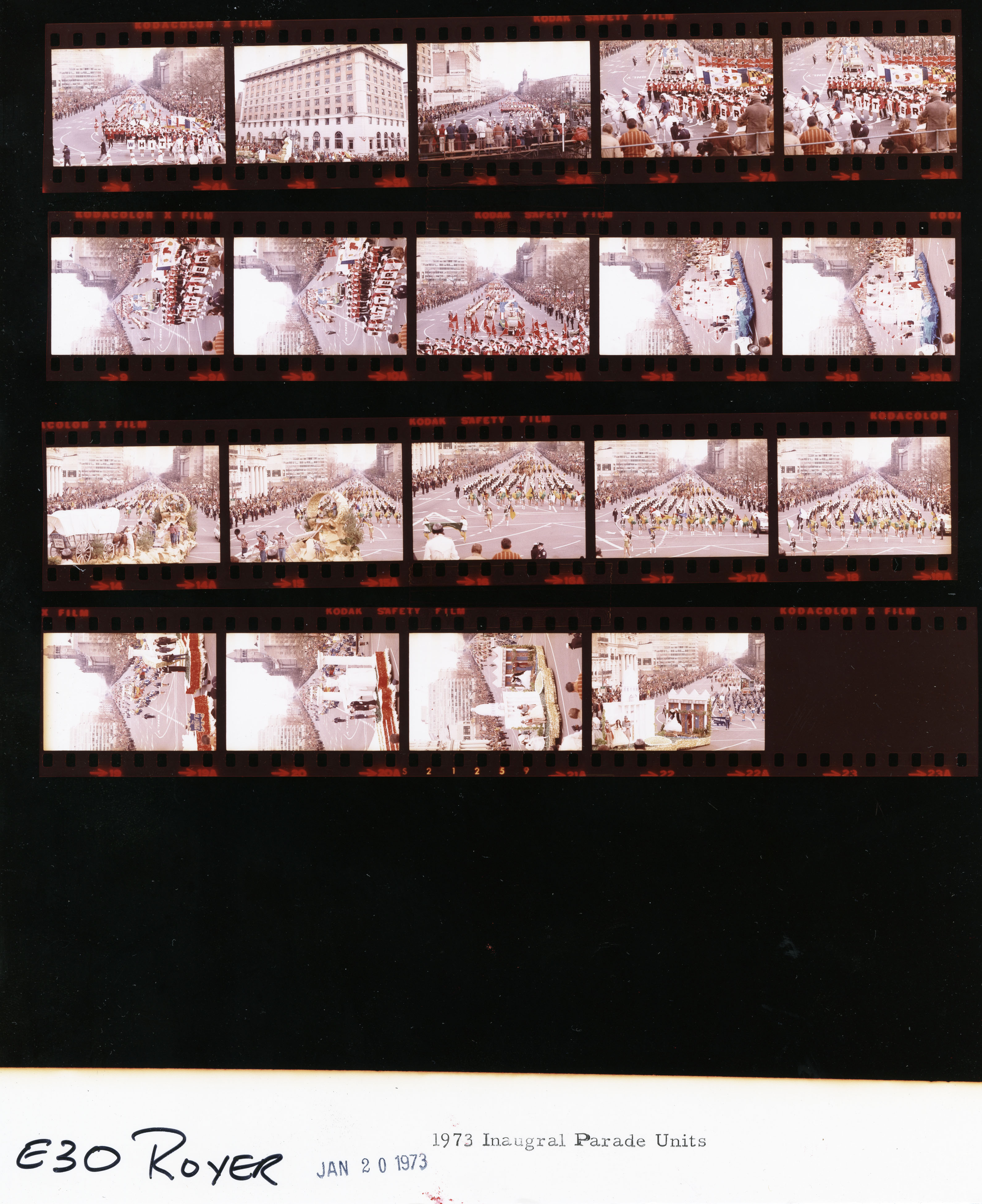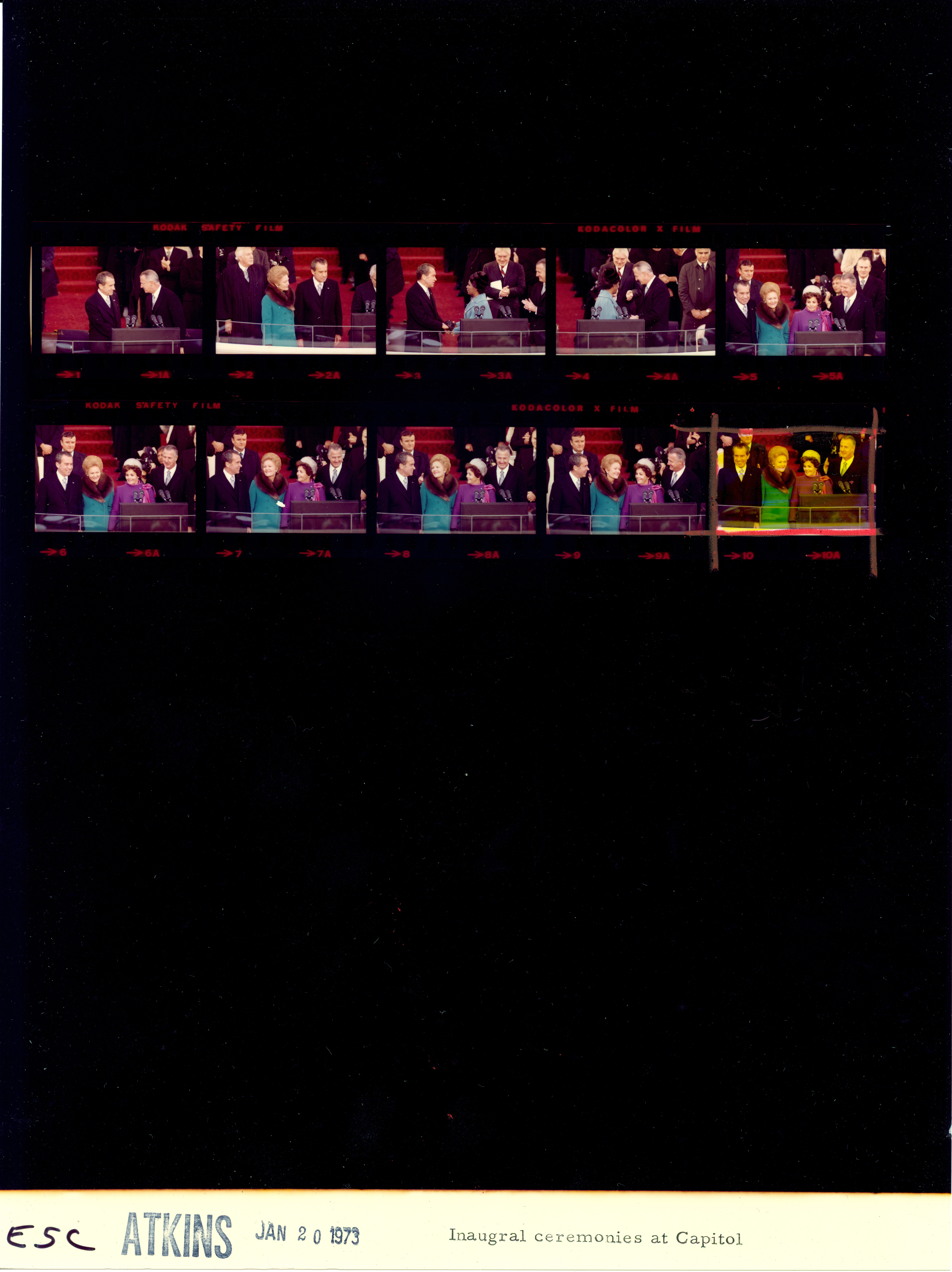 - Frame(s): WHPO-E0001-01-05A, President Nixon officials and guests enter the Inaugural platform. 1/20/1973, Washington, D.C. Inaugural Platform, Capitol. President Nixon, Pat Nixon, Agnew, Judy Agnew, Warren Burger, officials, relatives, Rev. E.V. Hill, guests, band members.