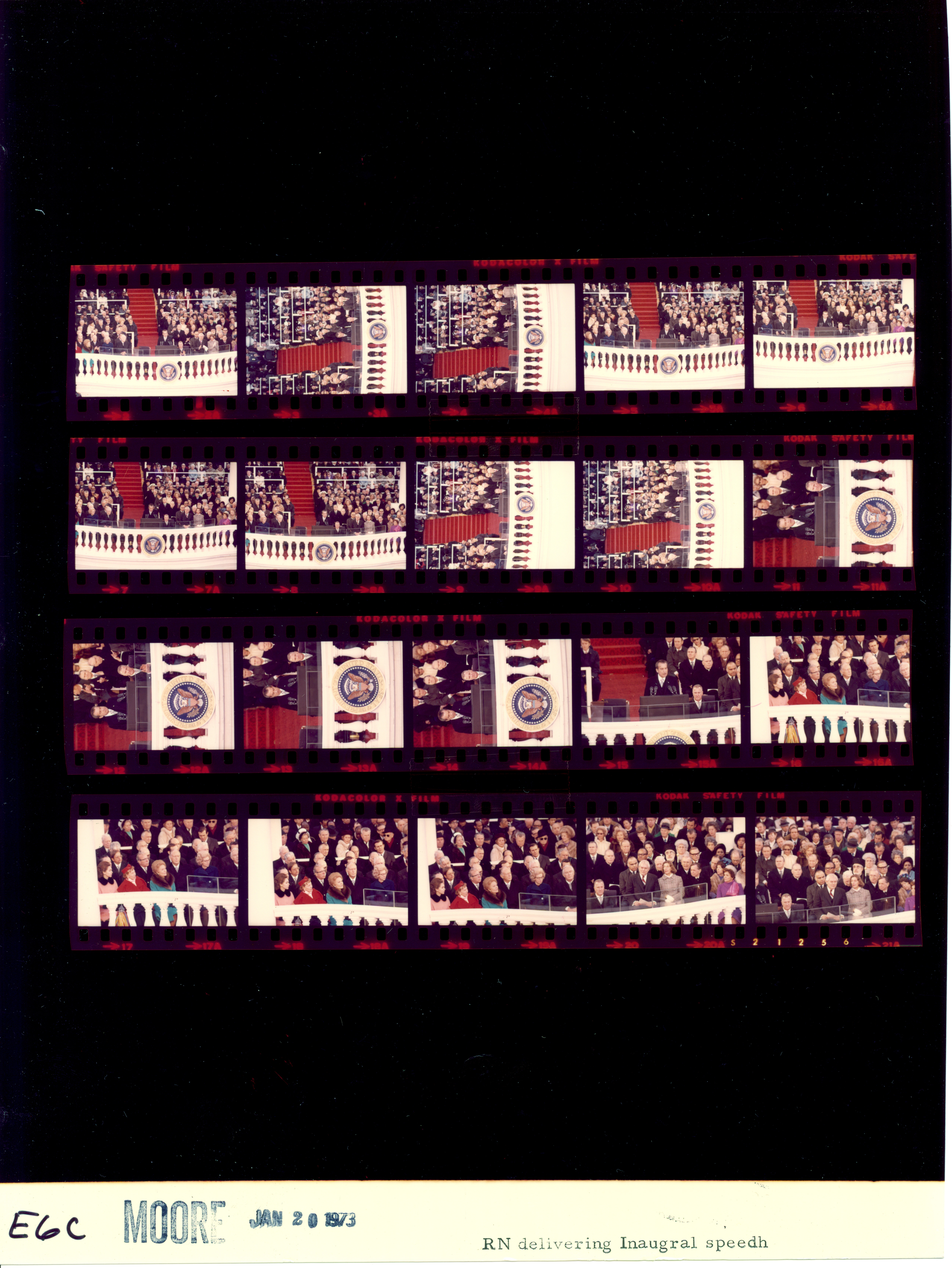 - Frame(s): WHPO-E0002-09A-17A, Inaugural ceremony. President Nixon delivering his inaugural address and standing facing the crowd afterward. 1/20/1973, Washington, D.C. Inaugural Platform, Capitol. President Nixon, Pat Nixon, Spiro Agnew, Judy Agnew, Warren Burger, officials, relatives, guests, band members.