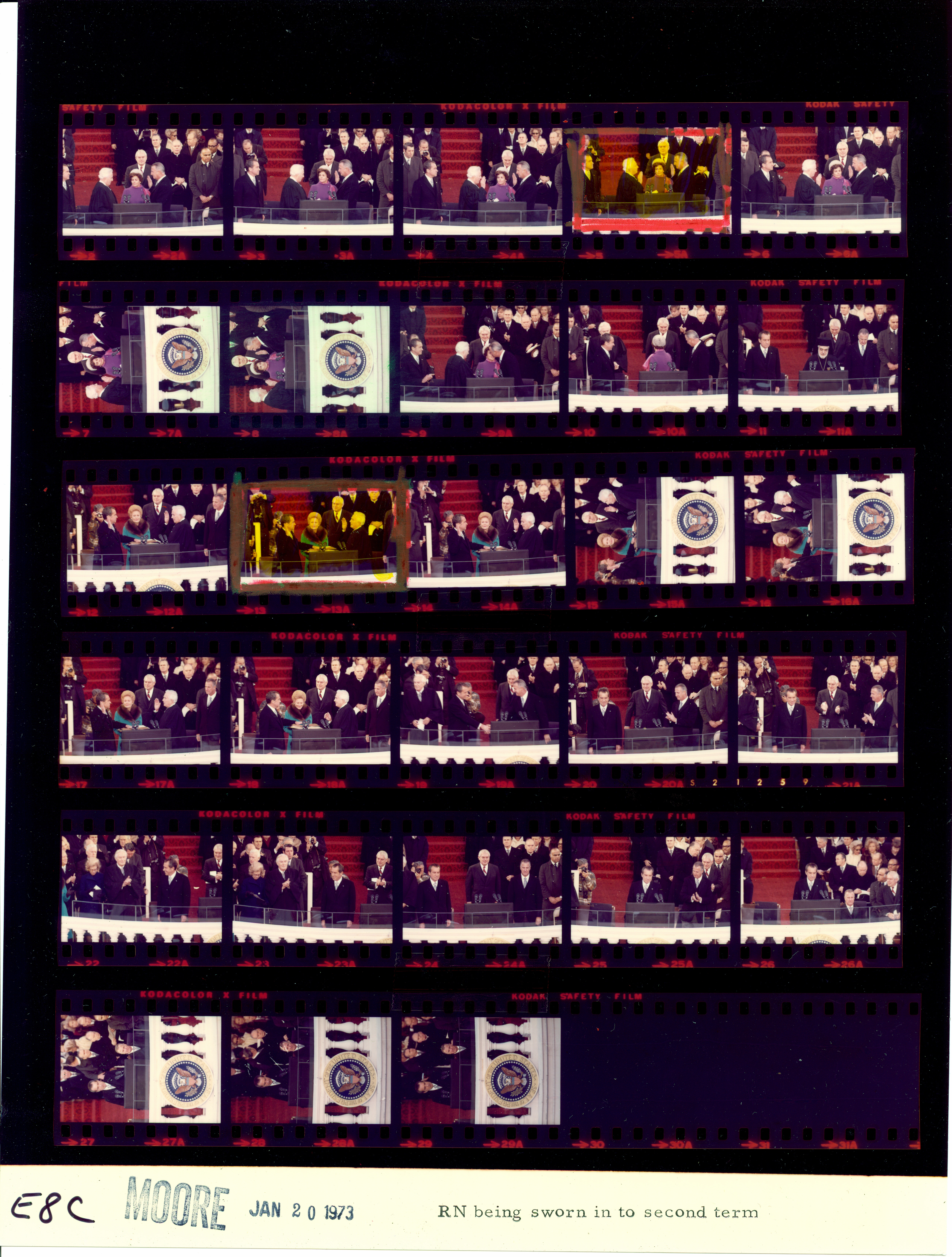 - Frame(s): WHPO-E0002-01A-08A, Inaugural ceremony. President Nixon taking the oath of office from Chief Justice Warren Burger. Pat Nixon stands beside him. 1/20/1973, Washington, D.C. Inaugural Platform, Capitol. President Nixon, Pat Nixon, Spiro Agnew, Judy Agnew, Warren Burger, Ronald Reagan, Jimmy Carter, Donald Rumsfeld, William Rogers, Cecil Stoughton, officials, relatives, guests, band members.