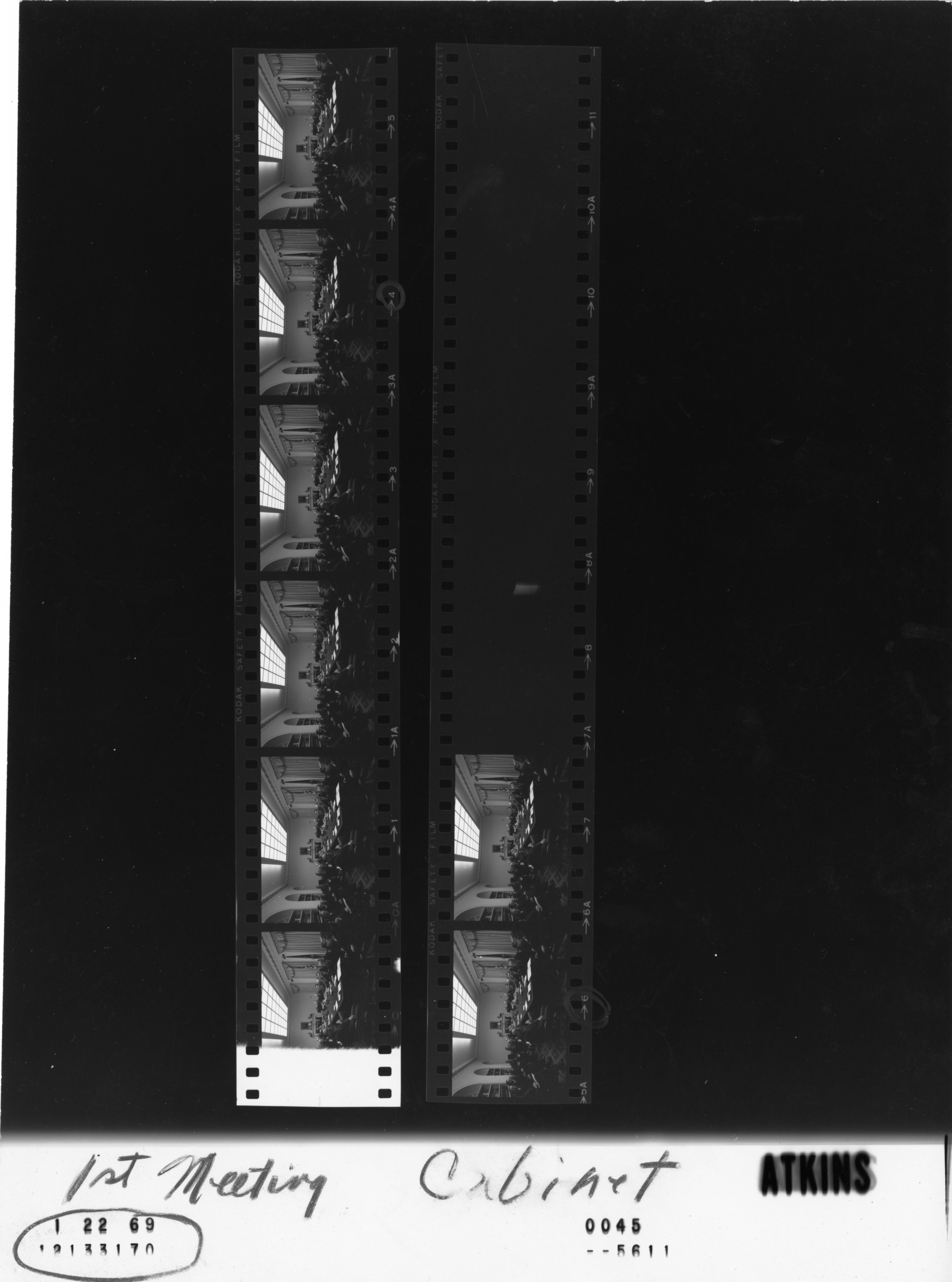 - Frame(s): WHPO-0045-00-07, First meeting of President Nixon with his Cabinet. 1/22/1969, Washington, D.C. White House, Cabinet Room. Clockwise around table: President Nixon, Melvin Laird, Clifford Hardin, George Romney, Arthur Burns, Robert Mayo, Robert Finch, Walter Hickel, David Kennedy, Spiro Agnew, John Mitchell, Maurice Stans, John Volpe, Charles Yost, George Shultz, Winton Blount, William Rogers; Background L-R: Andrew Goodpaster, Patrick Moynihan, Paul McCracken, Herbert Klein, John Whitaker.