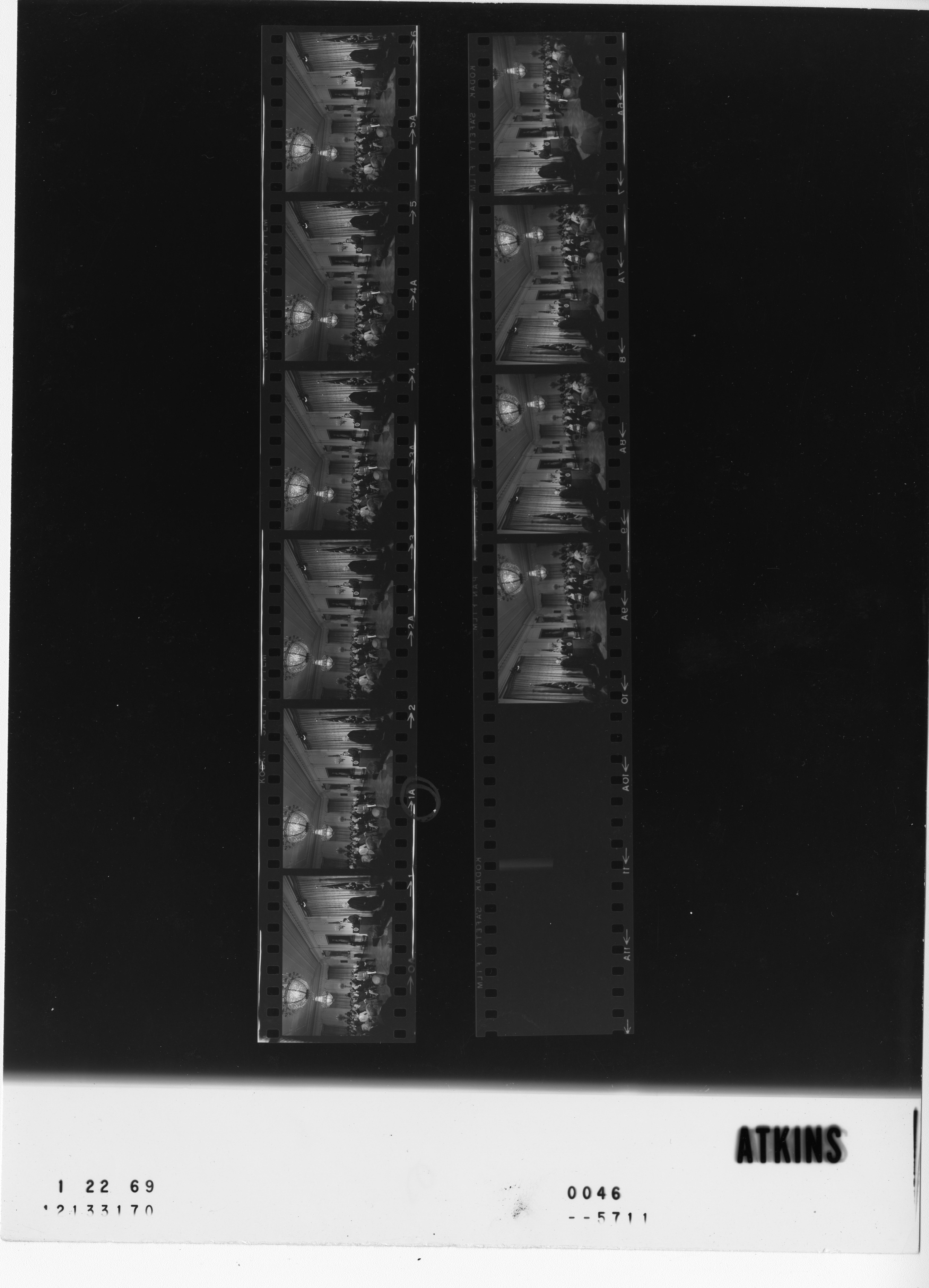 - Frame(s): WHPO-0046-00A-05A, President Nixon speaking from the podium, next to Chief Justice Earl Warren, before beginning the swearing-in ceremony of new Cabinet members. 1/22/1969, Washington, D.C. White House, East Room. President Nixon, Chief Justice Earl Warren, Melvin Laird, Clifford Hardin, George Romney, Arthur Burns, Robert Mayo, Robert Finch, Walter Hickel, David Kennedy, Spiro Agnew, John Mitchell, Maurice Stans, John Volpe, Charles Yost, George Shultz, Winton Blount, William Rogers.