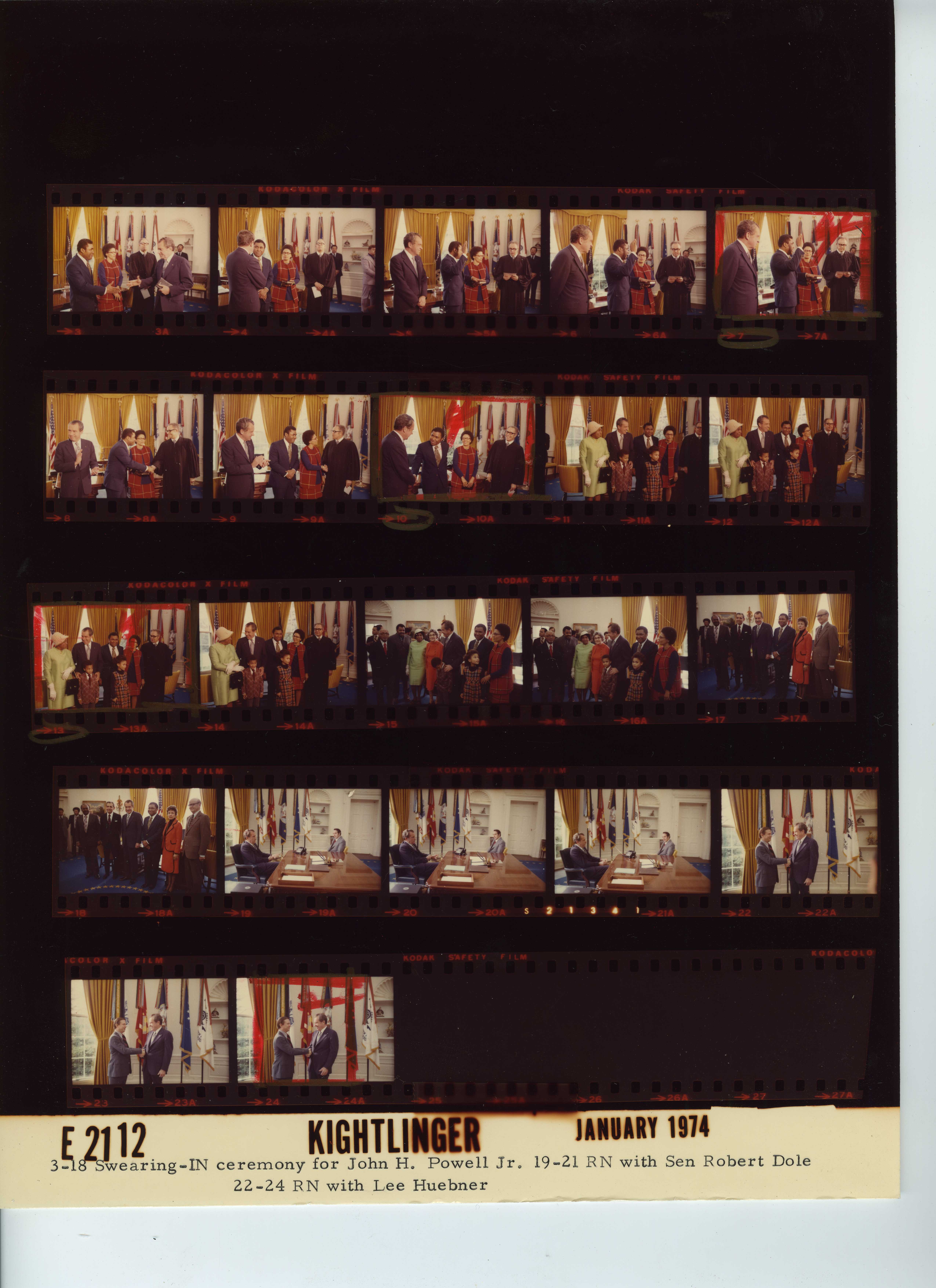 - Frame(s): WHPO-E2112-03-18, Swearing-in ceremony for John H. Powell, Jr. as Chairman of the Equal Employment Opportunity Commission (EEOC). 1/22/1974, Washington, D.C. White House, Oval Office. President Nixon, John H. Powell, Jr., Chairman of the EEOC, Mrs. John H. Powell, Jr., Judge Aubrey E. Robinson, Jr., of the U.S. District Court, and other unidentified guests.