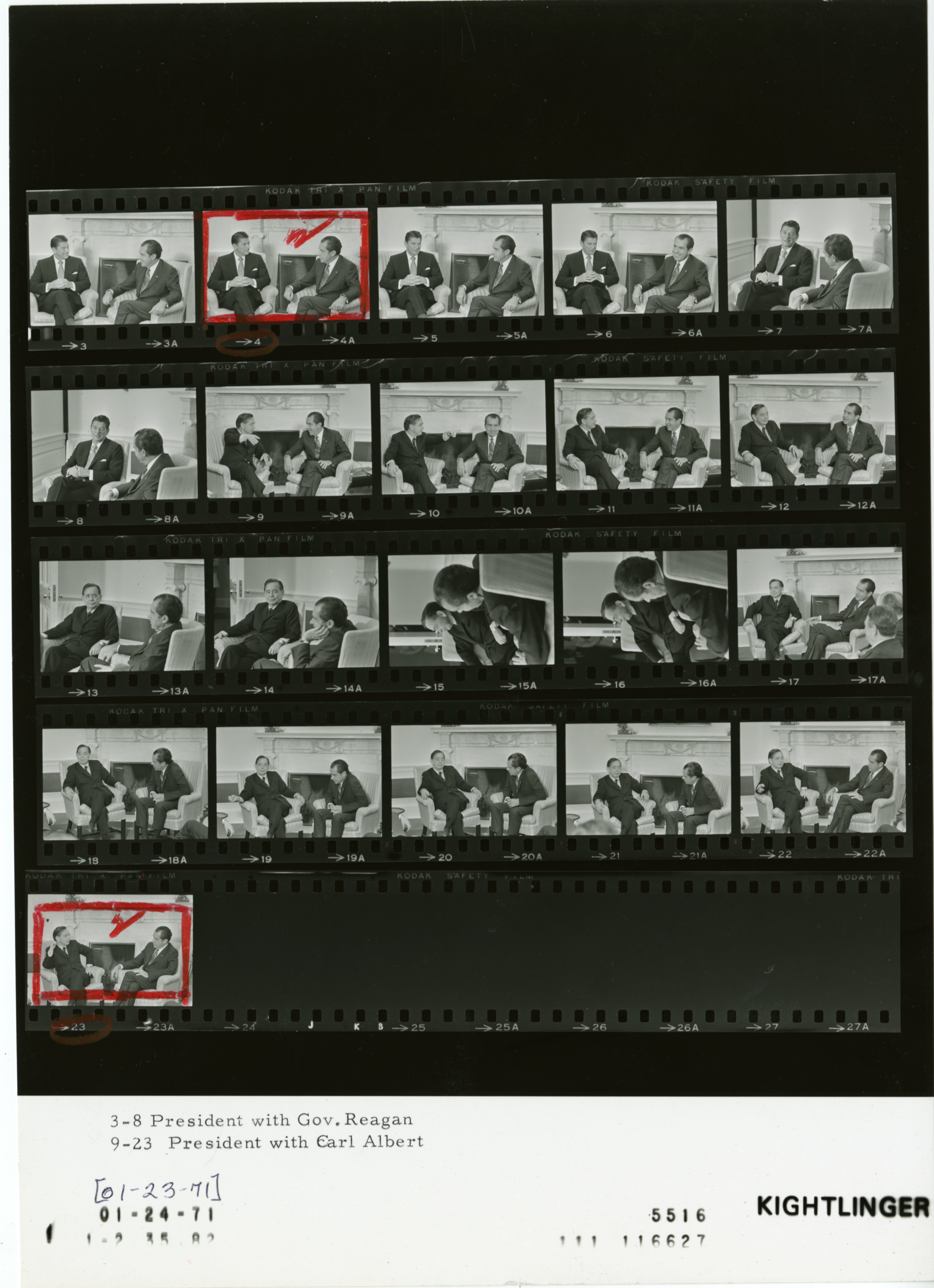 - Frame(s): WHPO-5516-03-08, President Nixon seated informally in the Oval Office during a meeting with Governor Ronald Reagan. 1/23/1971, Washington, D.C. White House, Oval Office. President Nixon, Gov. Ronald Reagan, Carl Albert.