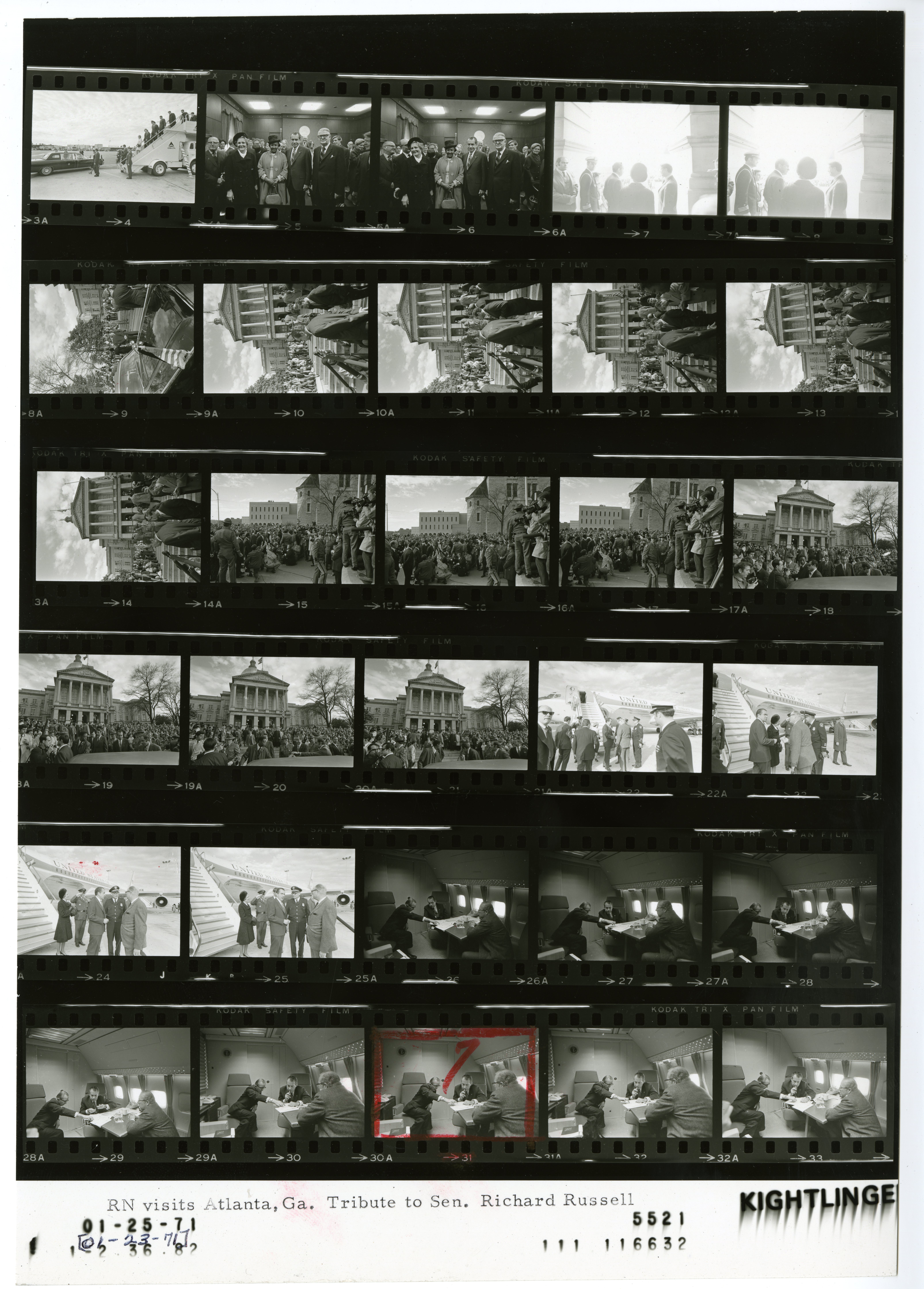 - Frame(s): WHPO-5521-04A-08A, President Nixon arriving at the Georgia State Capitol to pay respects to the late Senator Richard Russell. 1/23/1971, Atlanta, Georgia Georgia State Capitol. President Nixon, Pat Nixon, Jimmy Carter, Shultz, Paul McCracken, officials, crowd.