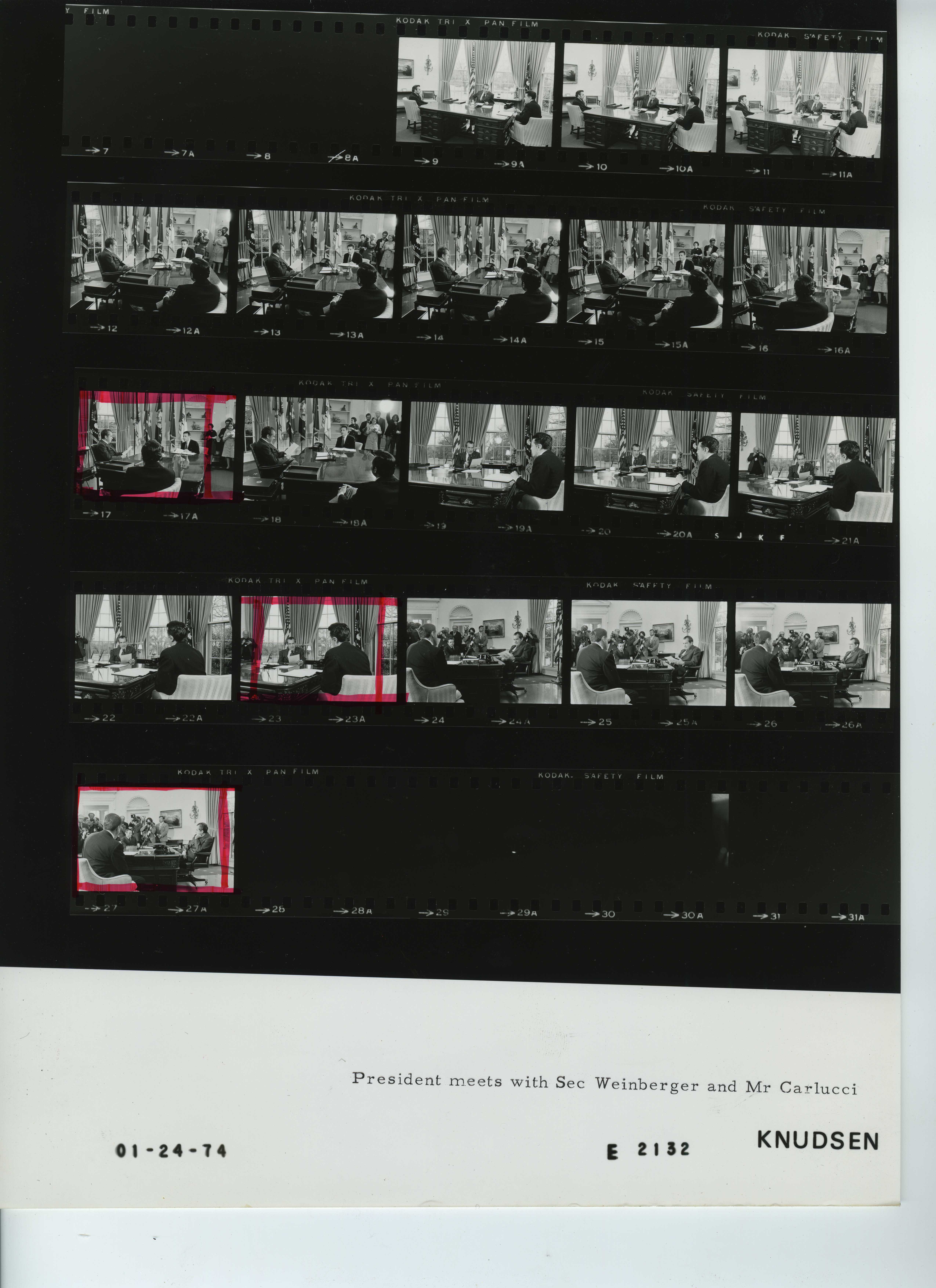 - Frame(s): WHPO-E2132-27A, President Nixon meeting with the Secretary of Health, Education and Welfare Caspar Weinberger and Frank Carlucci, Under Secretary of HEW. 1/24/1974, Washington, D.C. White House, Oval Office. President Nixon, Caspar W. Weinberger, and Frank C. Carlucci.