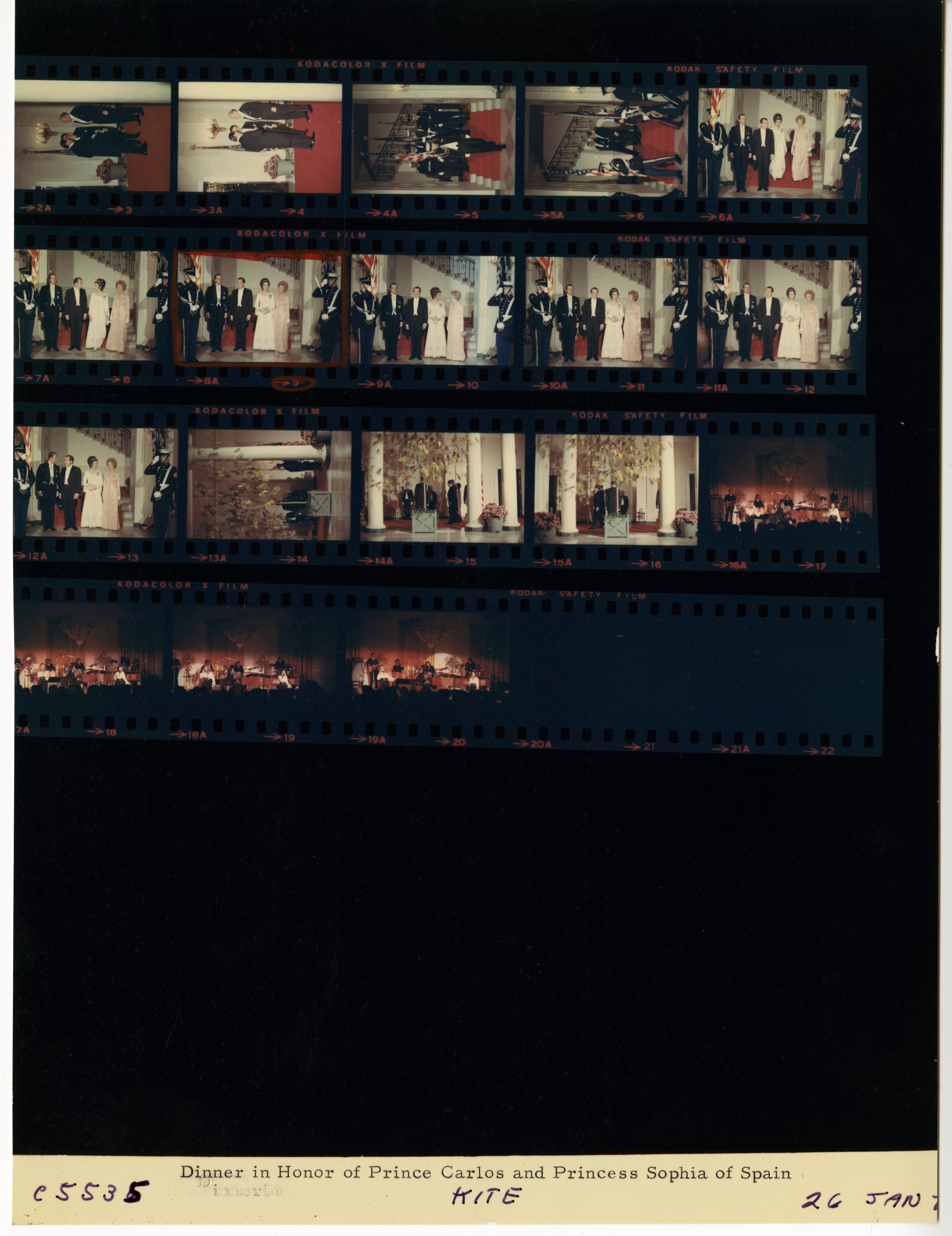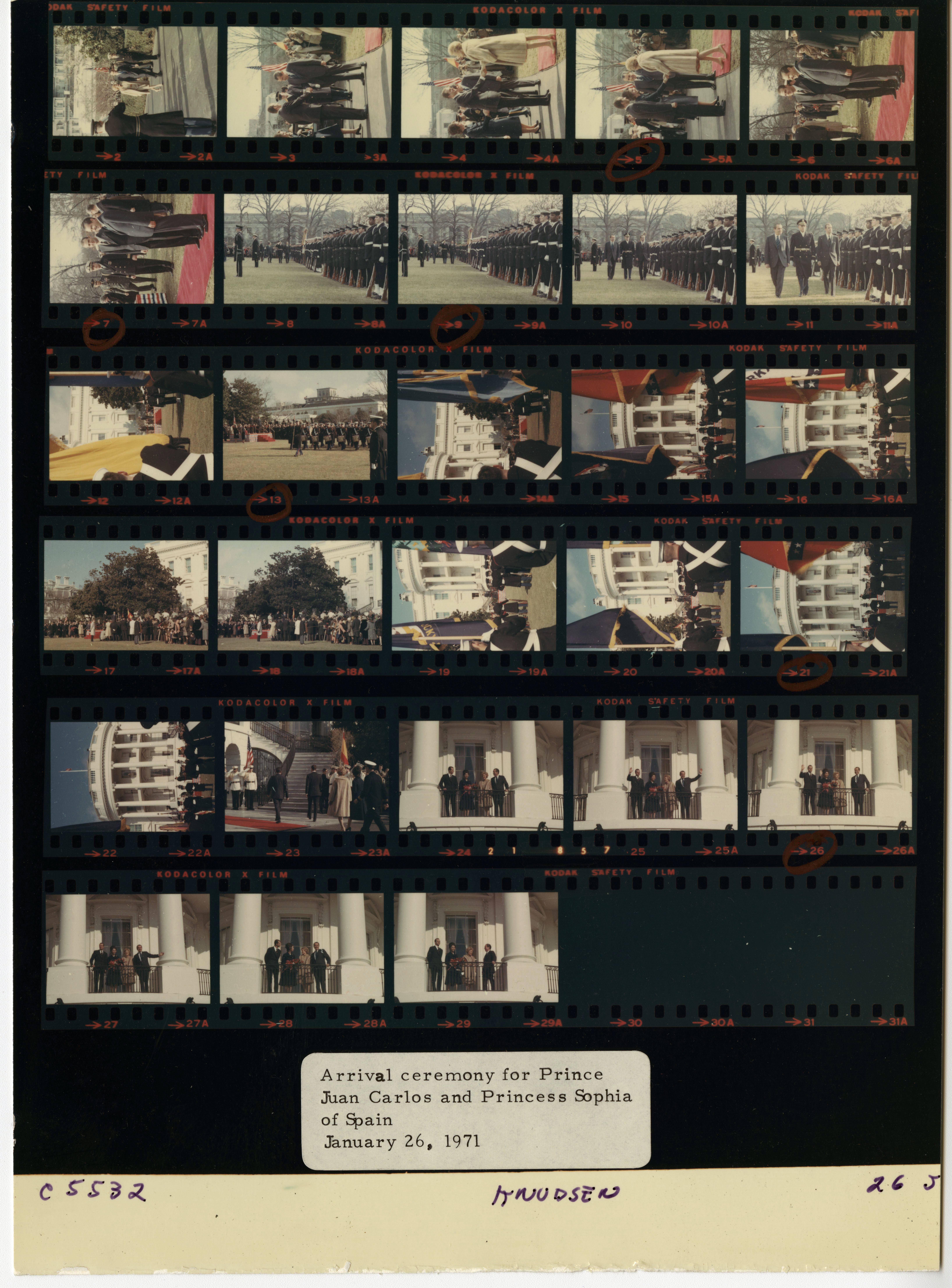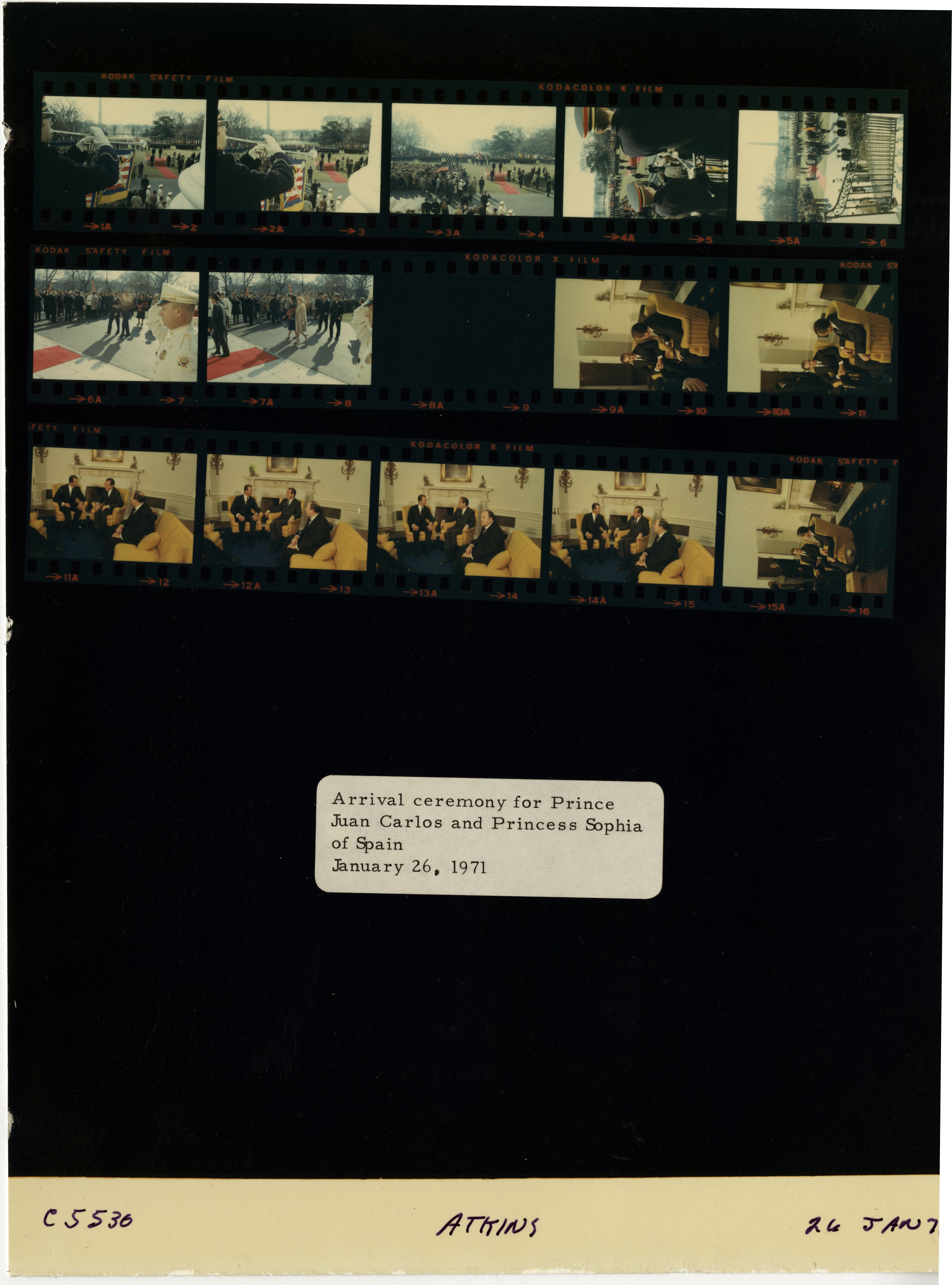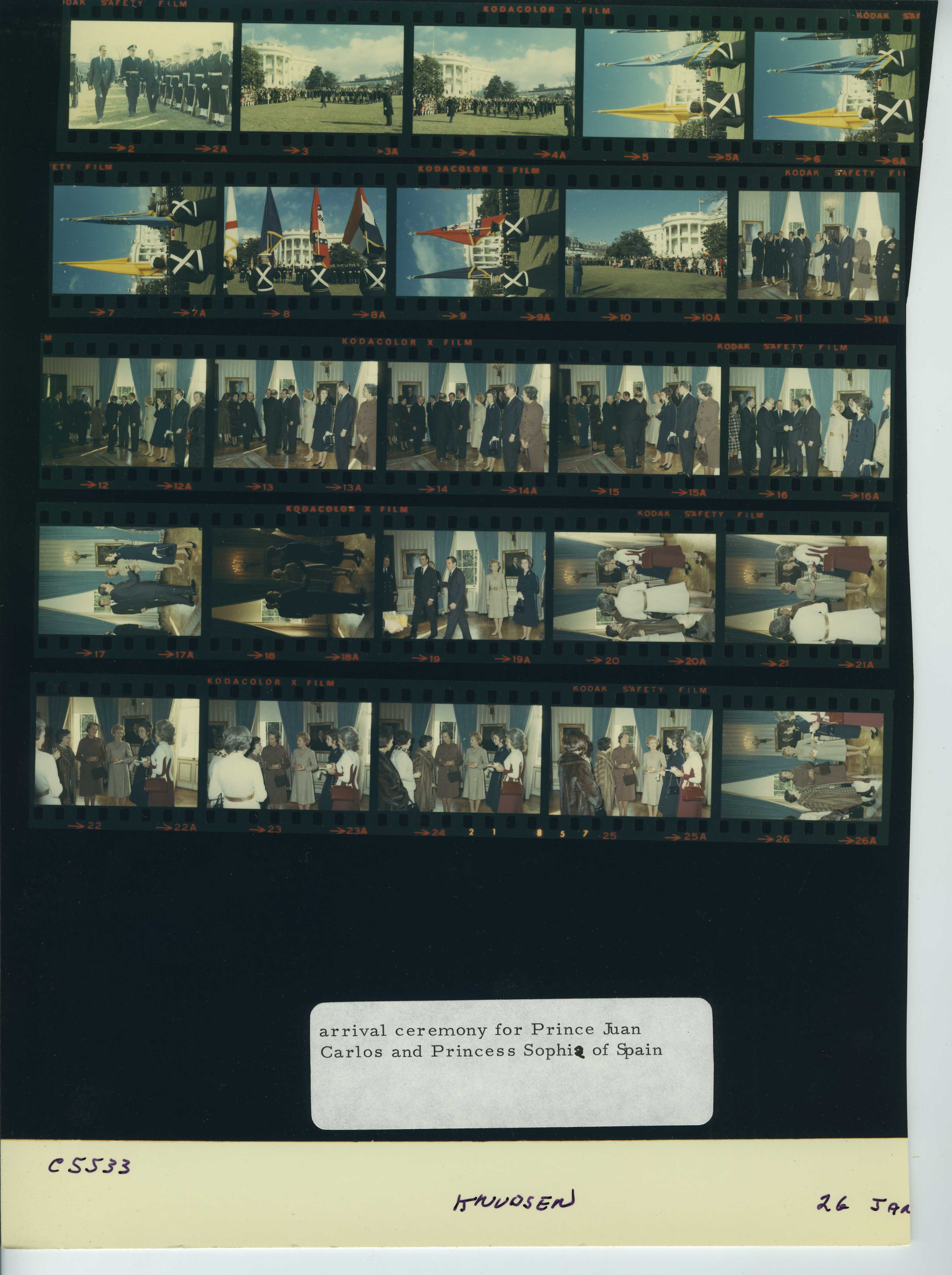 - Frame(s): WHPO-5530-01A-07A, Arrival ceremony for Prince Juan Carlos and Princess Sophia of Spain with President Nixon in attendance. 1/26/1971, Washington, D.C. White House, South Lawn. President Nixon, Pat Nixon, Prince Juan Carlos, Princess Sophia, trumpeters, guests.