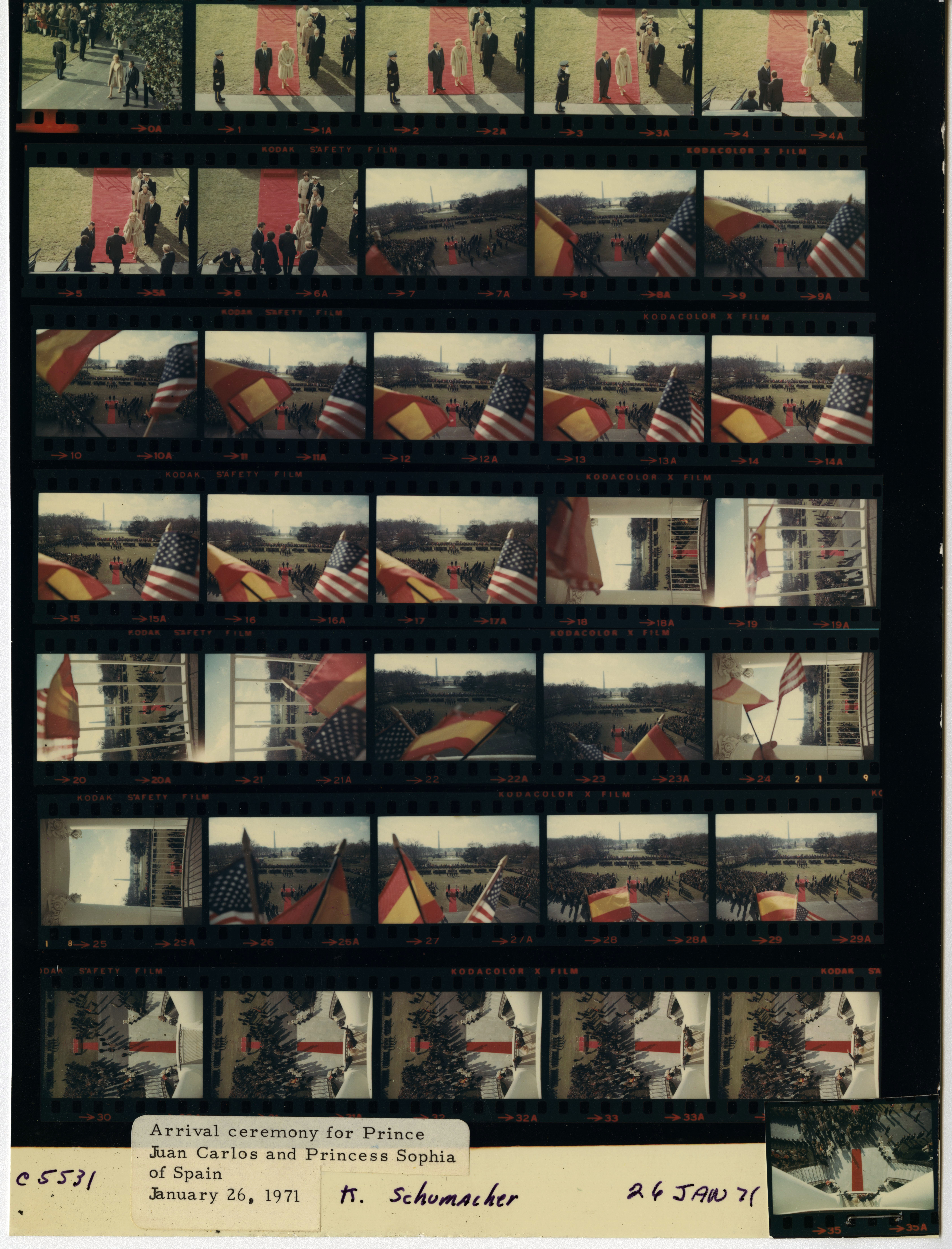 - Frame(s): WHPO-5529-, Transparencies showing the arrival ceremony for Prince Juan Carlos of Spain. 1/26/1971, Washington, D.C. White House, South Lawn. trumpeter, color guard, guests.