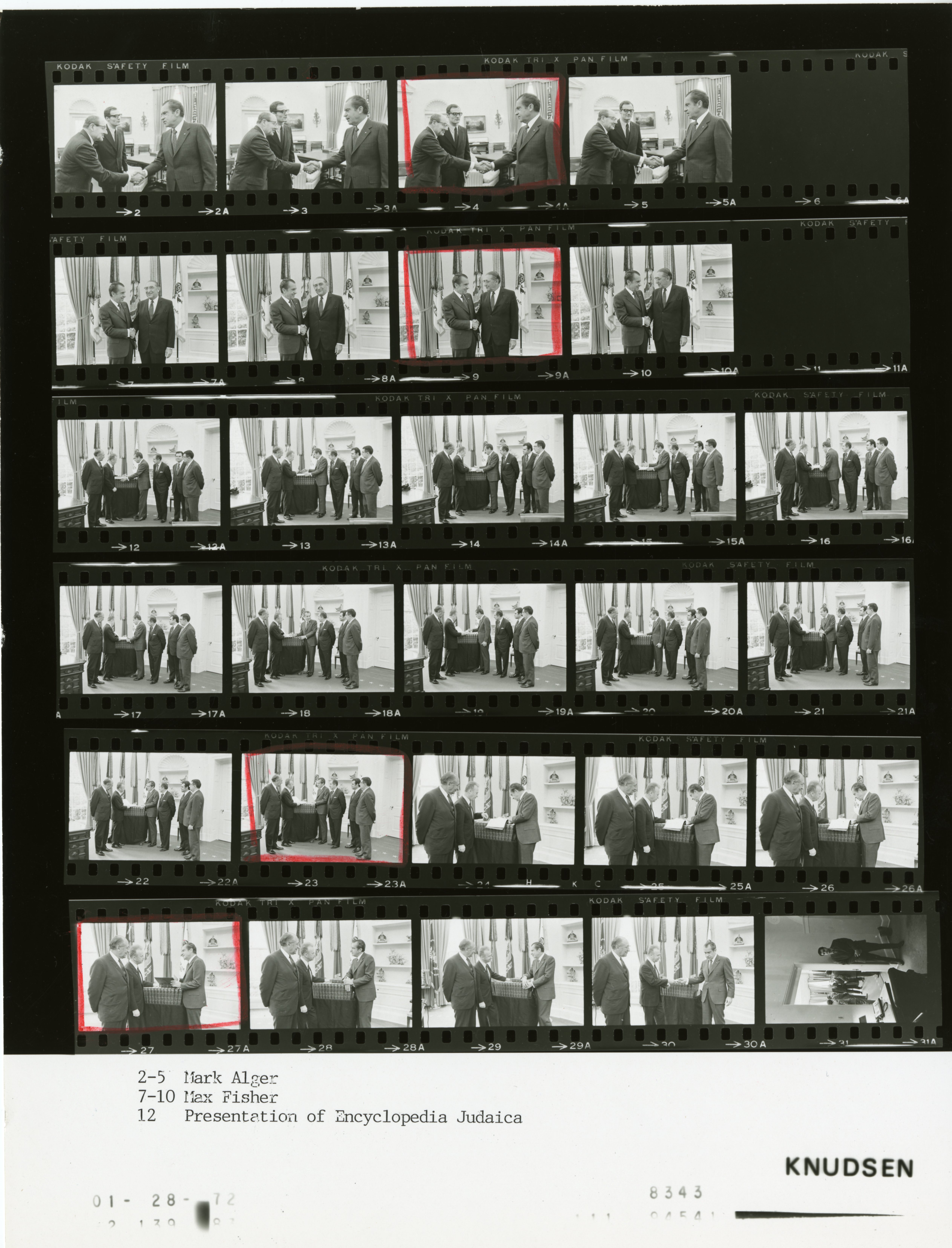 - Frame(s): WHPO-8343-06-30, President Nixon shaking hands with Max Fisher. President Nixon receiving the 16 volume Encyclopedia Judaica from Israeli Ambassador Yitzhak Rabin and others. 1/28/1972, Washington, D.C. White House, Oval Office. President Nixon, Mark Alger, unidentified man, Max Fisher, Yitzhak Rabin, Jeremiah Kaplan, Stein, Lawrence Goldberg.