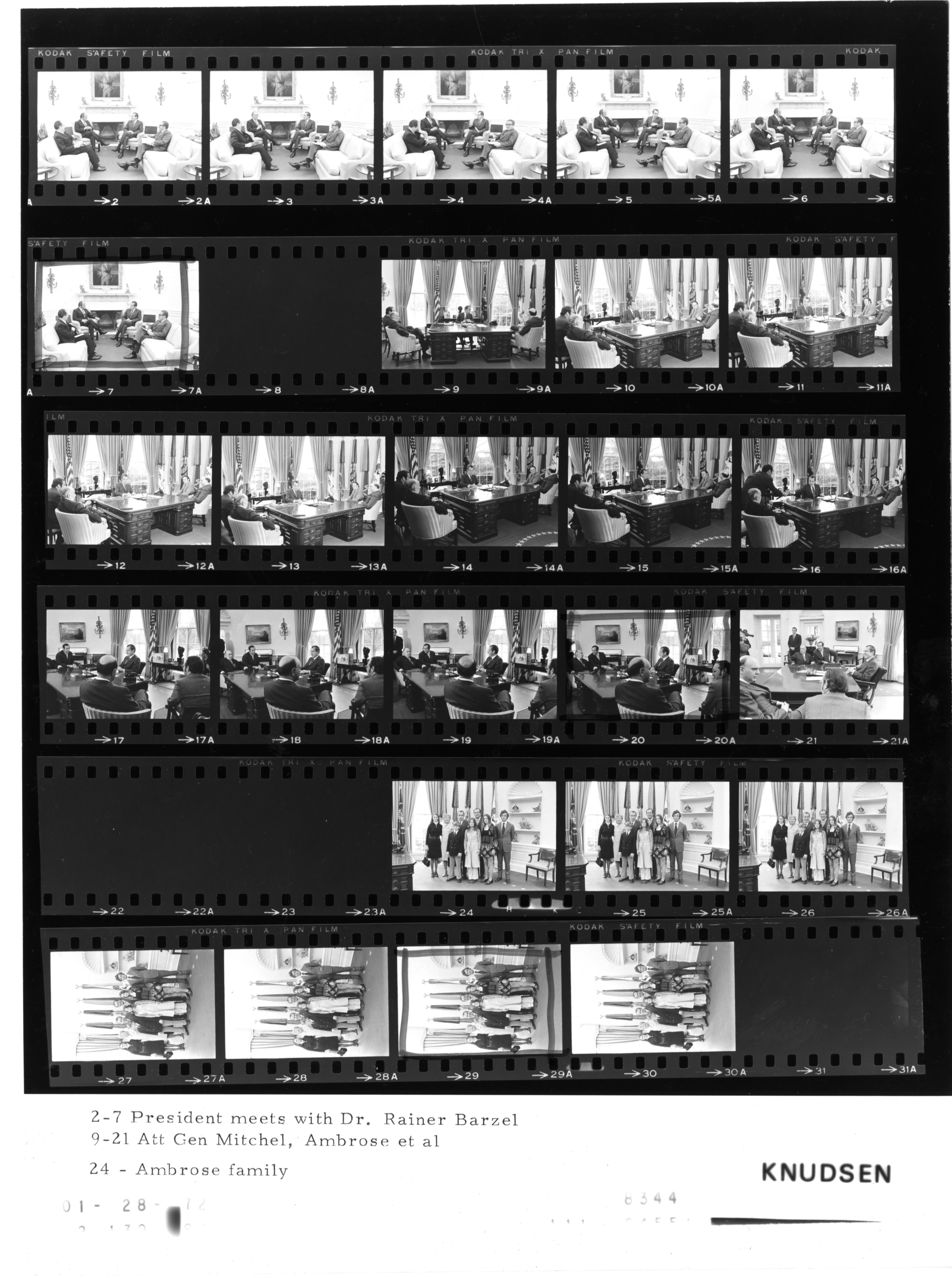 - Frame(s): WHPO-8344-24-30, President Nixon standing with the Ambrose family. 1/28/1972, Washington, D.C. White House, Oval Office. President Nixon, Rainer Barzel, Kissinger, Heinz Weber, Mitchell, Miles Ambrose, Volcker, Jerome Jaffe, Ambrose family members.