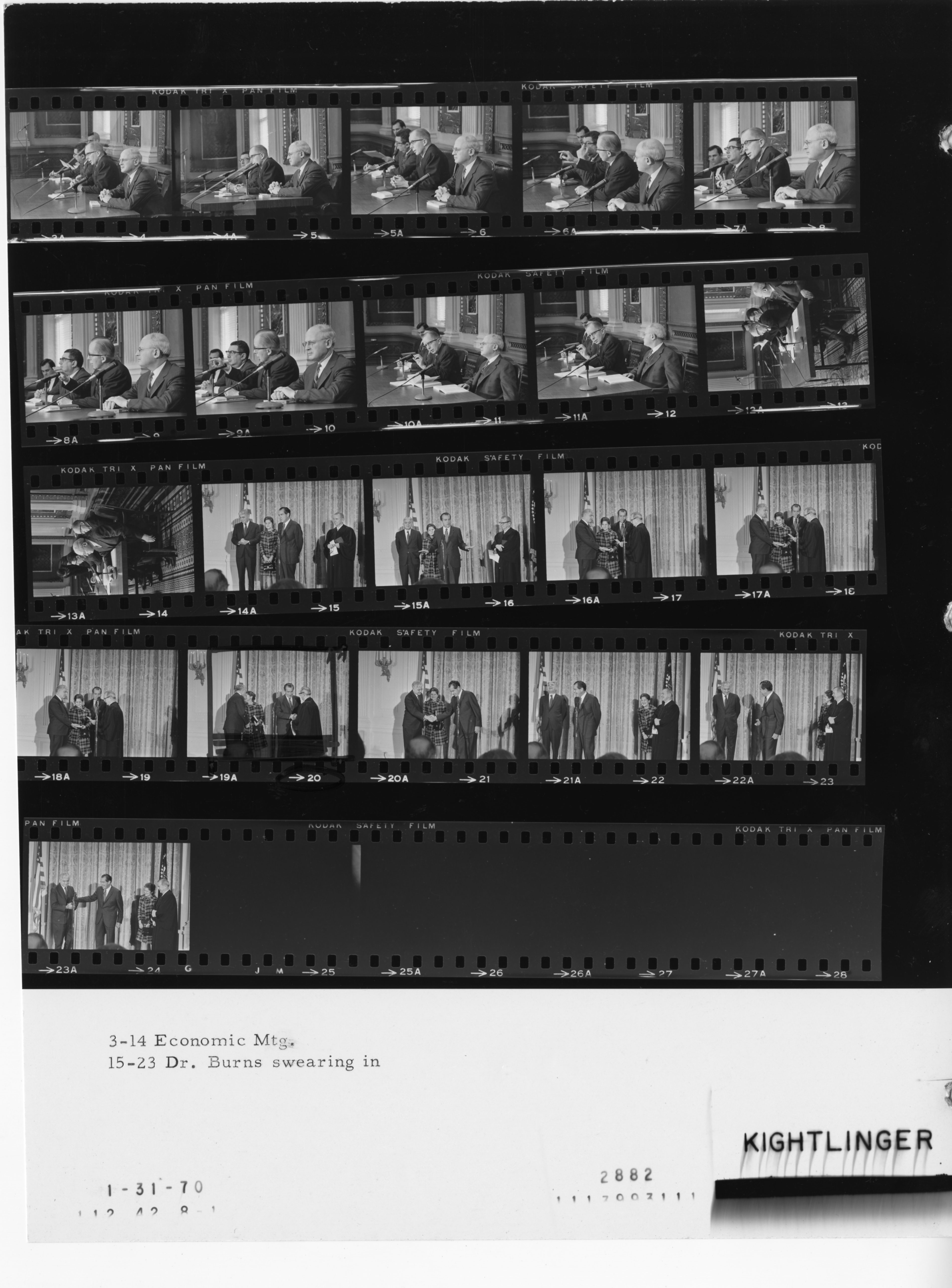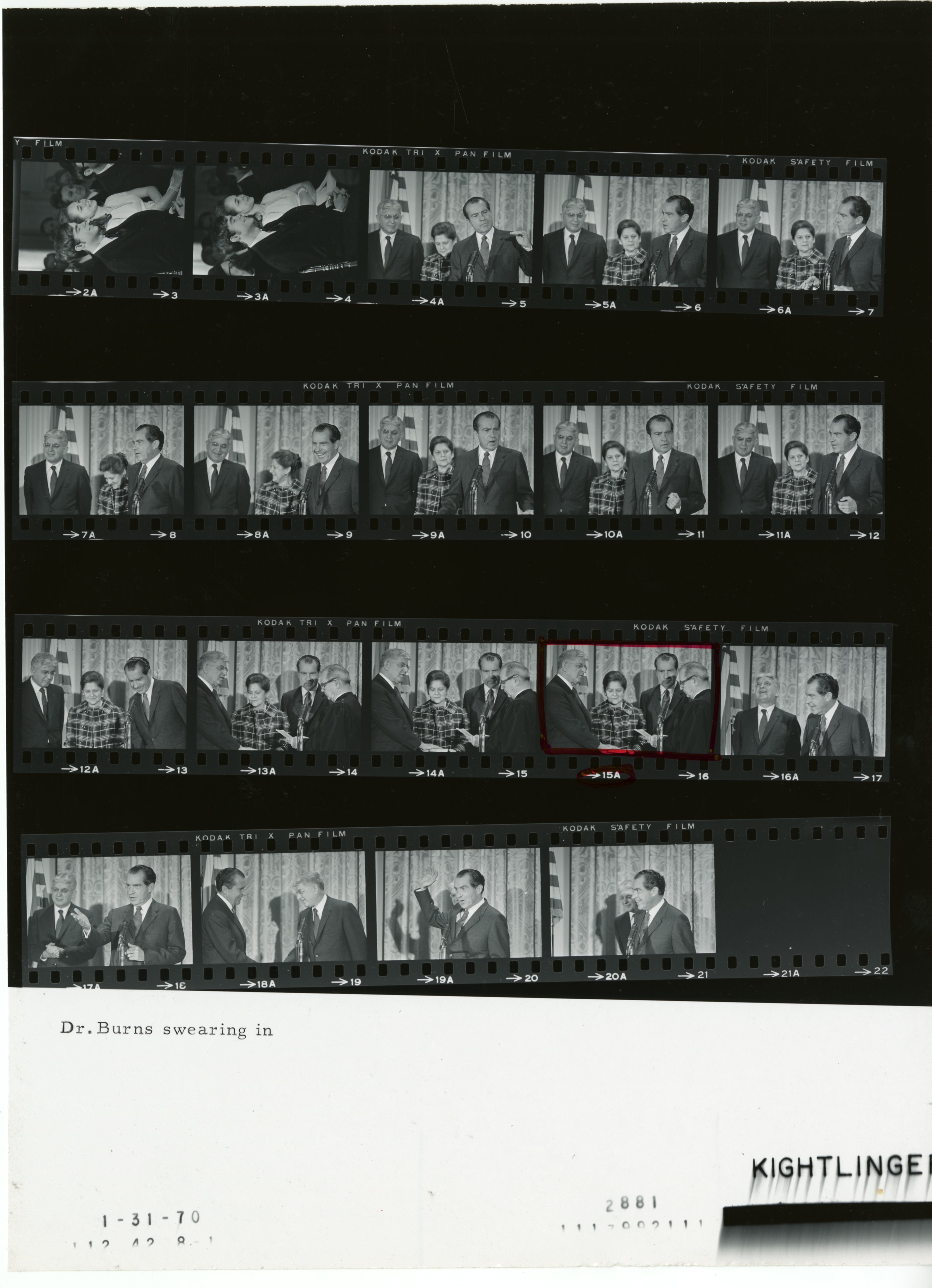- Frame(s): WHPO-2882-14A-23A, Swearing-in ceremony of Arthur F. Burns as Chairman of the Federal Reserve System's Board of Governors. 1/31/1970, Washington, D.C. White House East Room. President Nixon, Arthur Burns, Associate Justice William J. Brennan.