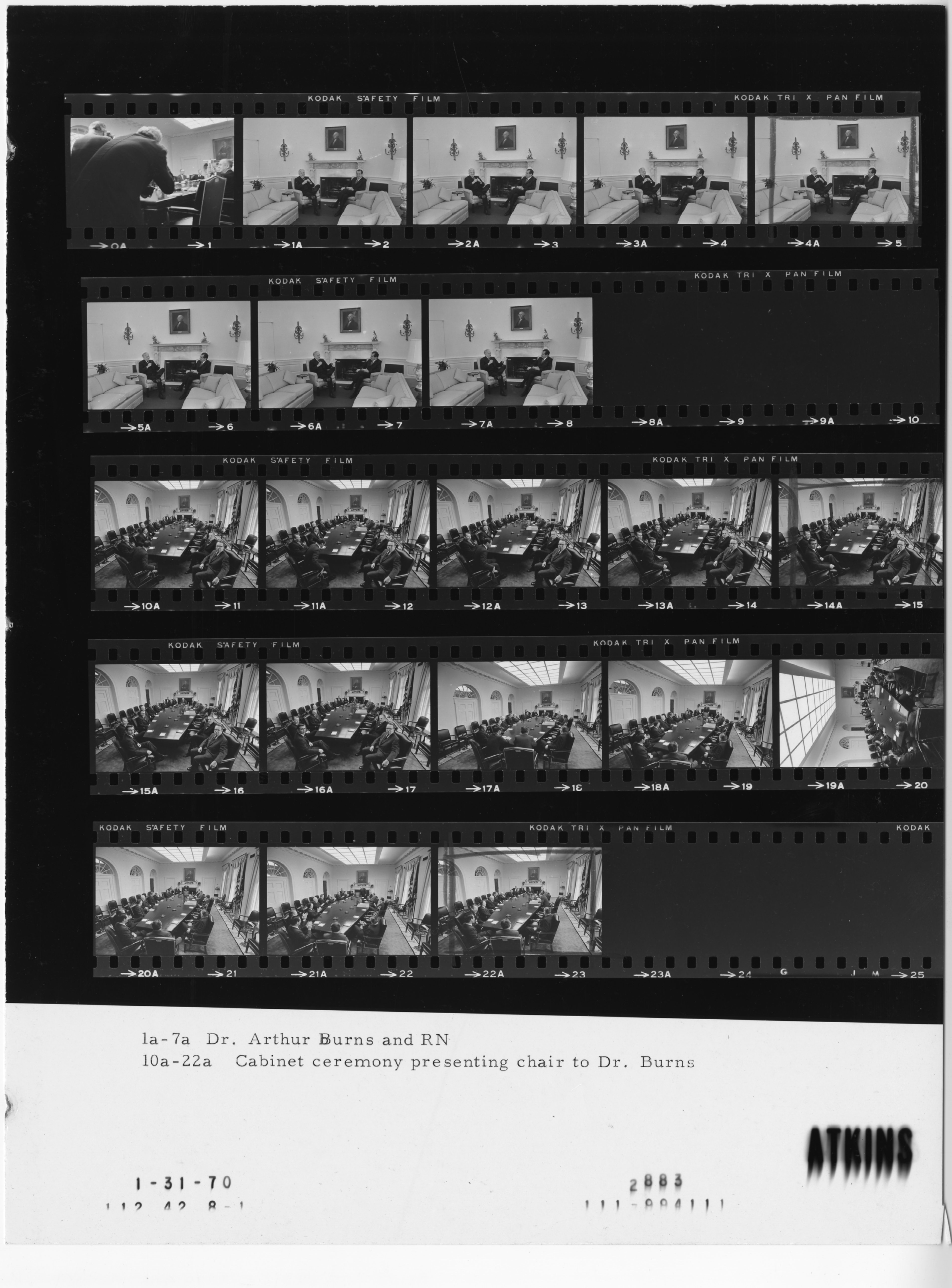 - Frame(s): WHPO-2883-10A-22A, Cabinet members ceremony presenting chair to Dr. Arthur Burns. 1/31/1970, Washington, D.C. White House, Cabinet Room. President Nixon, Vice President Agnew, Arthur Burns, members of the cabinet: John Mitchell, David Kennedy, William Rogers, Melvin Laird, Walter Hickel, George Romney, George Shultz, Clifford Hardin, Maurice Stans, Robert Finch, John Volpe, Moynihan, Donald Rumsfeld, Robert Mayo, Arthur Burns, Bryce N. Harlow.