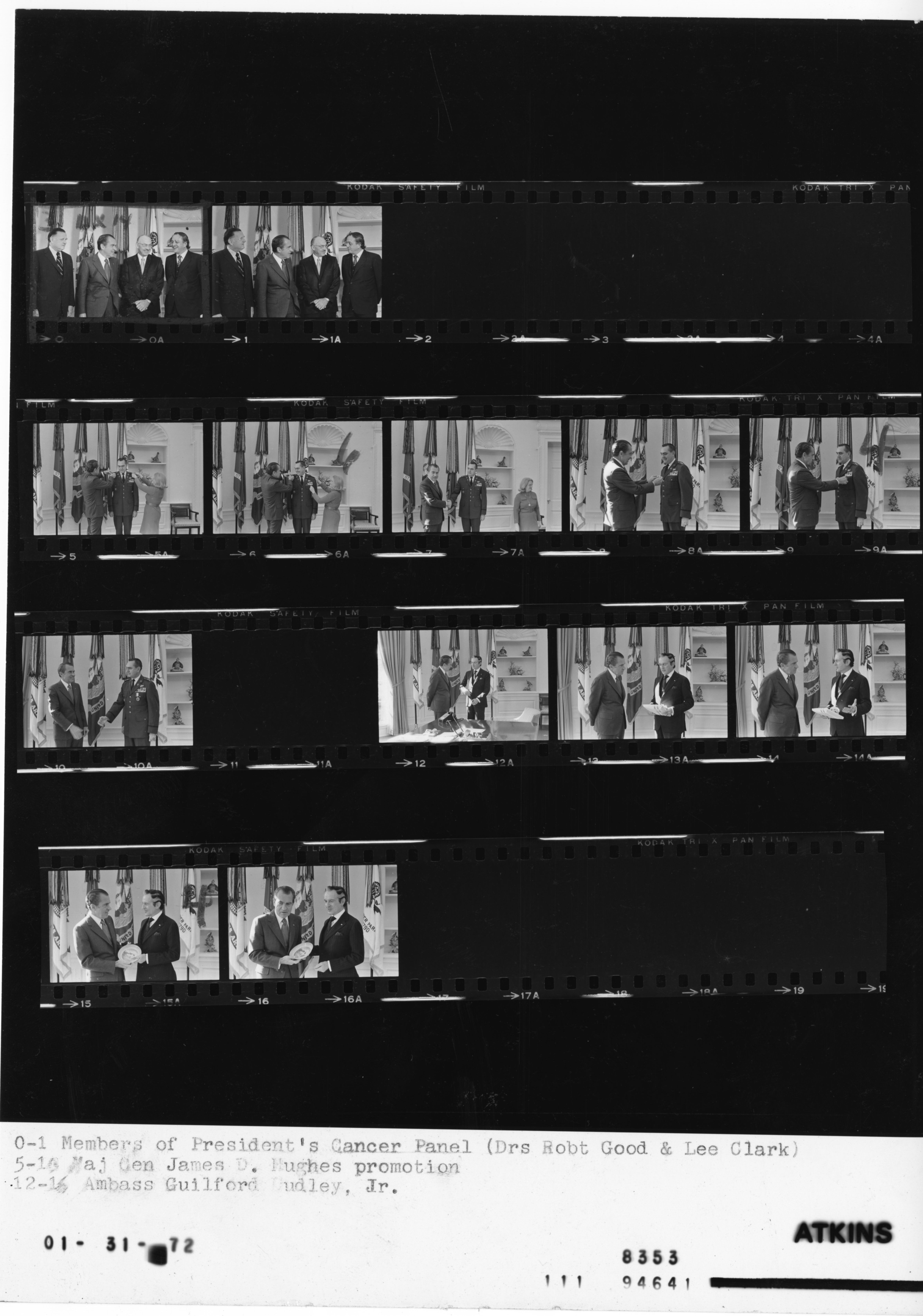 - Frame(s): WHPO-8353-00-01, President Nixon standing with members of his Cancer Panel. 1/31/1972, Washington, D.C. White House, Oval Office. President Nixon, Benno Schmidt, R. Lee Clark, Robert Good, James Hughes, Mrs. James Hughes, Guilford Dudley, Jr.