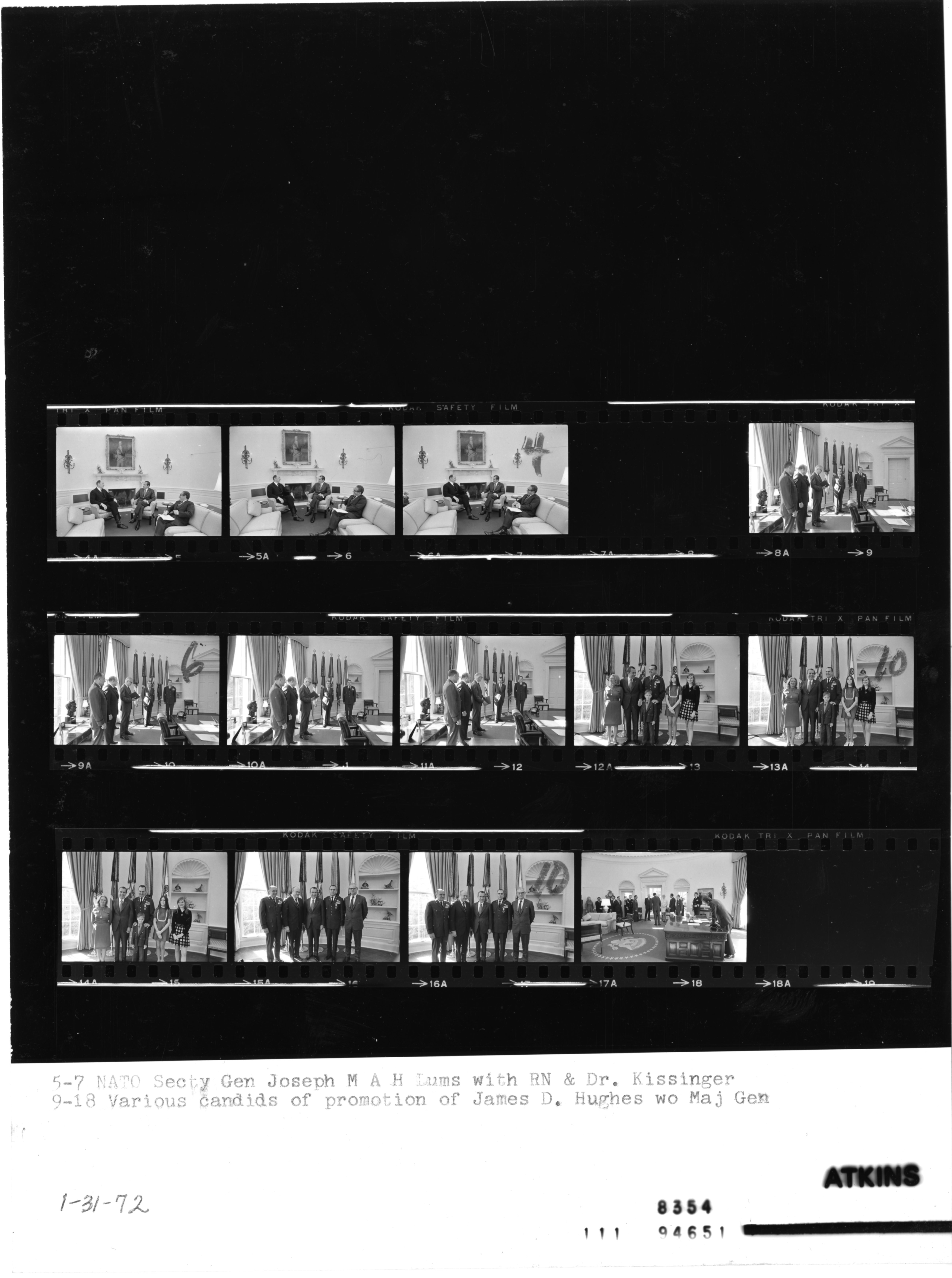 - Frame(s): WHPO-8354-09-18, President Nixon promoting Brigadier General Hughes to Major General James Donald Hughes. 1/31/1972, Washington, D.C. White House, Oval Office. President Nixon, Henry Kissinger, Joseph Luns, James Hughes, Hughes family members, Laird, Robert Seamans, John Ryan.