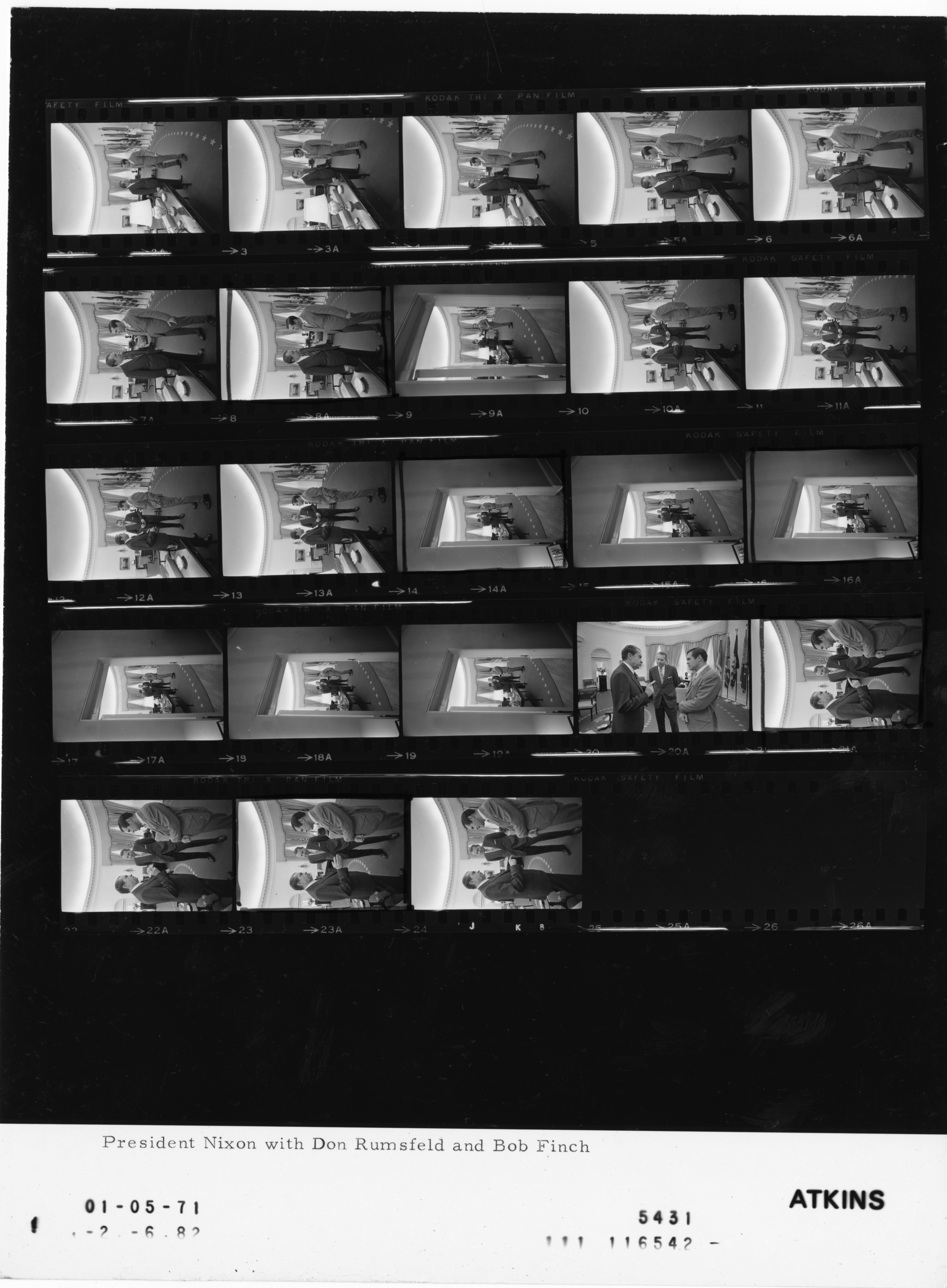 - Frame(s): WHPO-5431-02-24, President Nixon standing in the Oval Office during a meeting with Donald Rumsfeld and Robert Finch. 1/5/1971, Washington, D.C. White House, Oval Office. President Nixon, Donald Rumsfeld, Robert Finch.