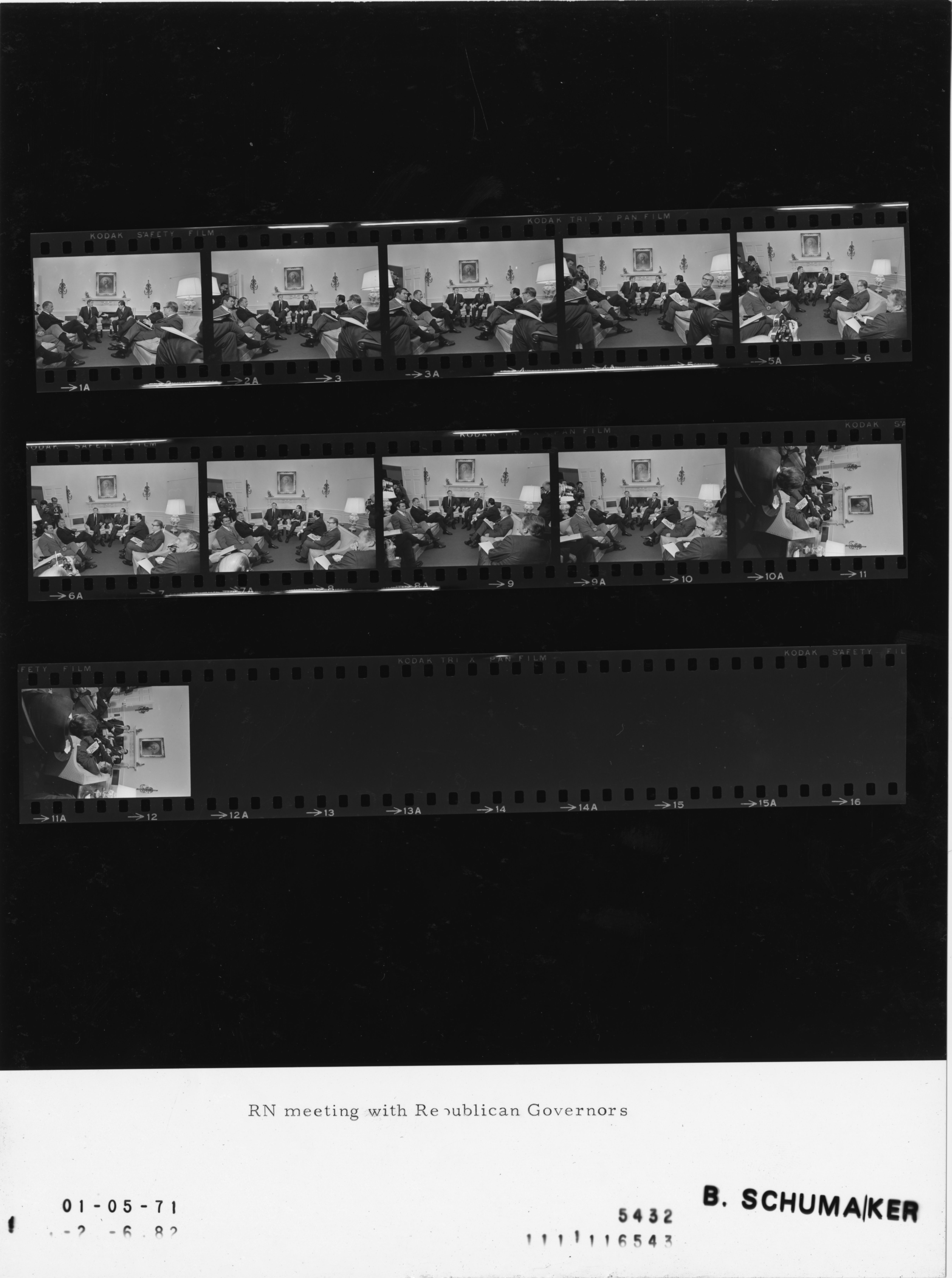 - Frame(s): WHPO-5432-01A-11A, President Nixon seated in the Oval Office during a meeting Republican Governors that includes Vice President Agnew, Governor Nelson Rockefeller, Governor Raymond Shafer, Governor Louie Nunn, Director of the OMB George P. Shultz, John D. Ehrlichman, Donald Rumsfeld, Special Assistant Edward Harper, Vice President Agnew's Assistant C.D. Ward and William L. Safire. 1/5/1971, Washington, D.C. White House, Oval Office. President Nixon, Nelson Rockefeller, Vice President Agnew, Governor Nelson Rockefeller, Raymond Shafer, Louie Nunn, George P. Shultz, John D. Ehrlichman, Donald Rumsfeld, Edward Harper, C.D. Ward, William L. Safire.