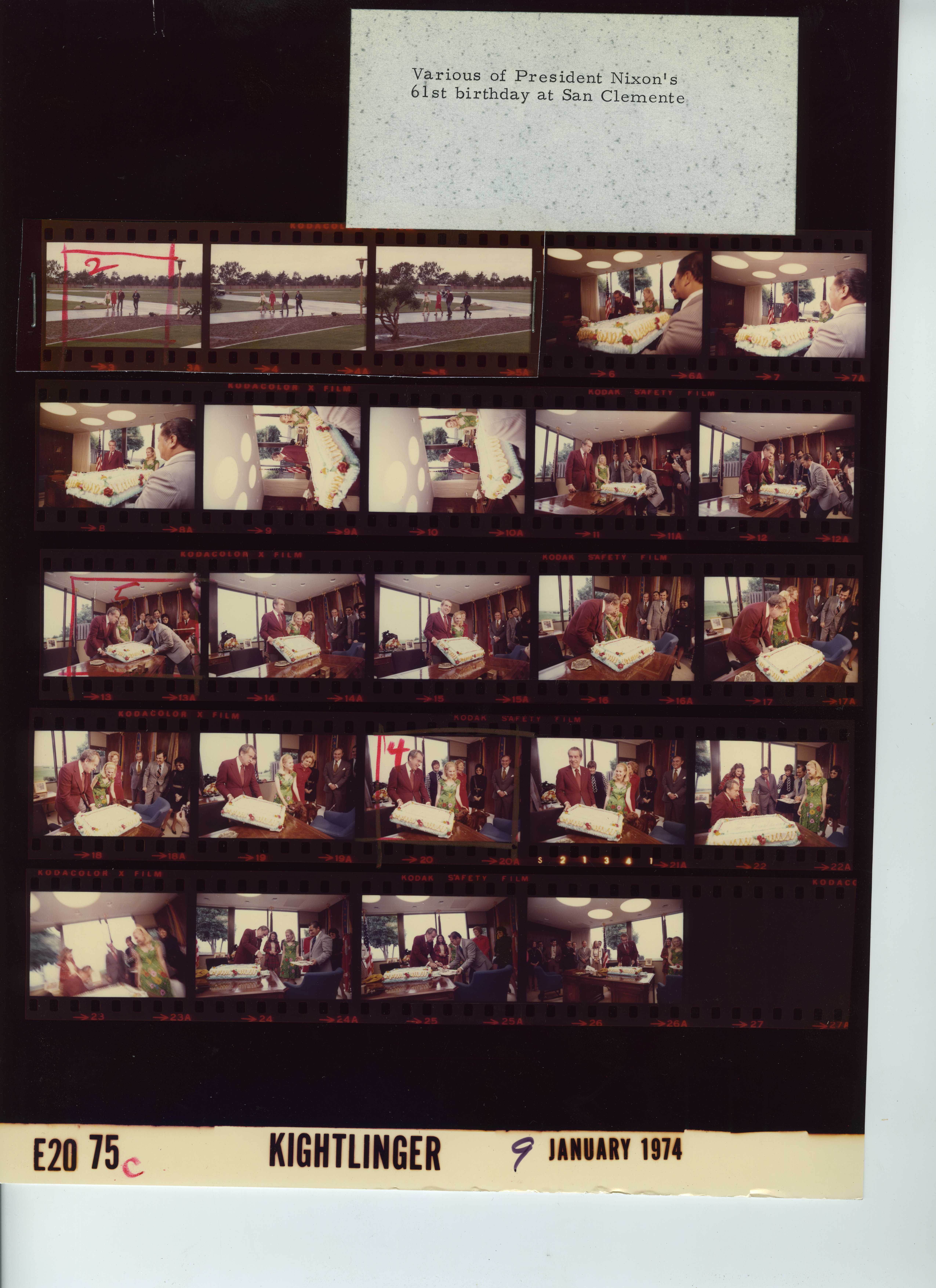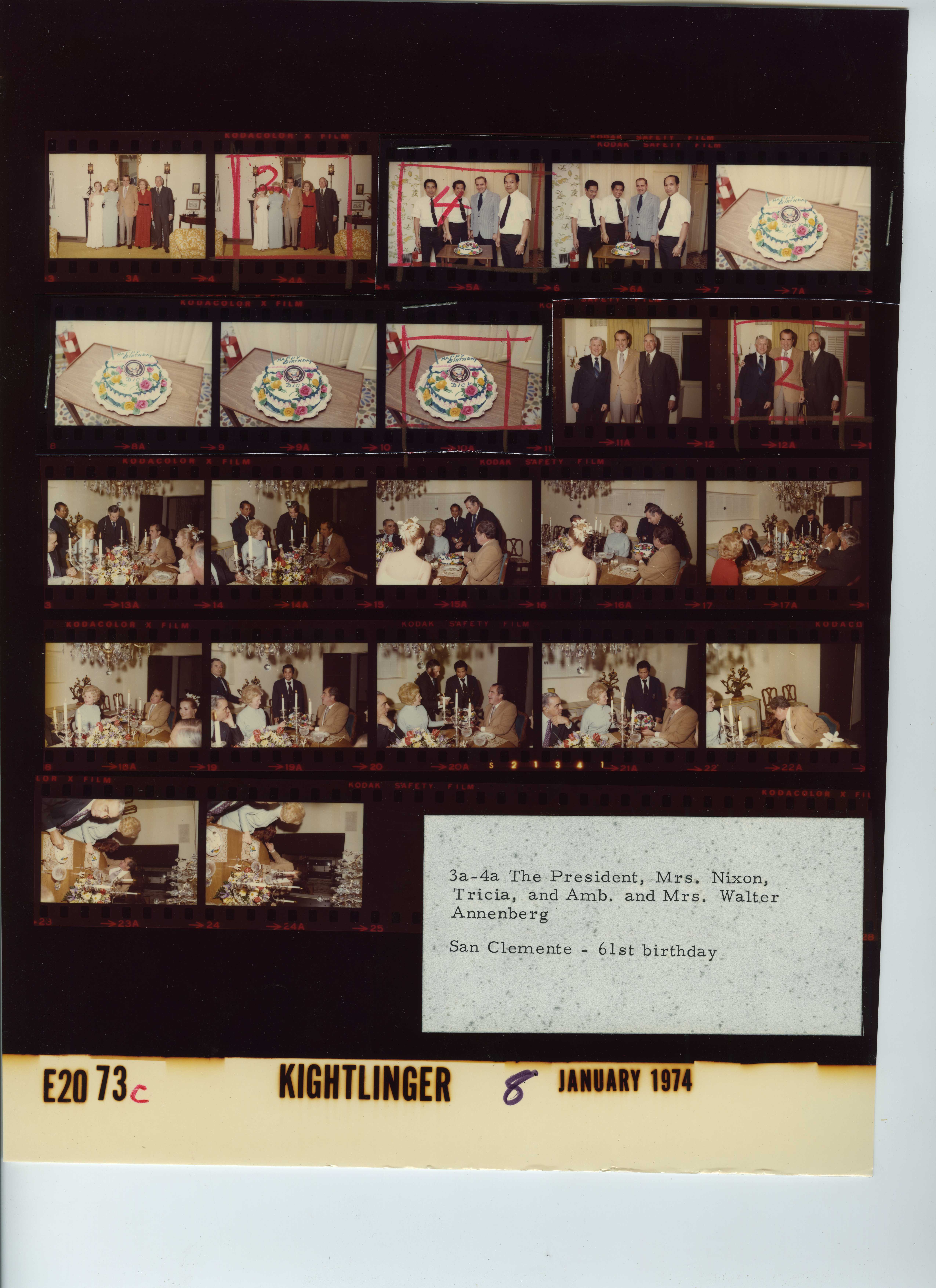 - Frame(s): WHPO-E2073-10A, President Nixon's 61st birthday cake for his celebration dinner with Pat Nixon, Tricia Nixon, Ambassador and Mrs. Walter Annenberg and other guests. 1/9/1974, San Clemente, California Western White House Casa Pacifica. President Nixon, Pat Nixon, Tricia Nixon, Ambassador Walter Annenberg, Mrs. Annenberg, Charles Bebe Rebozo, Presidential valet Manolo Sanchez, assistant chef.