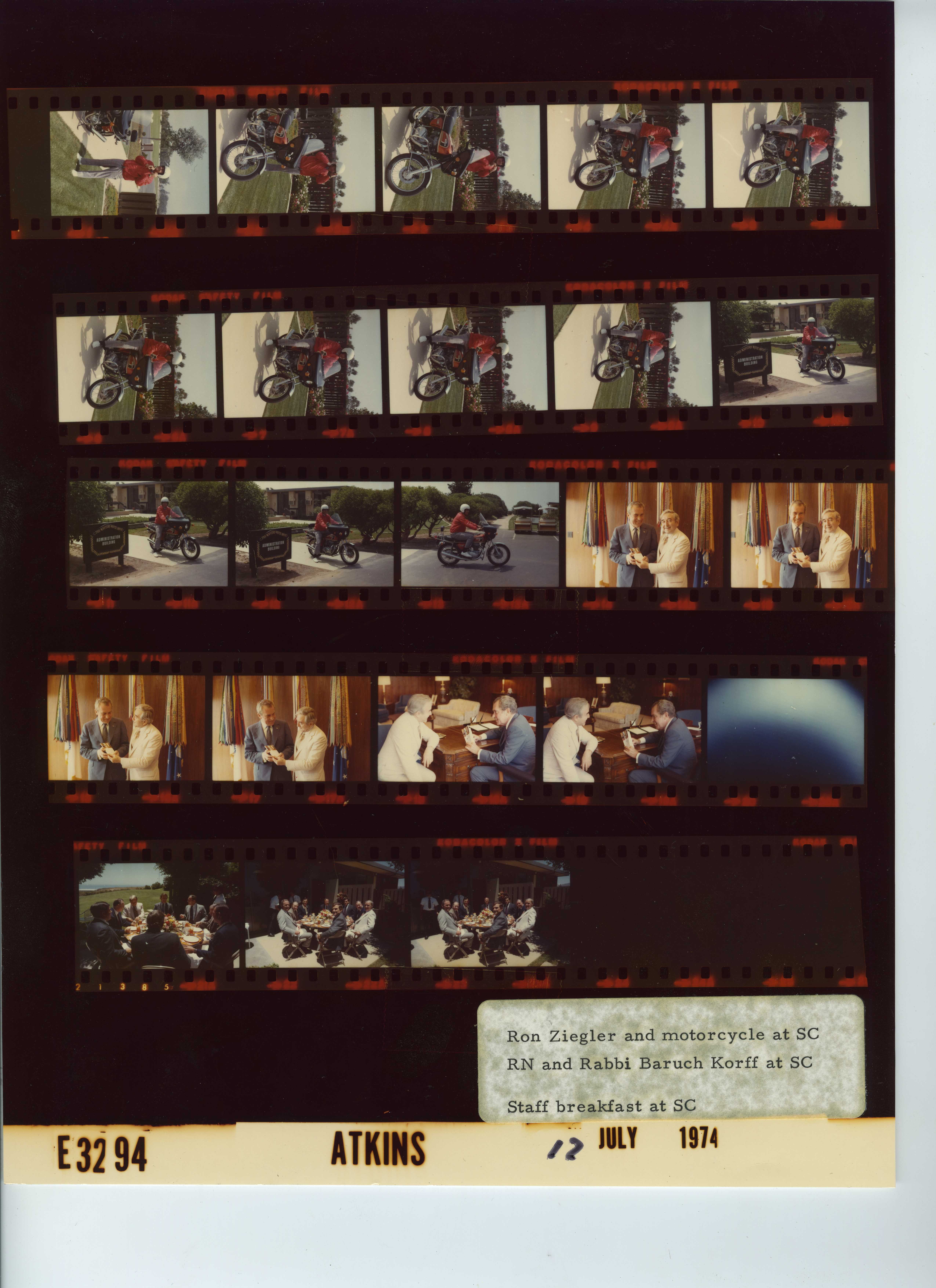 - Frame(s): WHPO-E3294-01-13, Ron Ziegler riding his Honda motorcycle by "The Western White House Administration Building" sign. 7/17/1974, San Clemente, California La Casa Pacifica. Ron Ziegler.