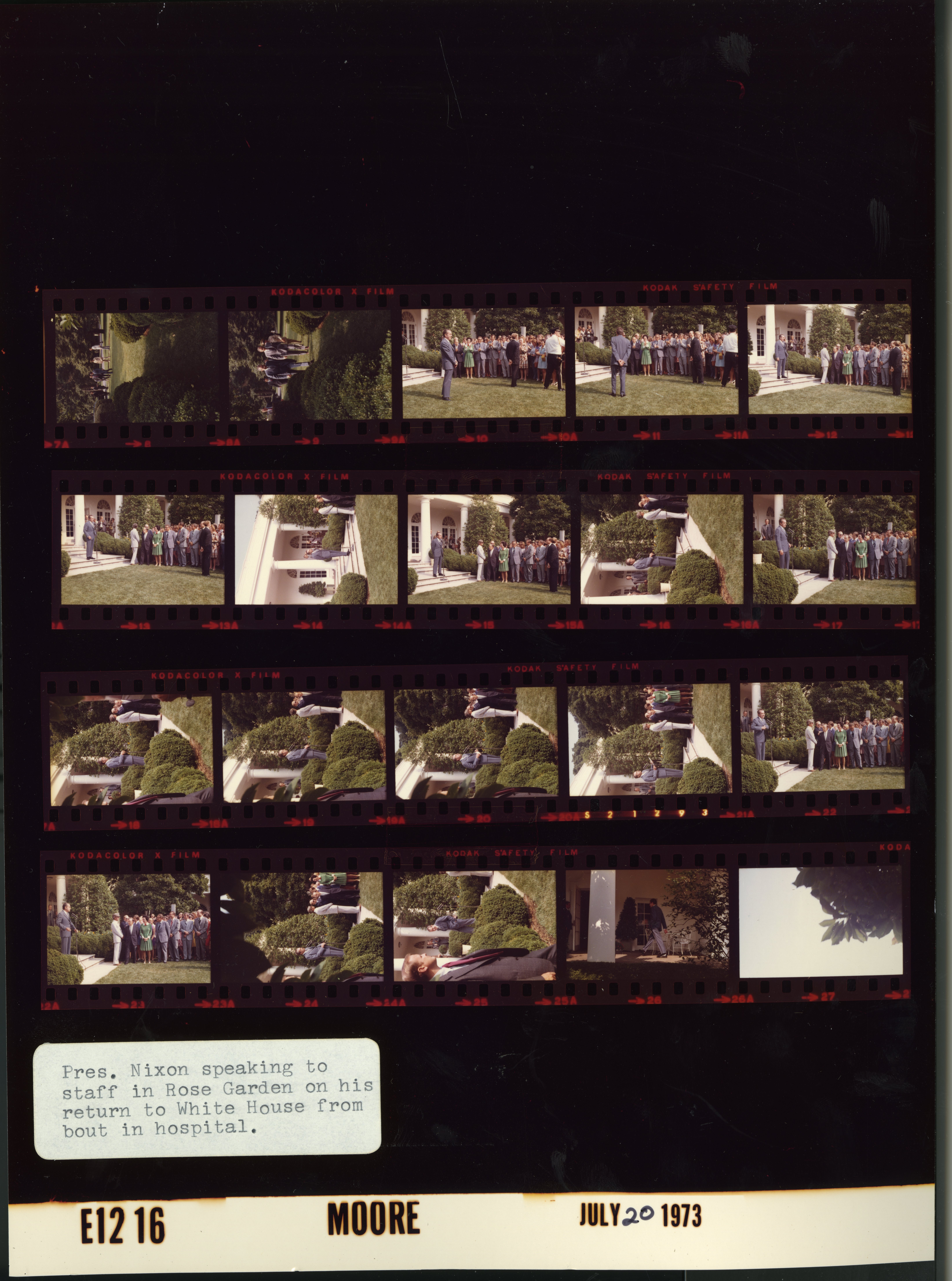 - Frame(s): WHPO-E1216-10, President Nixon speaking to the White House staff members, gathered in the White House Rose Garden, after returning from the hospital due to contracting pneumonia. 7/20/1973, Washington, D.C. Rose Garden, Whtie House. President Nixon, Henry Kissinger, Anne Armstrong, Rose Mary Woods, crowd, unidentified staff.