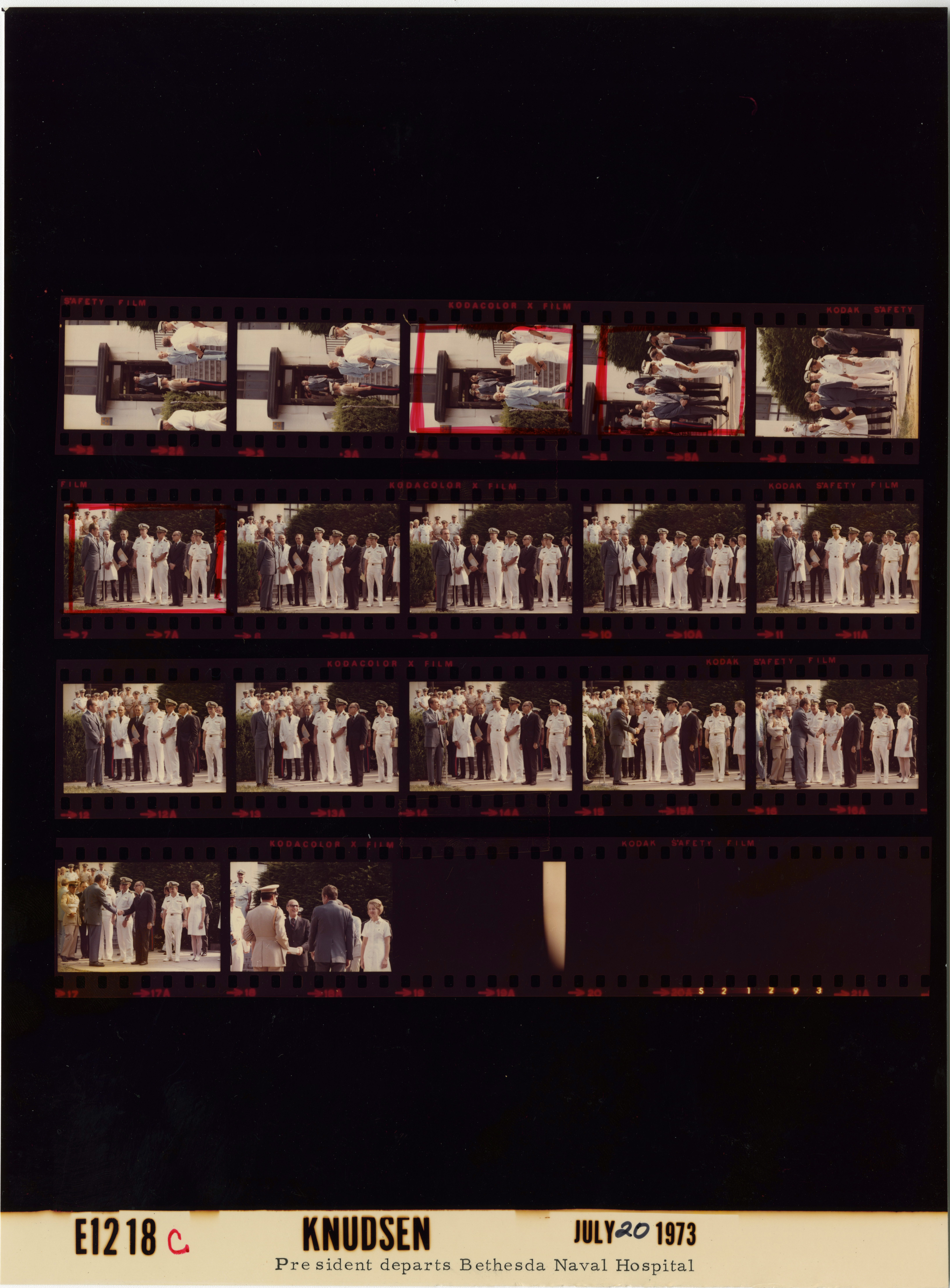 - Frame(s): WHPO-E1217-09A, President Nixon shaking hands with naval officers before departing the National Naval Medical Center Bethesda (NNMC Bethesda). 7/20/1973, Maryland National Naval Medical Center Bethesda (NNMC Bethesda). President Nixon, doctors, nurses, naval officers, Walter R. Tkach, unidentified persons.