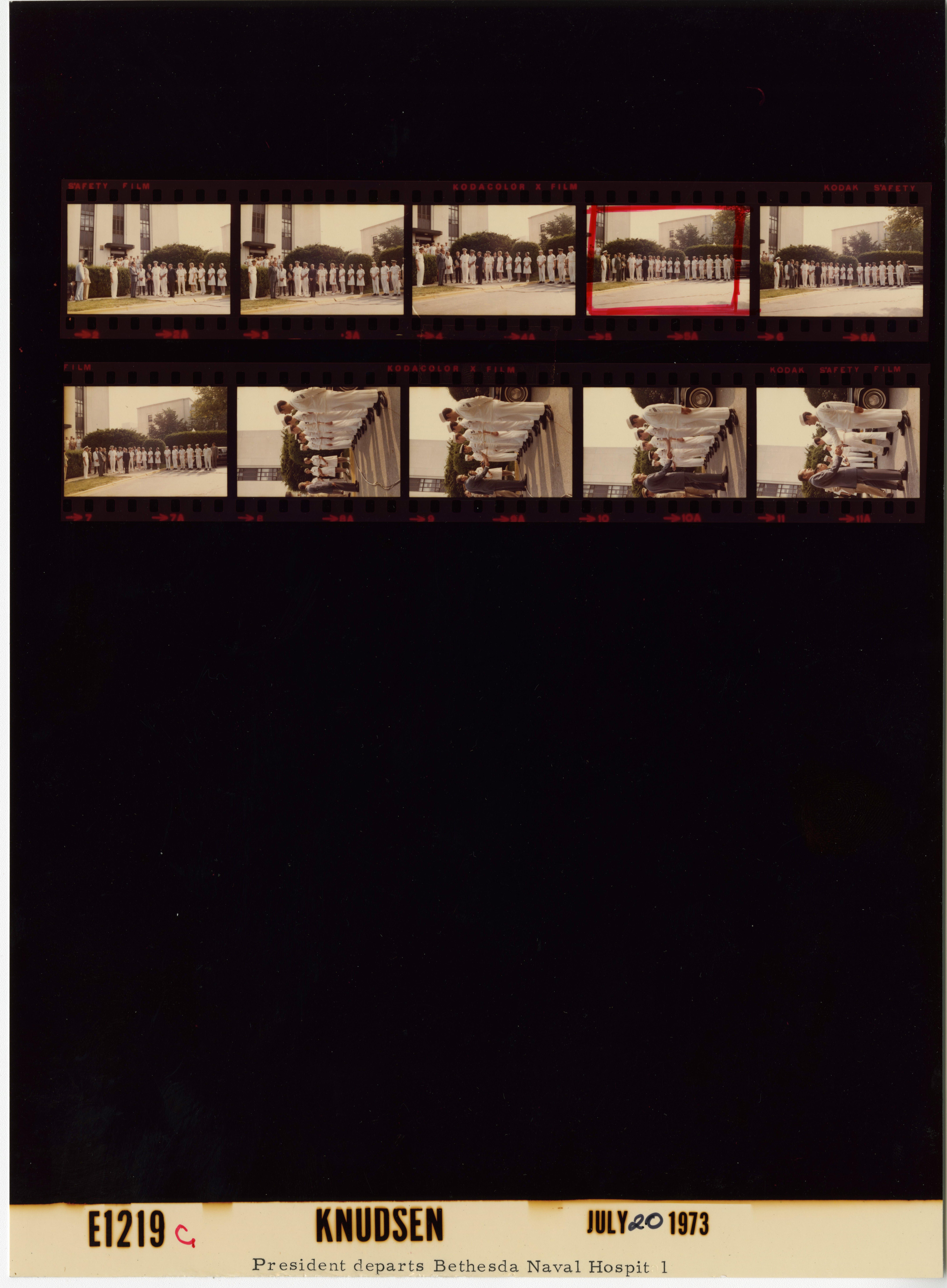 - Frame(s): WHPO-E1219-, President Nixon departing Bethesda Naval Hospital. 7/20/1973, Maryland National Naval Medical Center Bethesda (NNMC Bethesda). President Nixon, Walter R. Tkach, doctors, nurses, hospital staff, naval officers, unidentified persons.