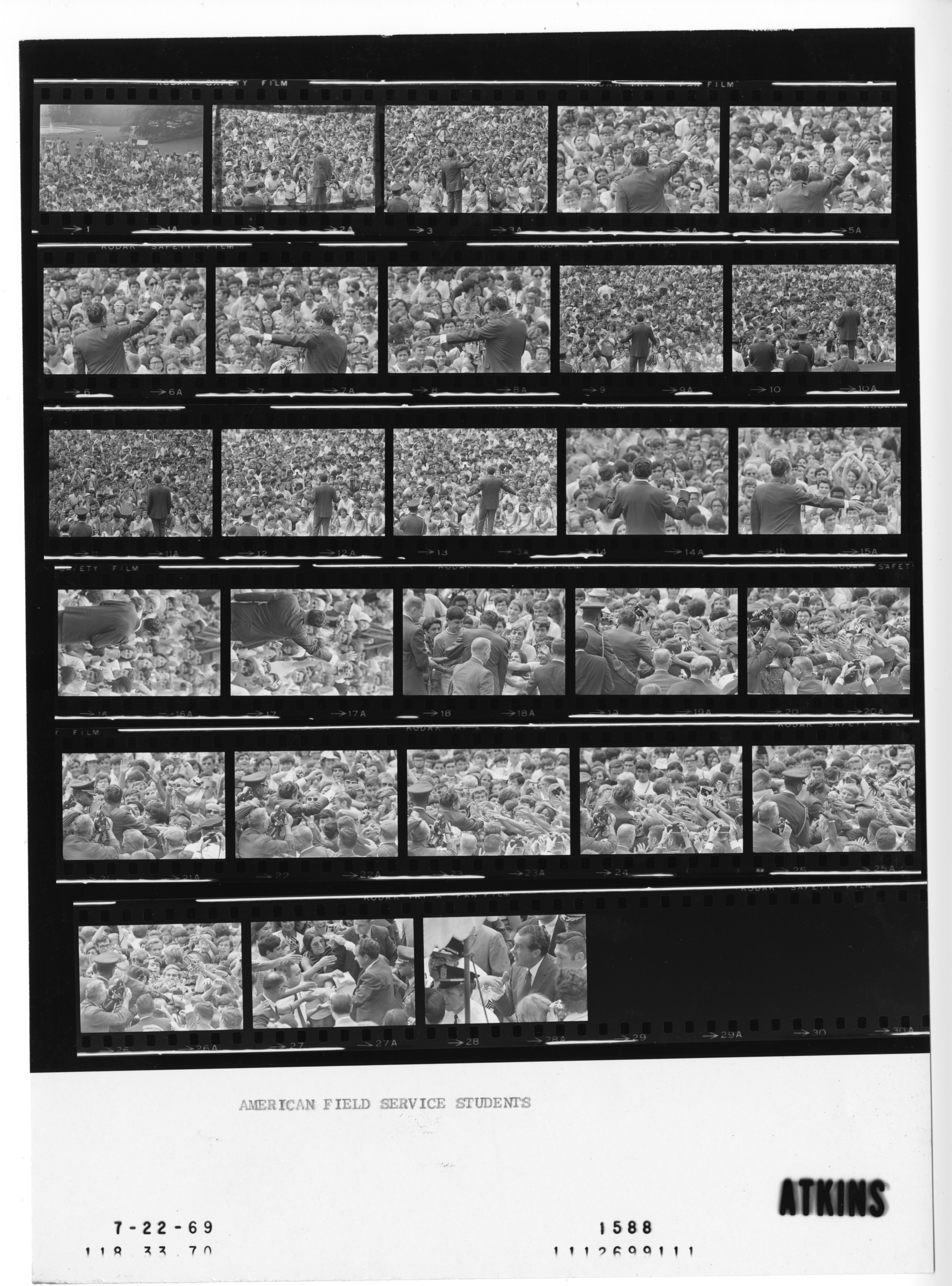 - Frame(s): WHPO-1588-02, President Nixon speaking to 3,040 American Field Service (AFS) students from sixty countries (while most take pictures of him using various types of cameras) gathered on the White House South Lawn. Viewed from behind President Nixon facing the students. 7/22/1969, Washington, D.C. White House, South Lawn. President Nixon, unidentified students.