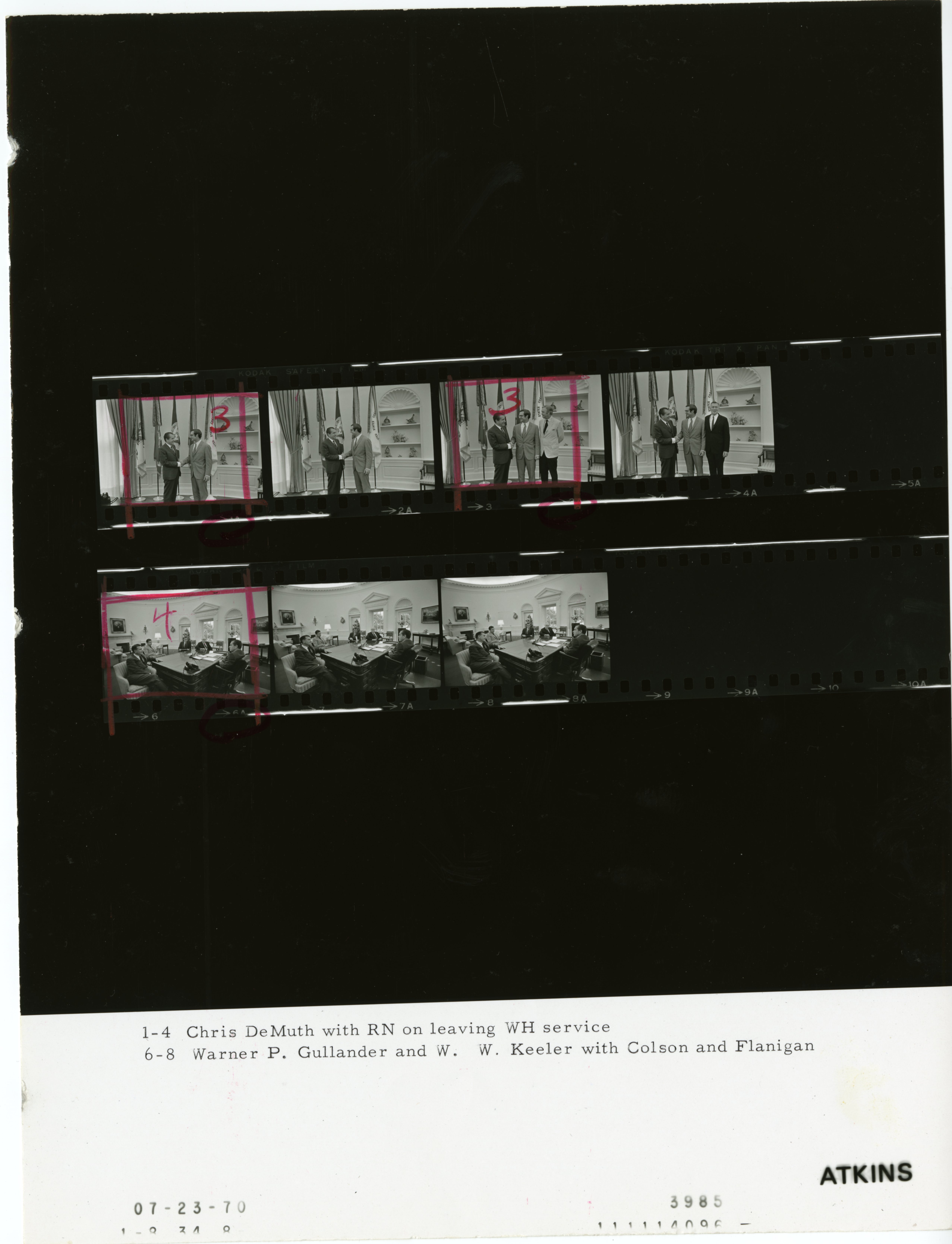 - Frame(s): WHPO-3985-06-08, President Nixon seated at his Oval office desk during a meeting with the President of the National Association of Manufacturers Warner P. Gullander, Deputy Assistant Kenneth E. Belieu, Special Counsel Charles W. Colson, and Chairman of the Nat'l Assoc. of Manufacturers W.W. Keeler. 7/23/1970, Washington, D.C. White House, Oval Office. President Nixon, Charles W. Colson, Warner P. Gullander, W.W. Keeler, Kenneth E. Belieu, Presidential Assistant Peter M. Flanigan noted on Contact Sheet by photographer, not noted in the Presidential daily diary as in attendance here).