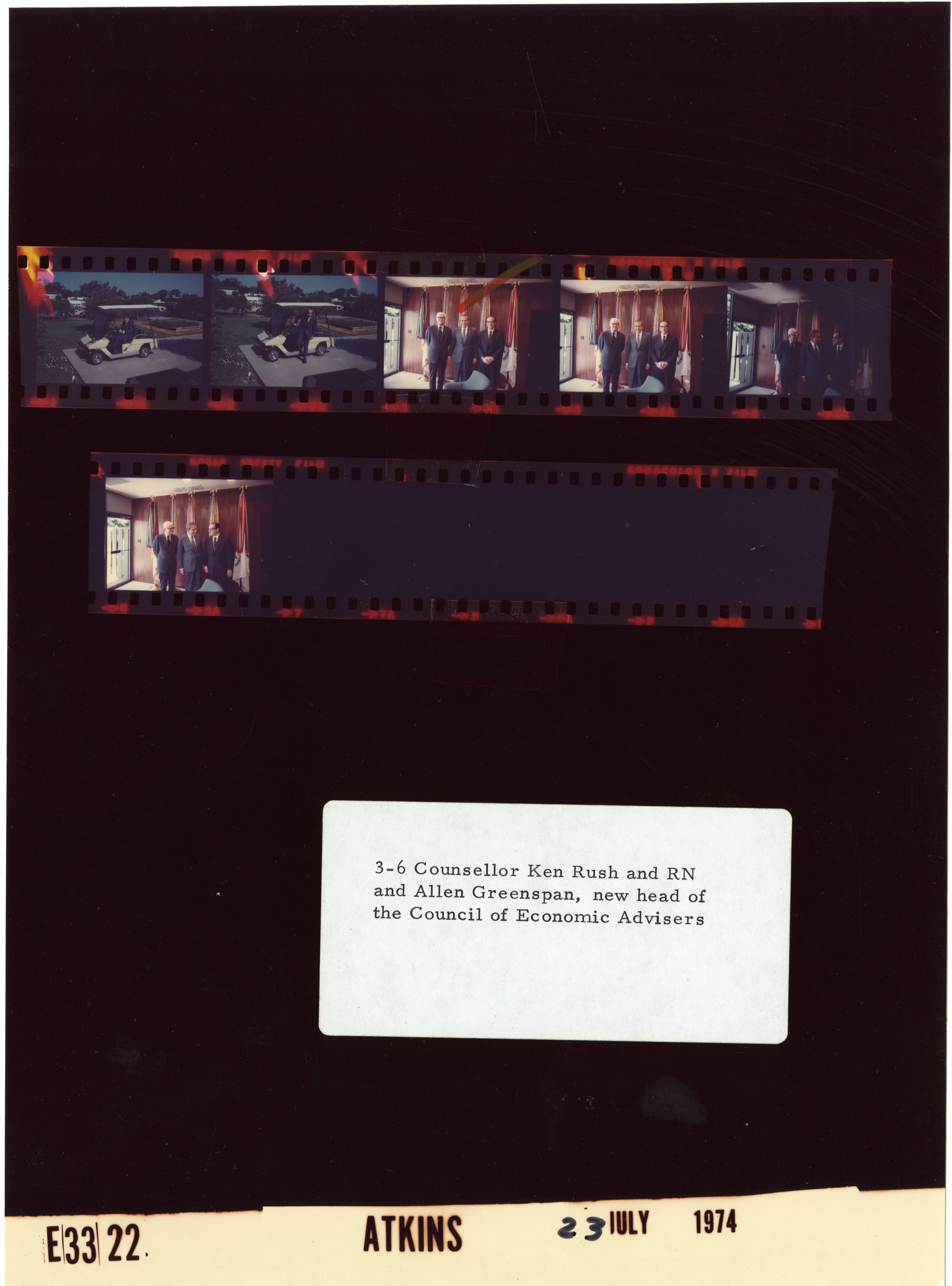- Frame(s): WHPO-E3306-03A-09A, President Nixon meeting with Counsellor Kenneth Rush, President Nixon, Chairman-designate of the Council of Economic Advisers Alan Greenspan. 7/23/1974, San Clemente, California La Casa Pacifica. L-R: Counsellor Kenneth Rush, President Nixon, Chairman-designate of the Council of Economic Advisers Alan Greenspan.