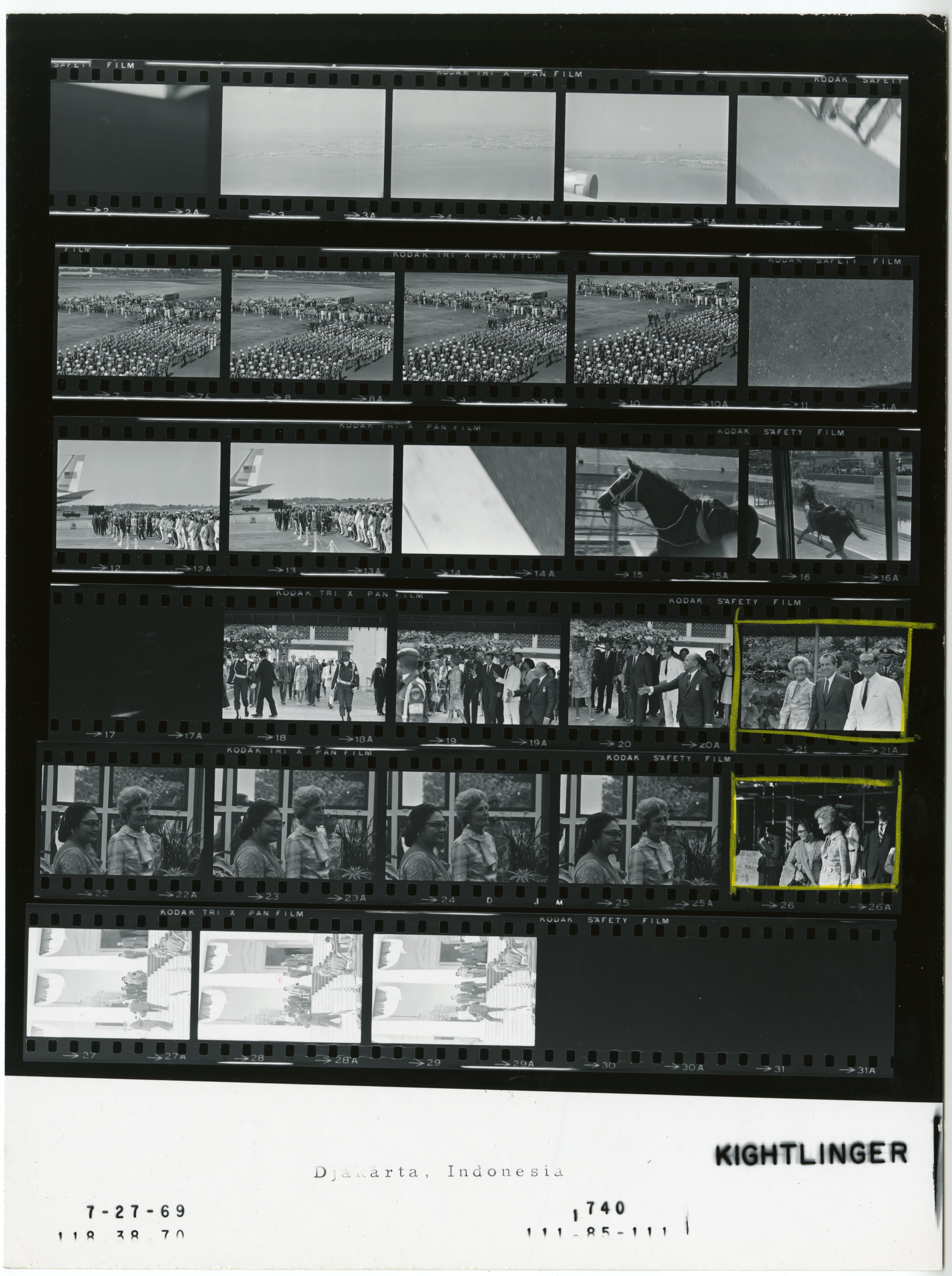 - Frame(s): WHPO-1741-21A-23A, President Nixon shaking hands with officials. 7/27/1969, Djakarta, Indonesia airport, tarmac. President Nixon, Pat Nixon, President Suharto, Mrs. Suharto, officials, honor guard.