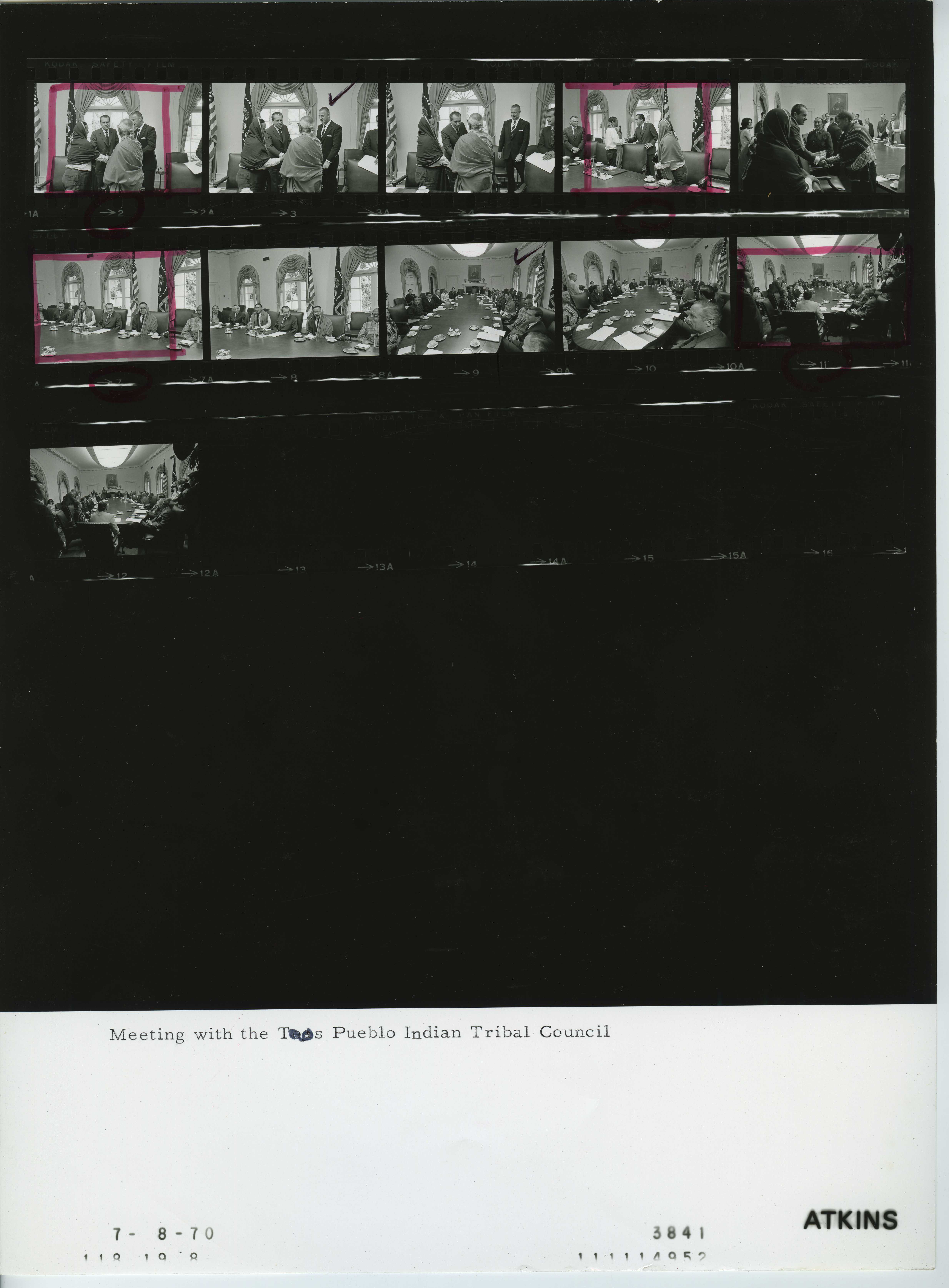 - Frame(s): WHPO-3841-06, President Nixon shaking hands and meeting with American Indian leaders of the Taos Pueblo Indian Tribal Council (Blue Lake). 7/8/1970, Washington, D.C. White House, Cabinet Room. President Nixon; Reported present in PDD: Taos Pueblo Governor Quirino Romero, Cacique Religious Leader Juan de Jesus Romero (90 yrs old), Paul Bernal (Tribal Council Secretary & Interpreter), James Mirabal (Senior Councilman), John Marcus, Manuel Reyna, Cruz Trujillo, Gilvert Suazo, Earl Old Person (President National Congress of American Indians, new NCIO member), John Rainer (Vice President National Congress of American Indians, new NCIO member).