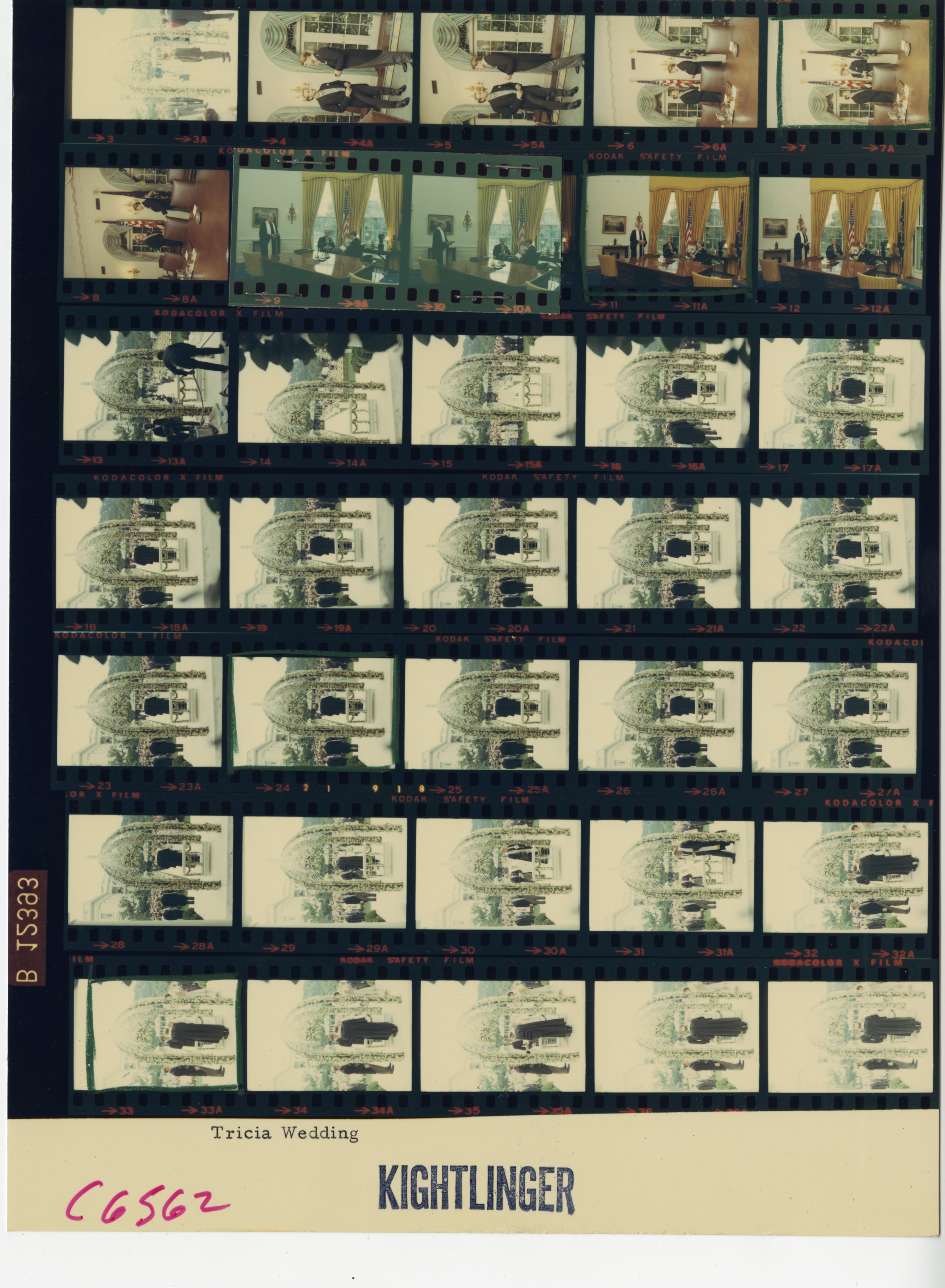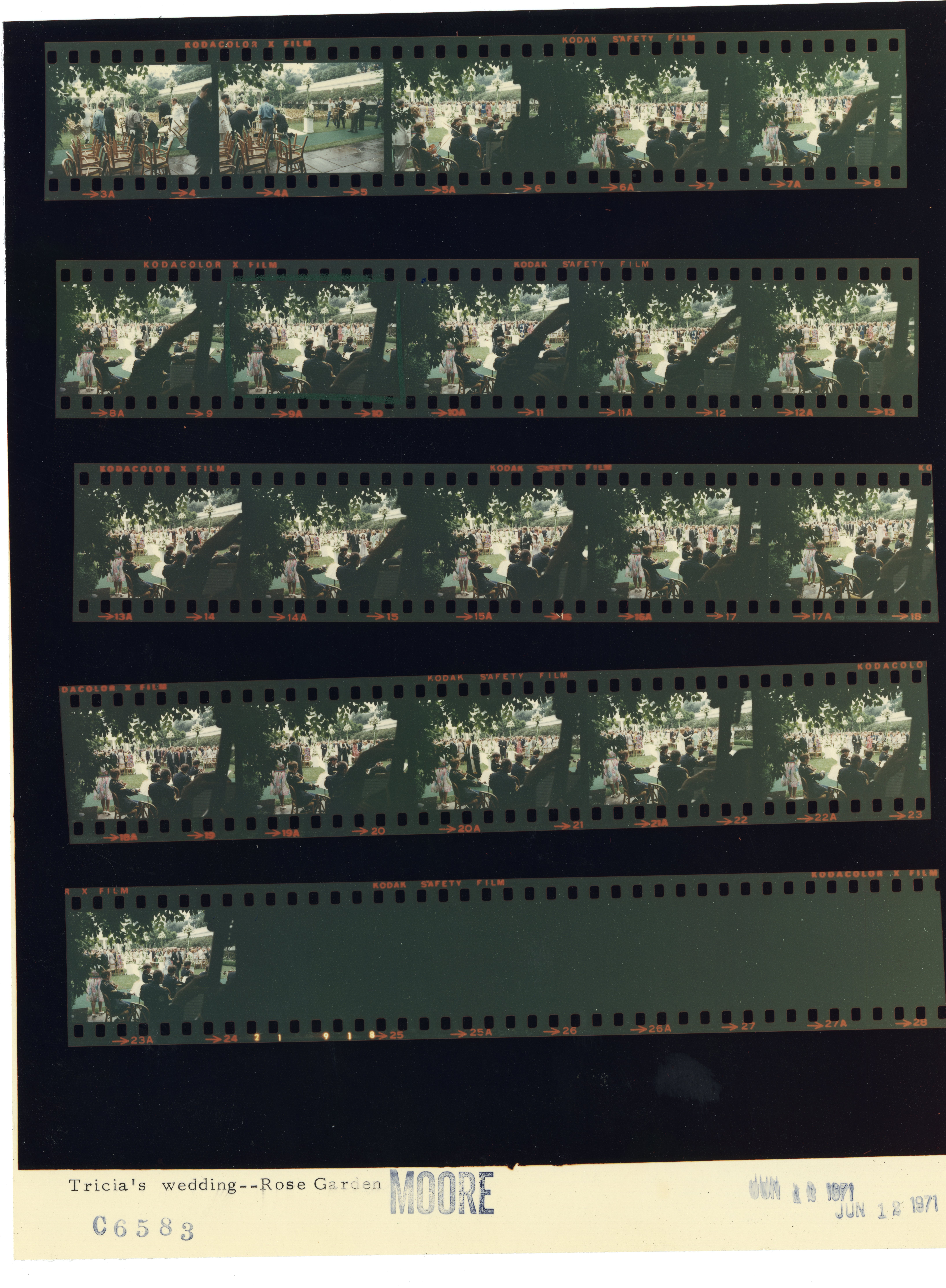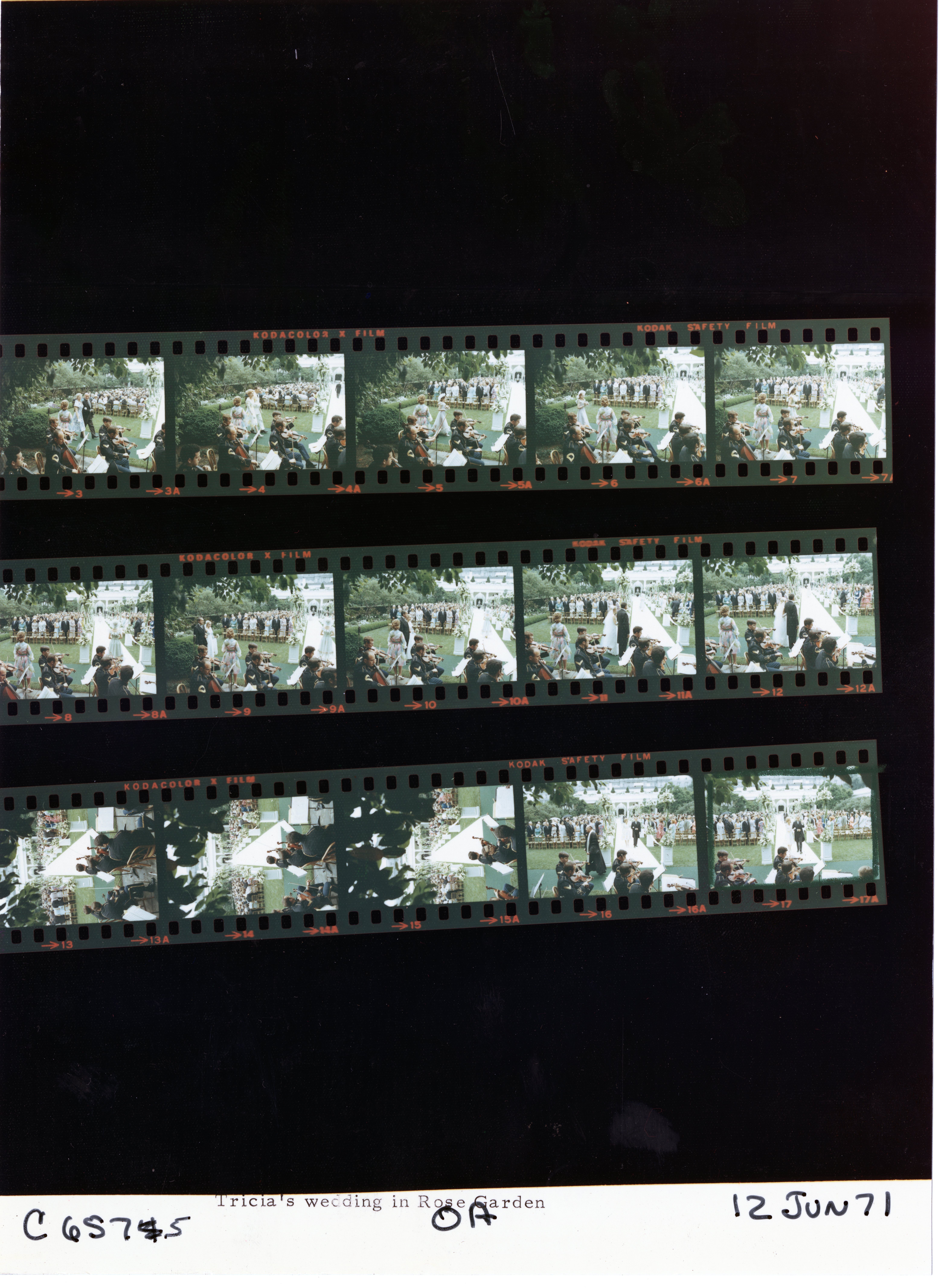 - Frame(s): WHPO-6562-28, President Nixon and Tricia Nixon walk down the aisle during the wedding ceremony for Tricia Nixon and Ed Cox. View is from behind the Rev. Edward Latch. 6/12/1971, Washington, D.C. White House, Rose Garden. President Nixon, Tricia Nixon, Edward Latch, guests.