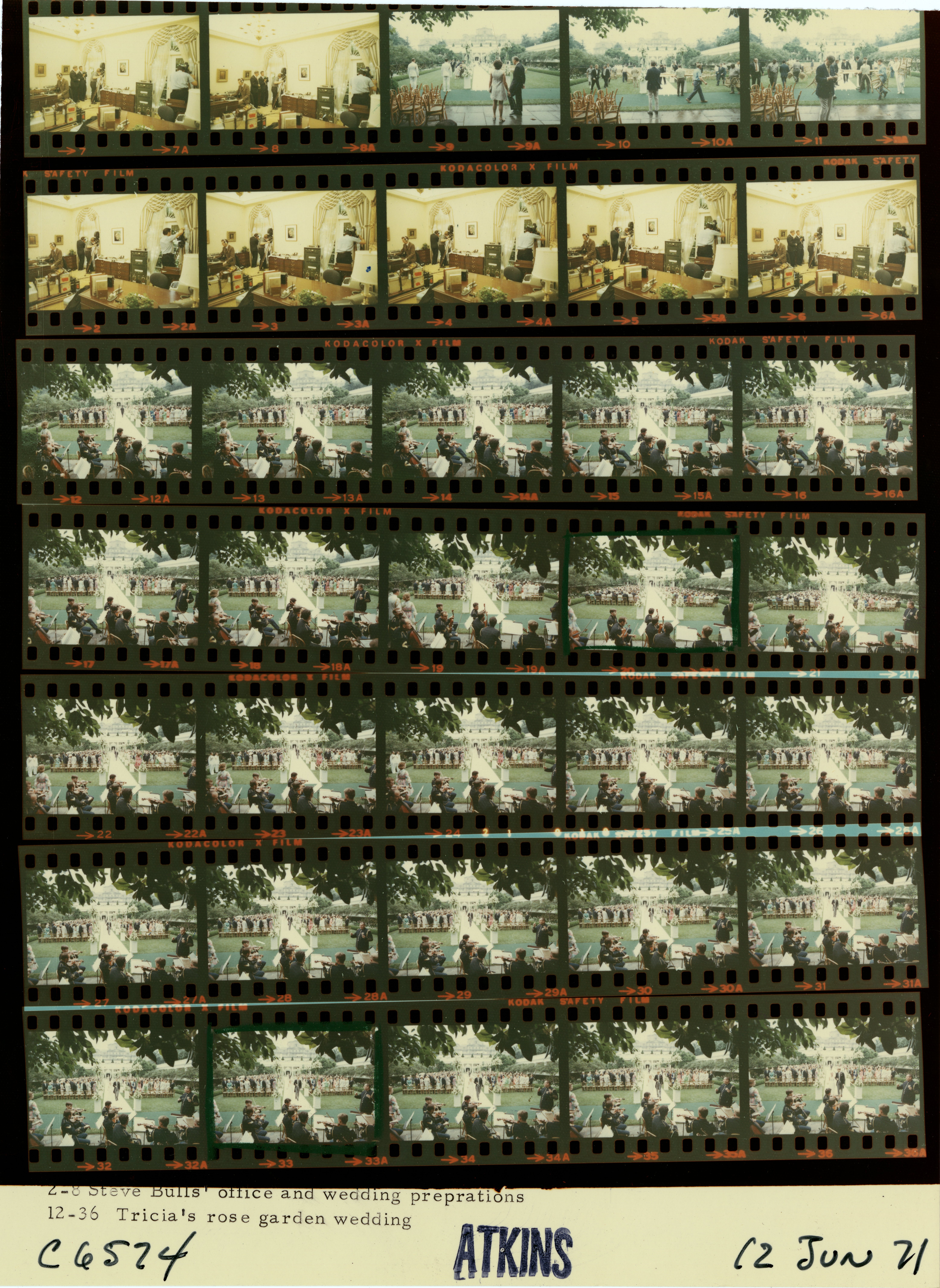 - Frame(s): WHPO-6593-13-26, President Nixon, Pat Nixon and other wedding party members dancing. 6/12/1971, Washington, D.C. White House, East Room. Ed Cox, Tricia Nixon Cox, President Nixon, Pat Nixon, bridal party members, guests.